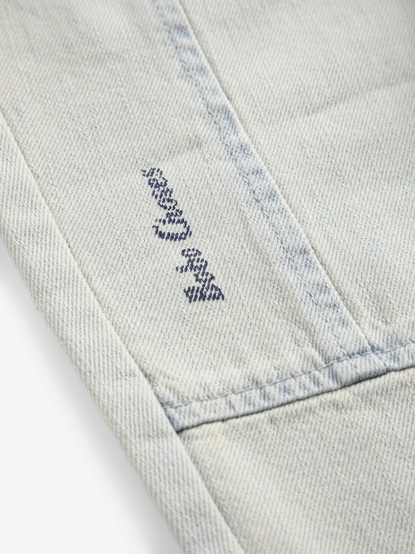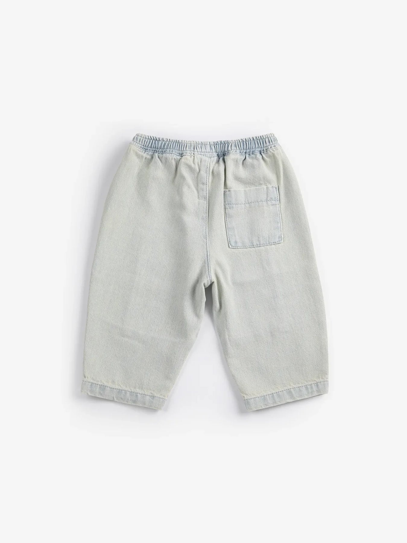 Light blue pants. Designed with elasticated waistband, embroidery, baggy fit, adjustable drawstring, ankle length, patch pocket and denim.
