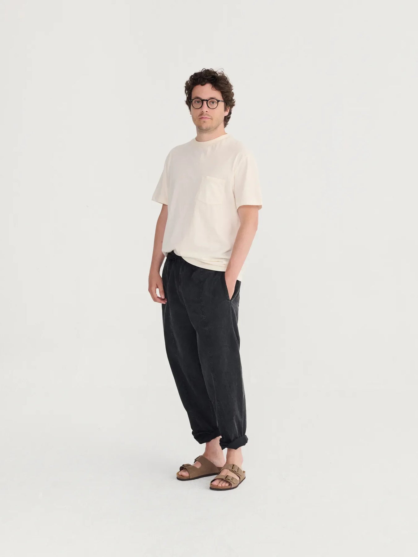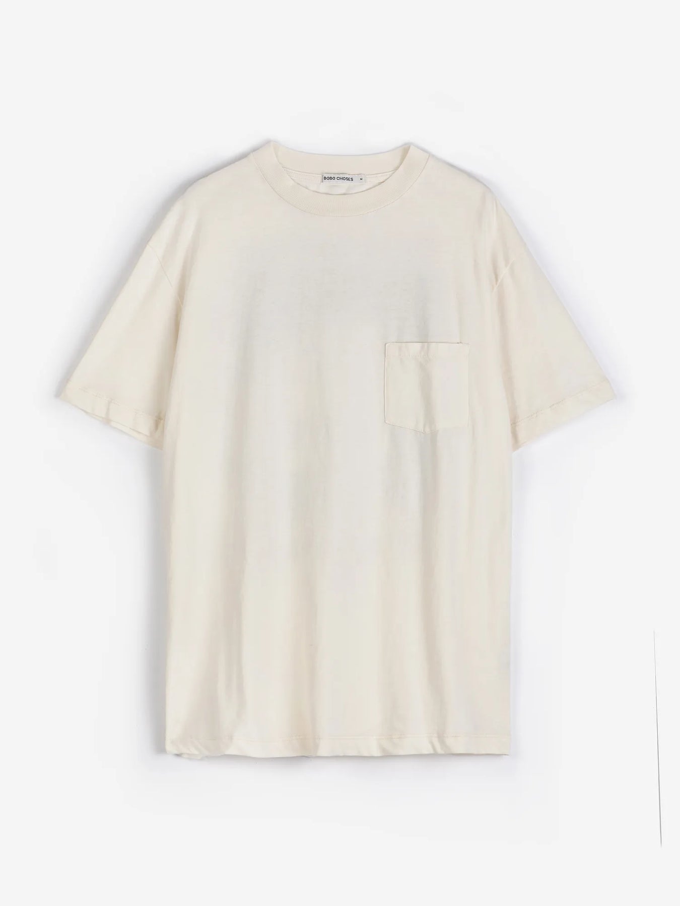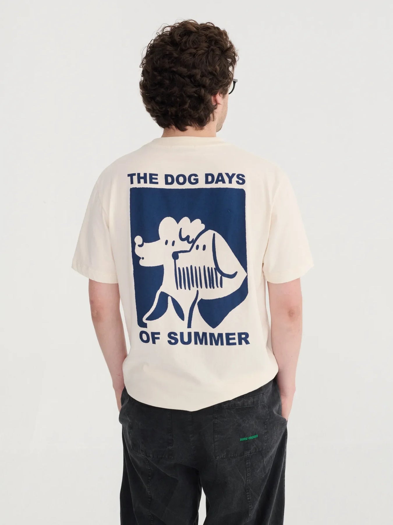 A soft off-white unisex cotton tee with a relaxed fit, classic crew neckline, and chest pocket at the front. The back features a bold navy “The Dog Days of Summer” graphic with an oversized illustrated pup. Easy, breathable, and made for long, sun-soaked days.