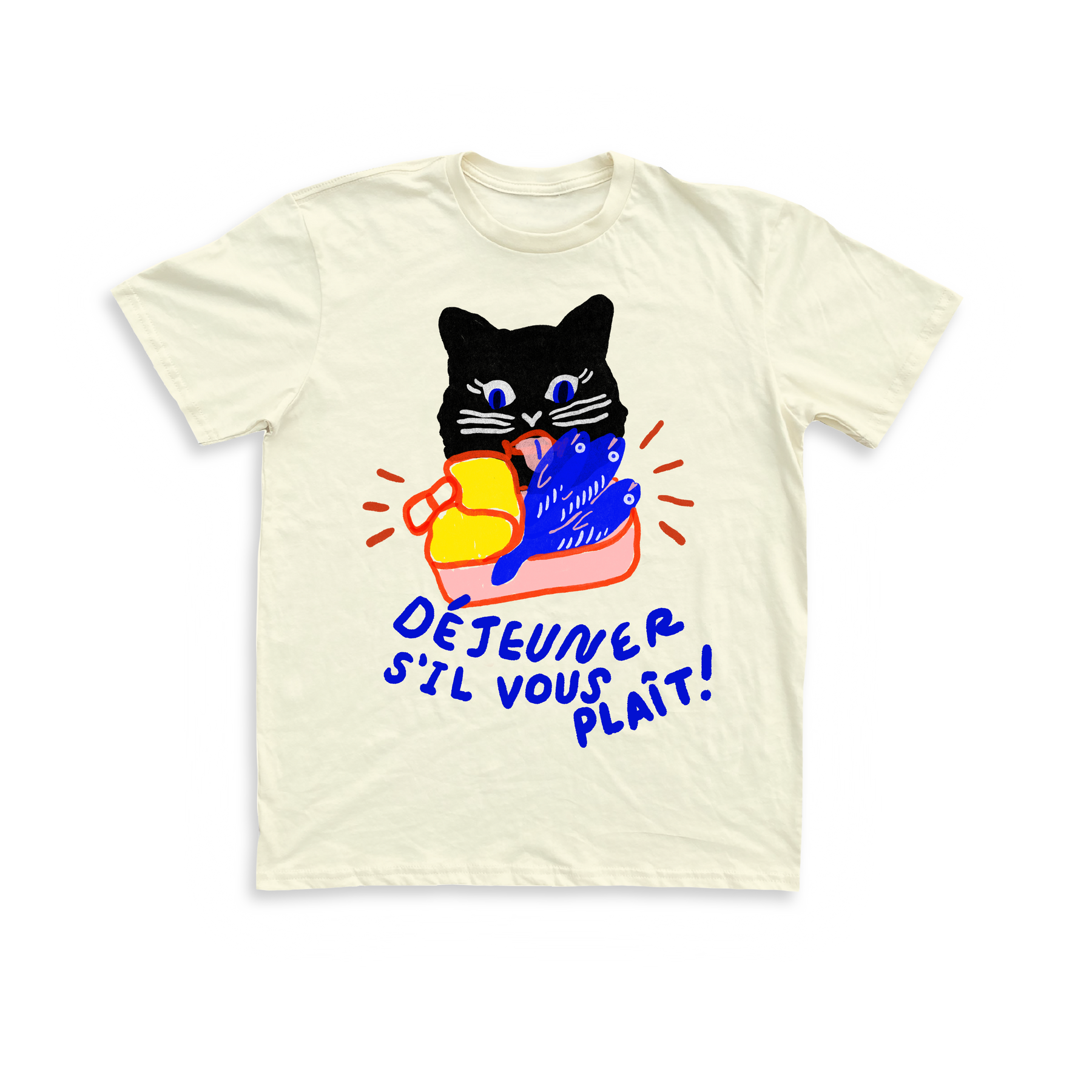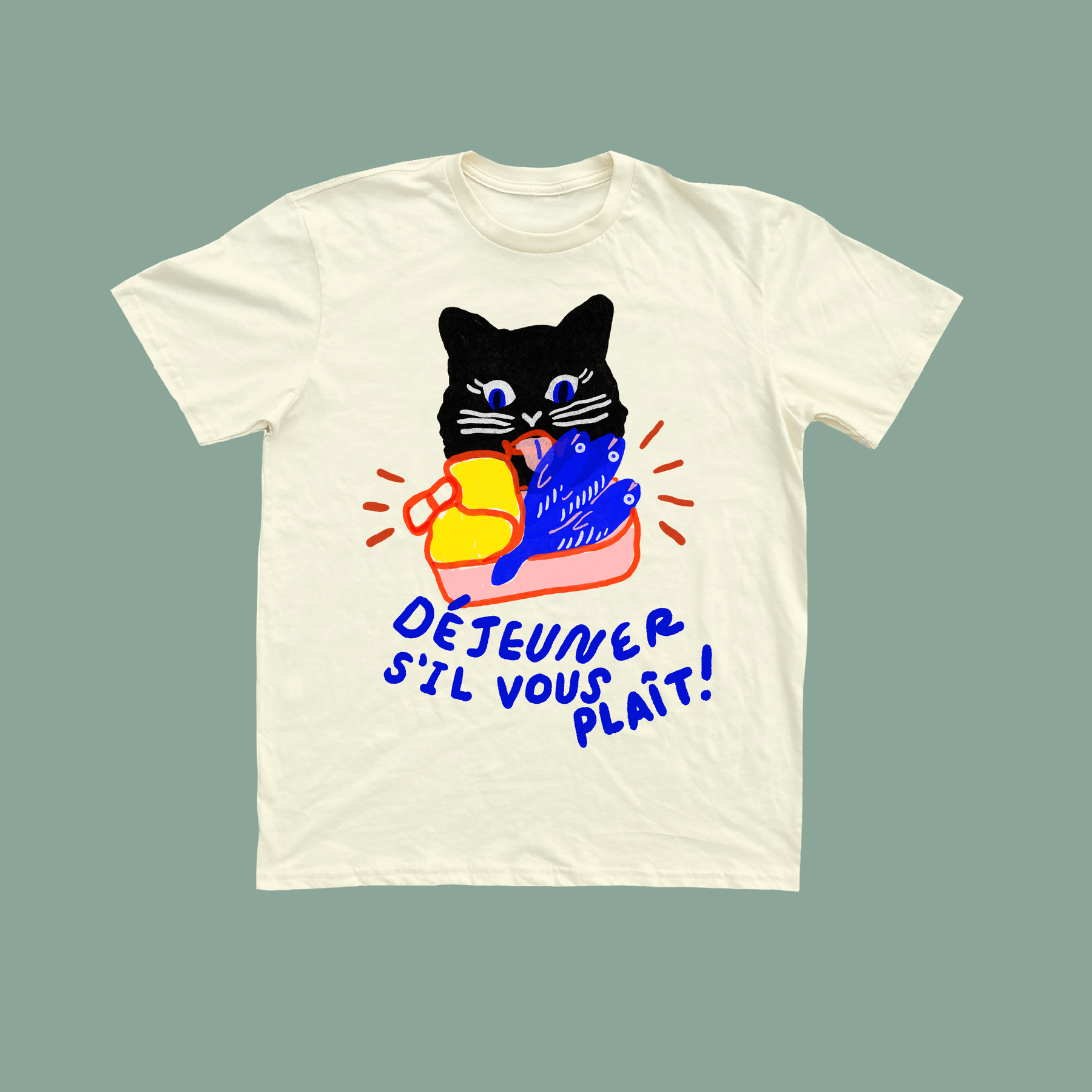Lunch please- (written in French) features an exquisite black cat licking its lips over a can of tinned fish. This tee is honoring all things lunch related. Super soft, silky cotton, effortless tee goes with everything.