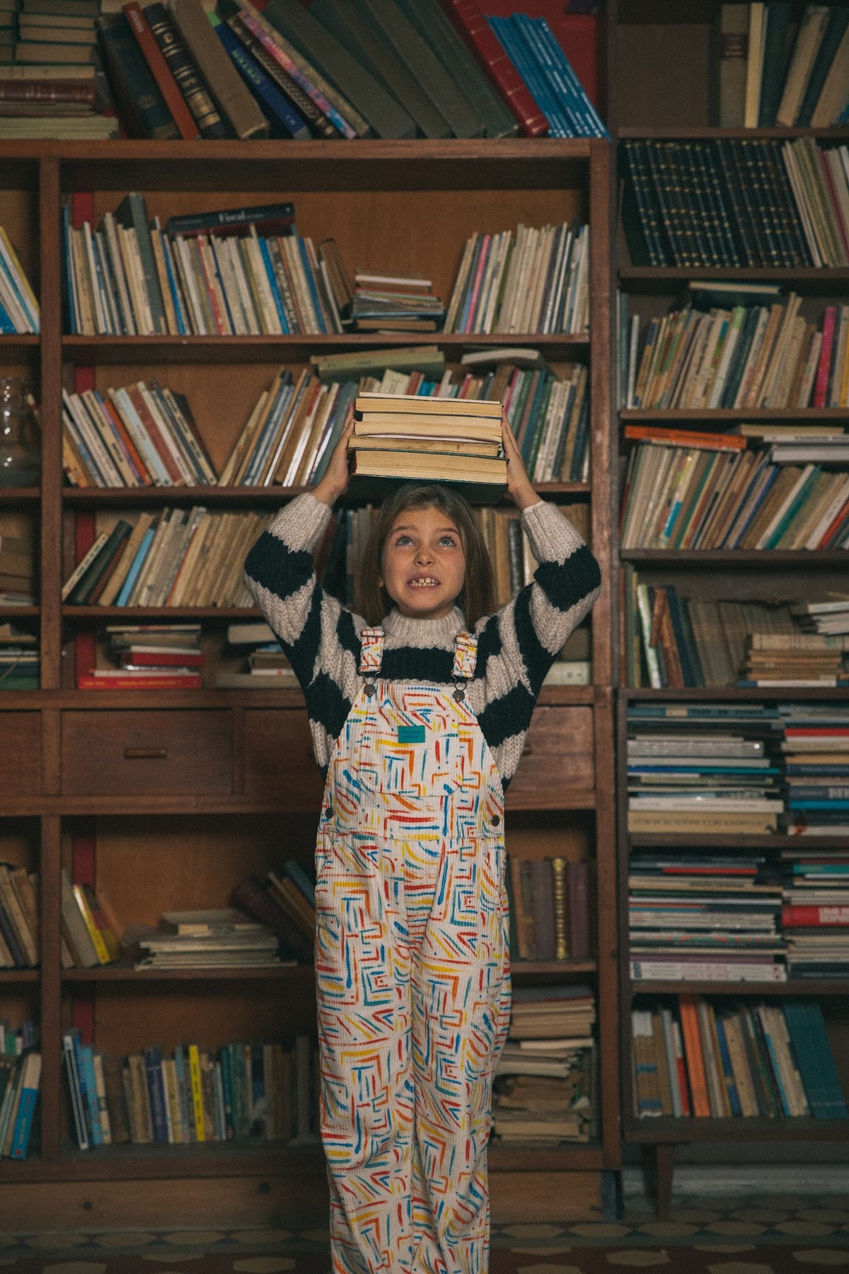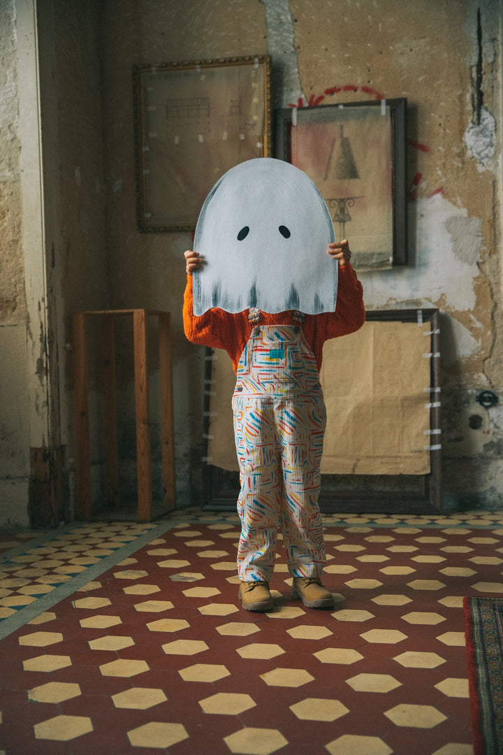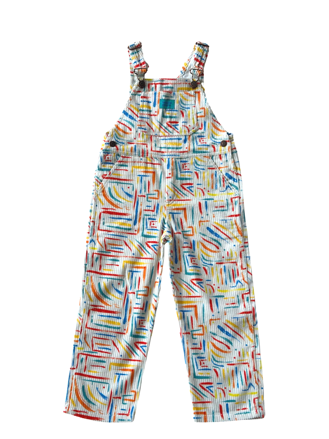 Long bombazine overalls with colorful print, a straight neckline and adjustable straps with dungarees closure. Combined pockets on the front, kangaroo-style on the bib and patch pocket on the back. Closure with buttons on the sides. 100% cotton