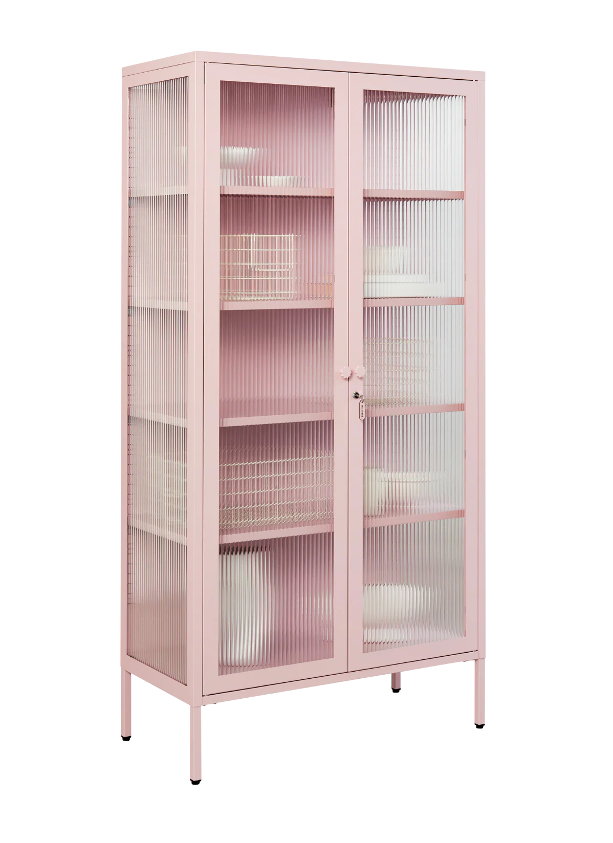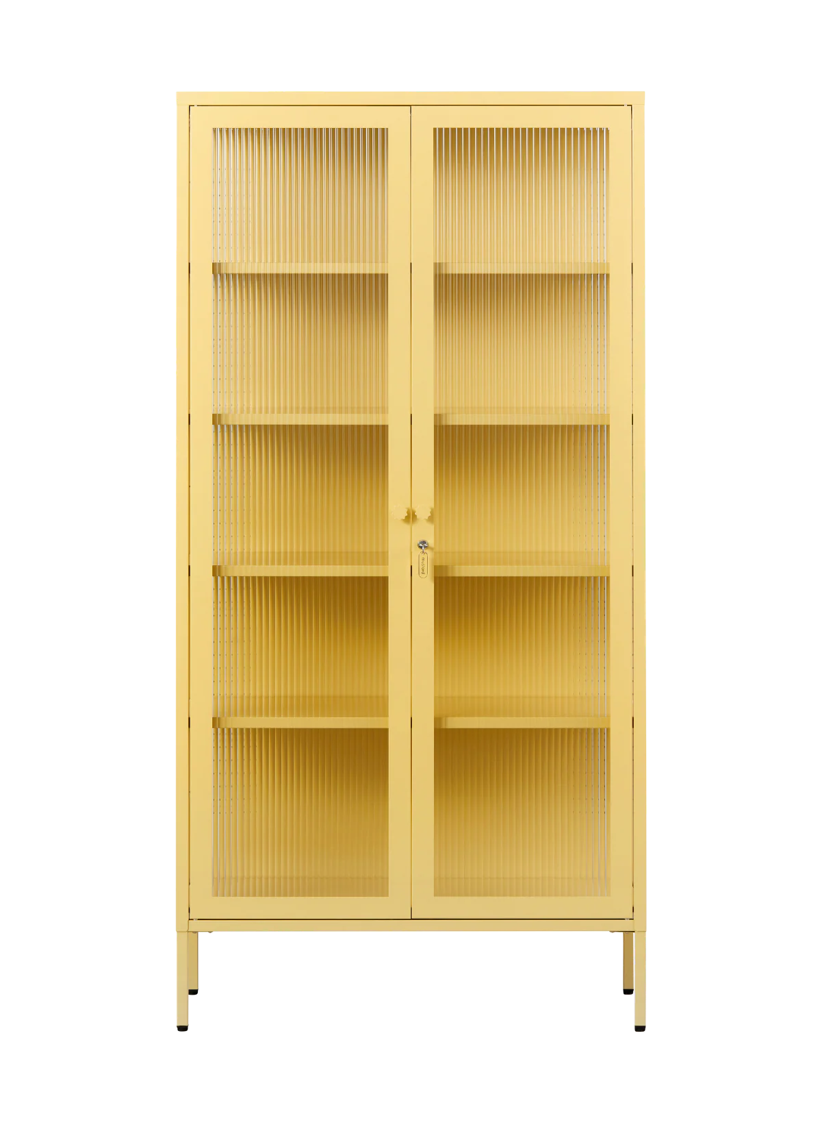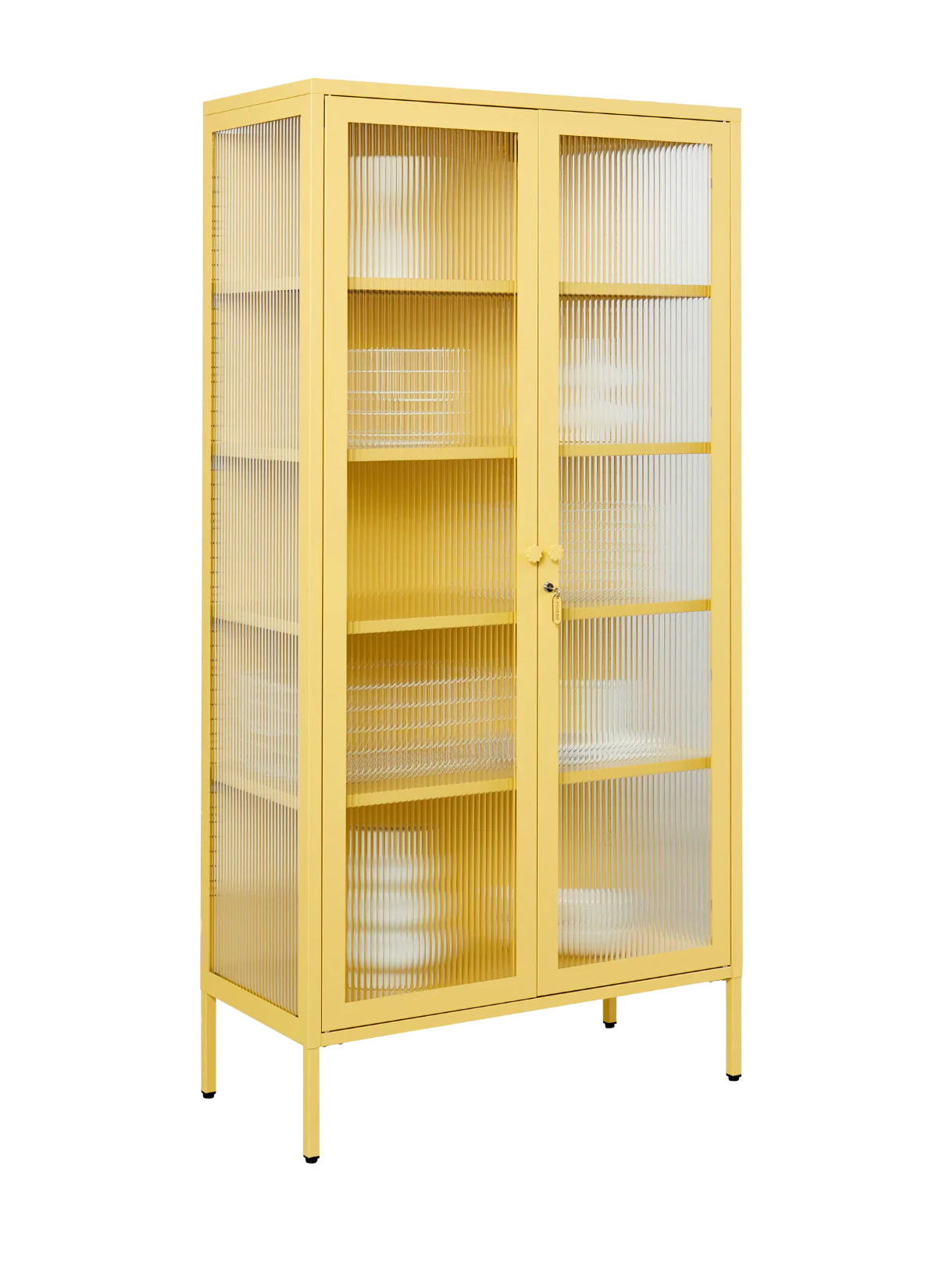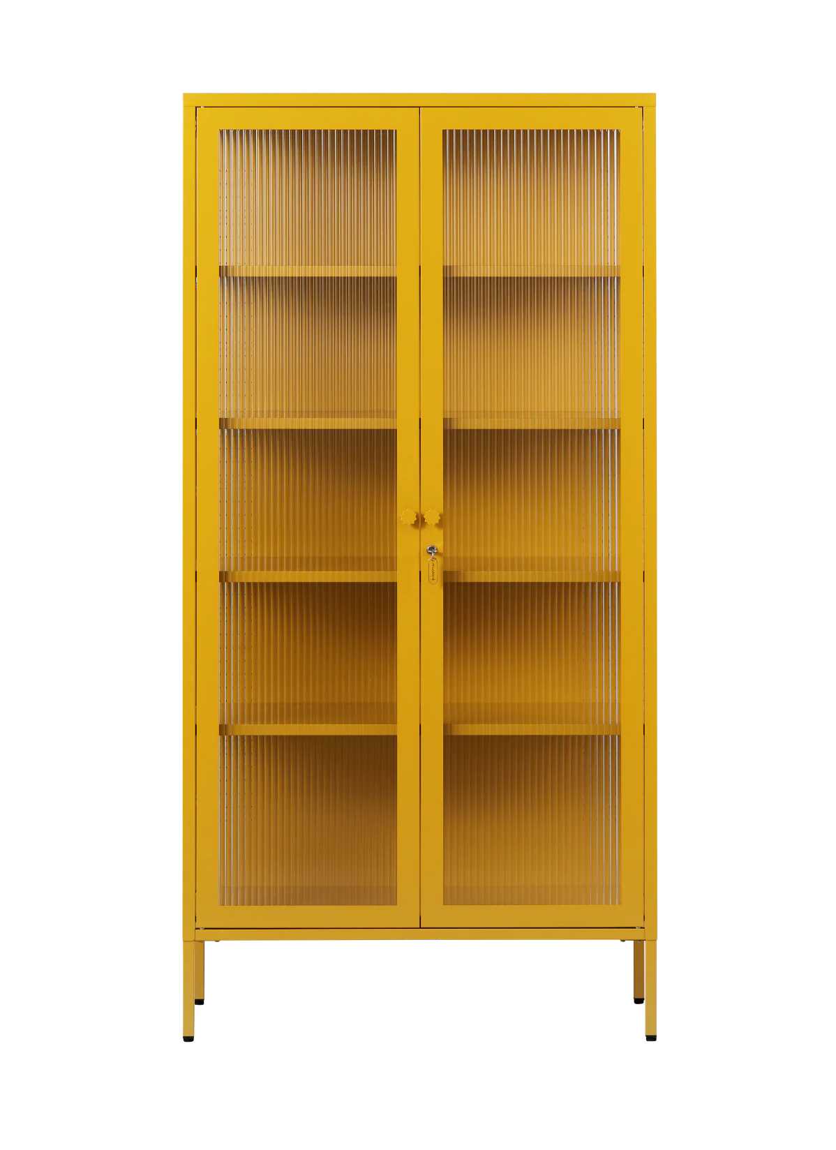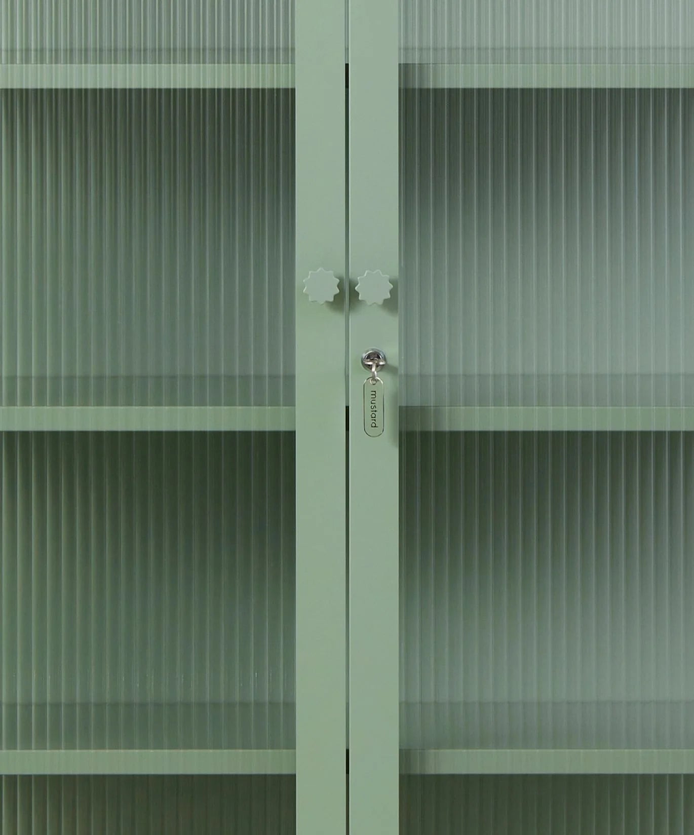 Inside, you'll find four adjustable shelves, a door bolt and a subtle embossed 'mustard', to let you know it's the real deal. Outside, fluted glass panels are set in a metal frame with medallion handles, a lock, a custom Mustard enamel keyring and adjustable feet.
