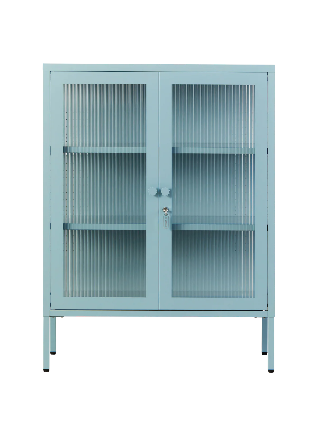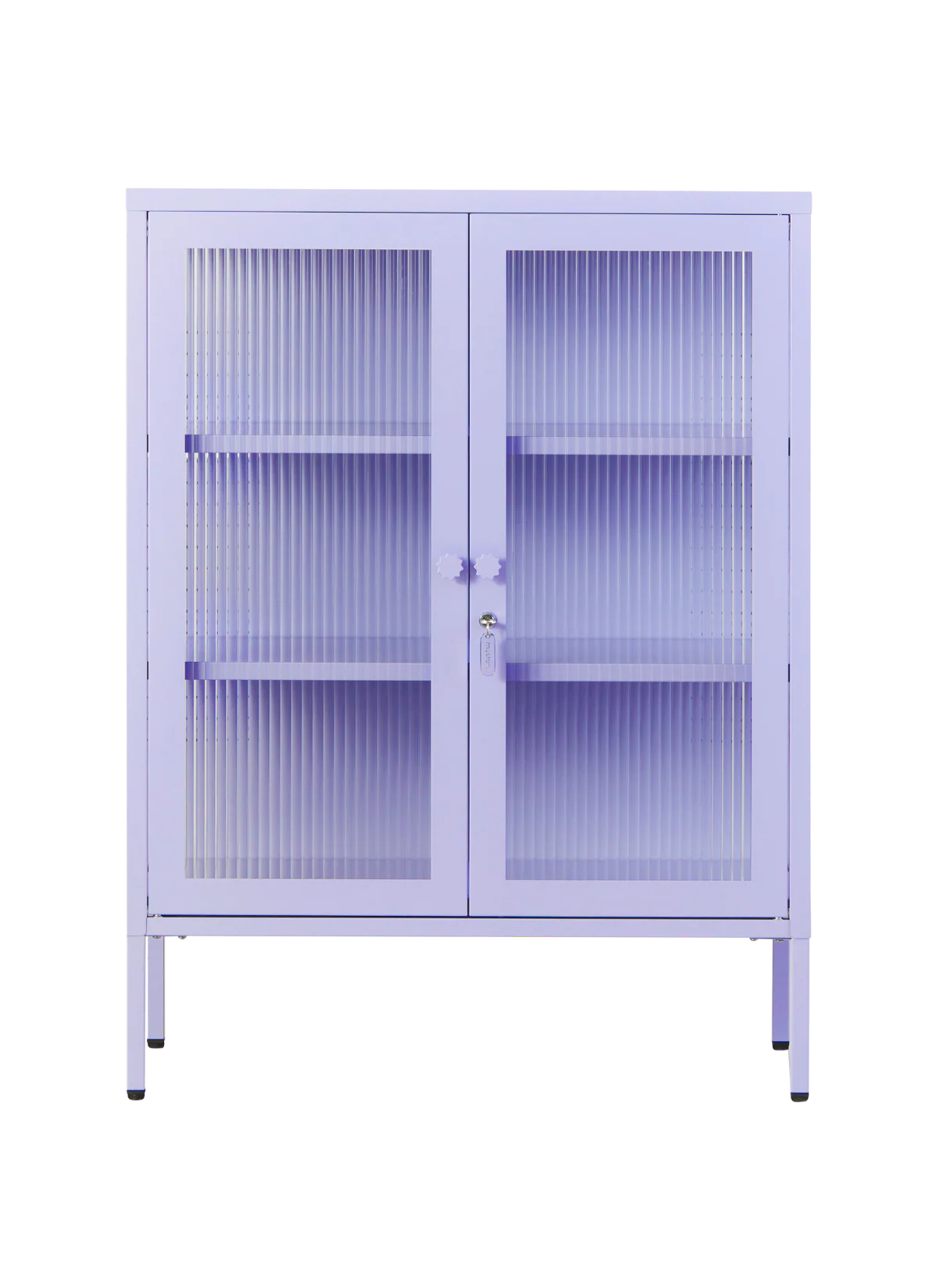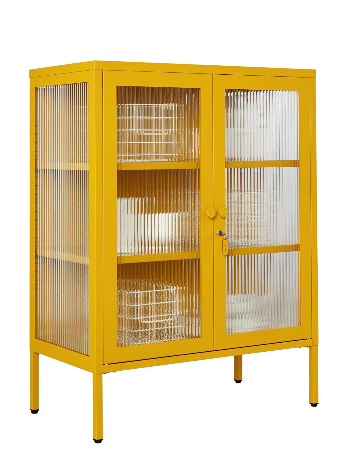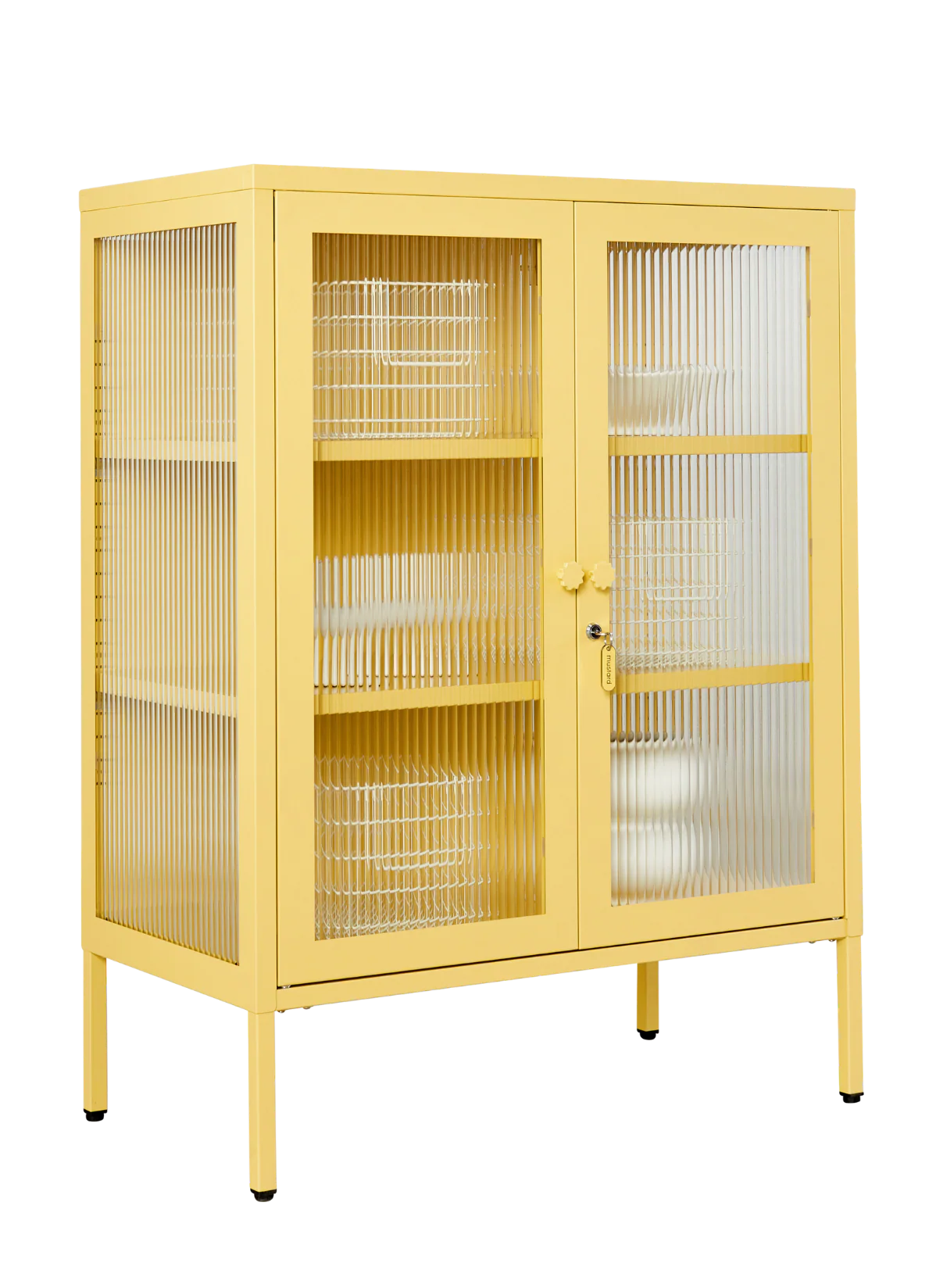 Inside, you'll find two adjustable shelves, a door bolt and a subtle embossed 'mustard', to let you know it's the real deal. Outside, fluted glass panels are set in a metal frame with medallion handles, a lock, a custom Mustard enamel keyring, adjustable feet and wall attachment points.