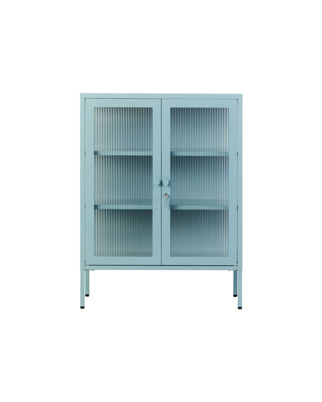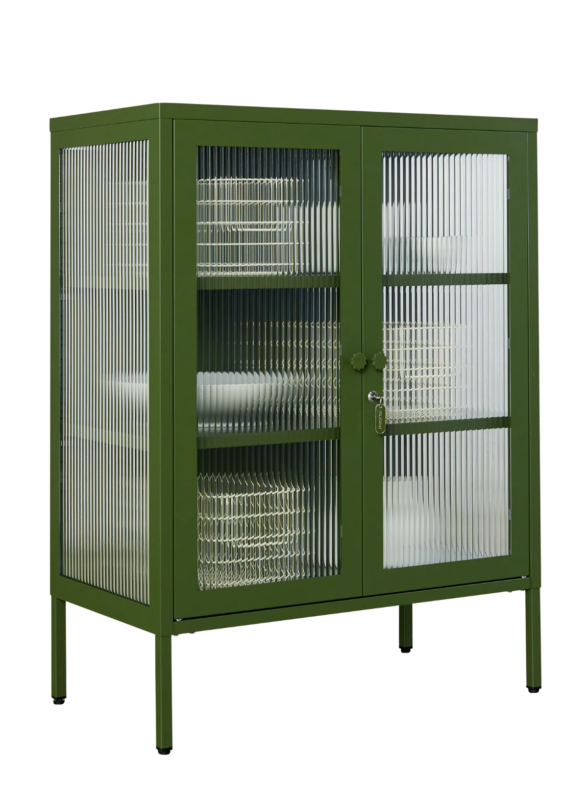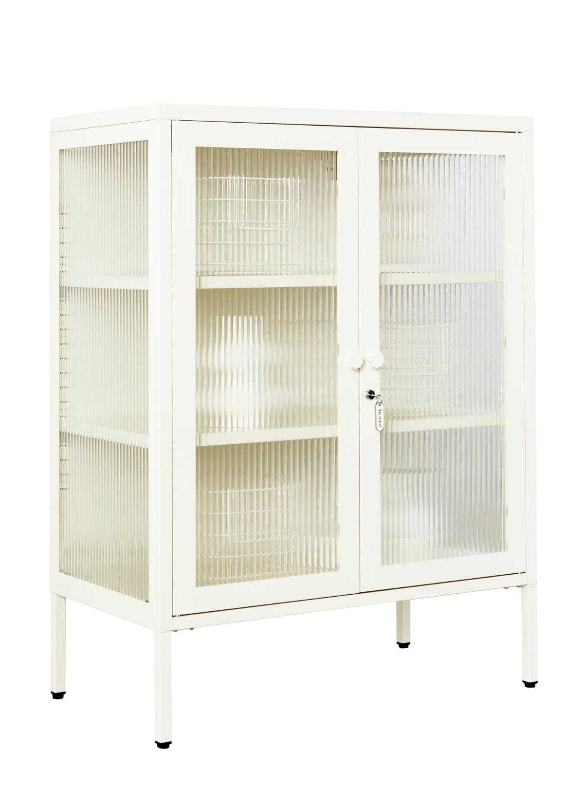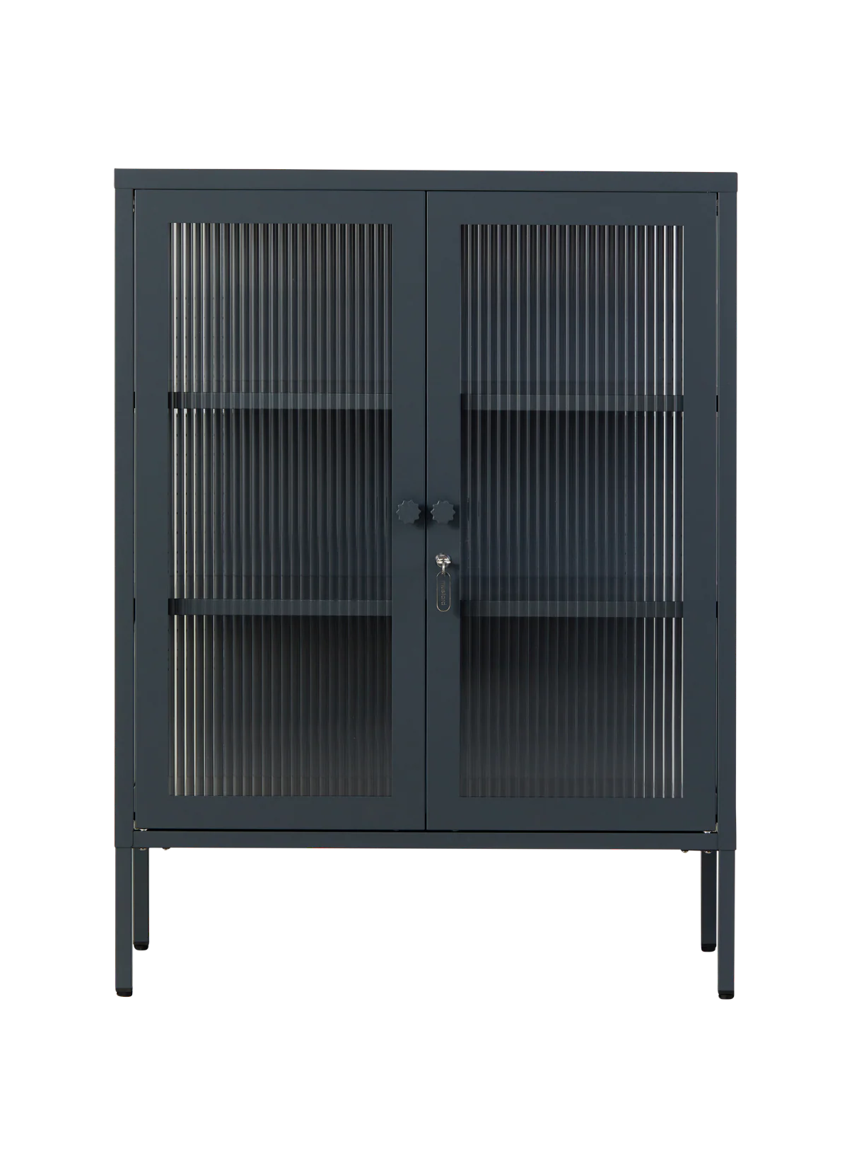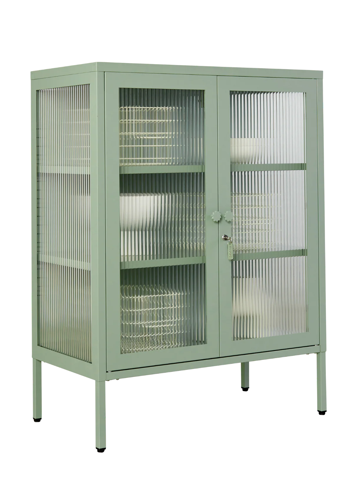 Inside, you'll find two adjustable shelves, a door bolt and a subtle embossed 'mustard', to let you know it's the real deal. Outside, fluted glass panels are set in a metal frame with medallion handles, a lock, a custom Mustard enamel keyring, adjustable feet and wall attachment points.