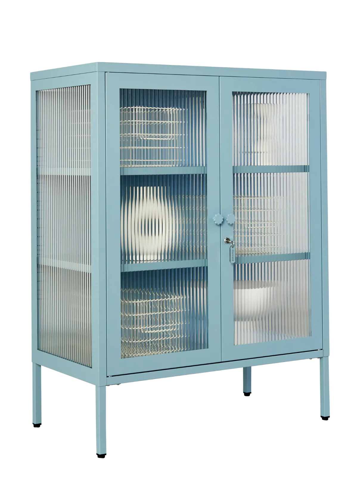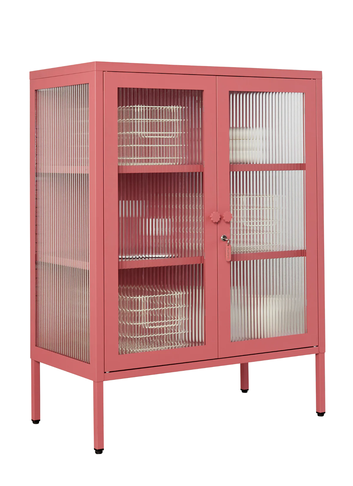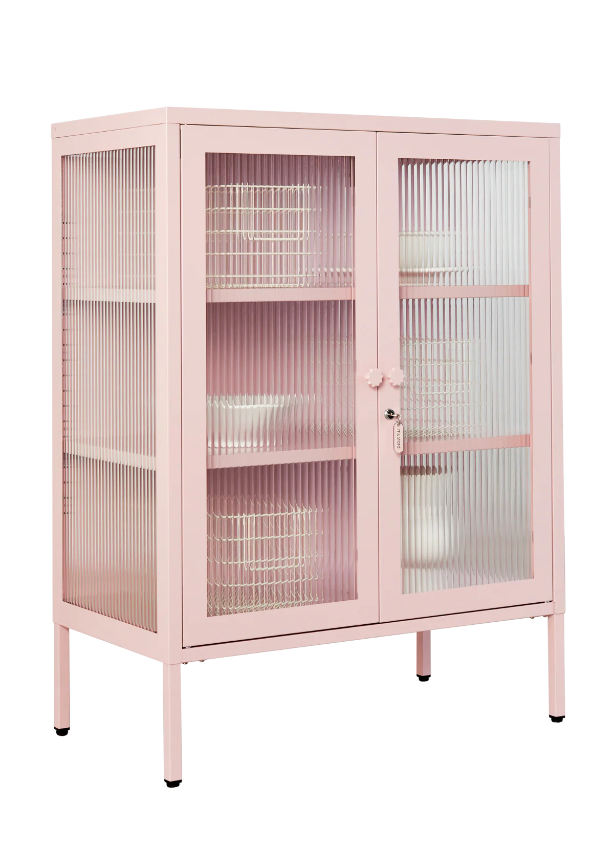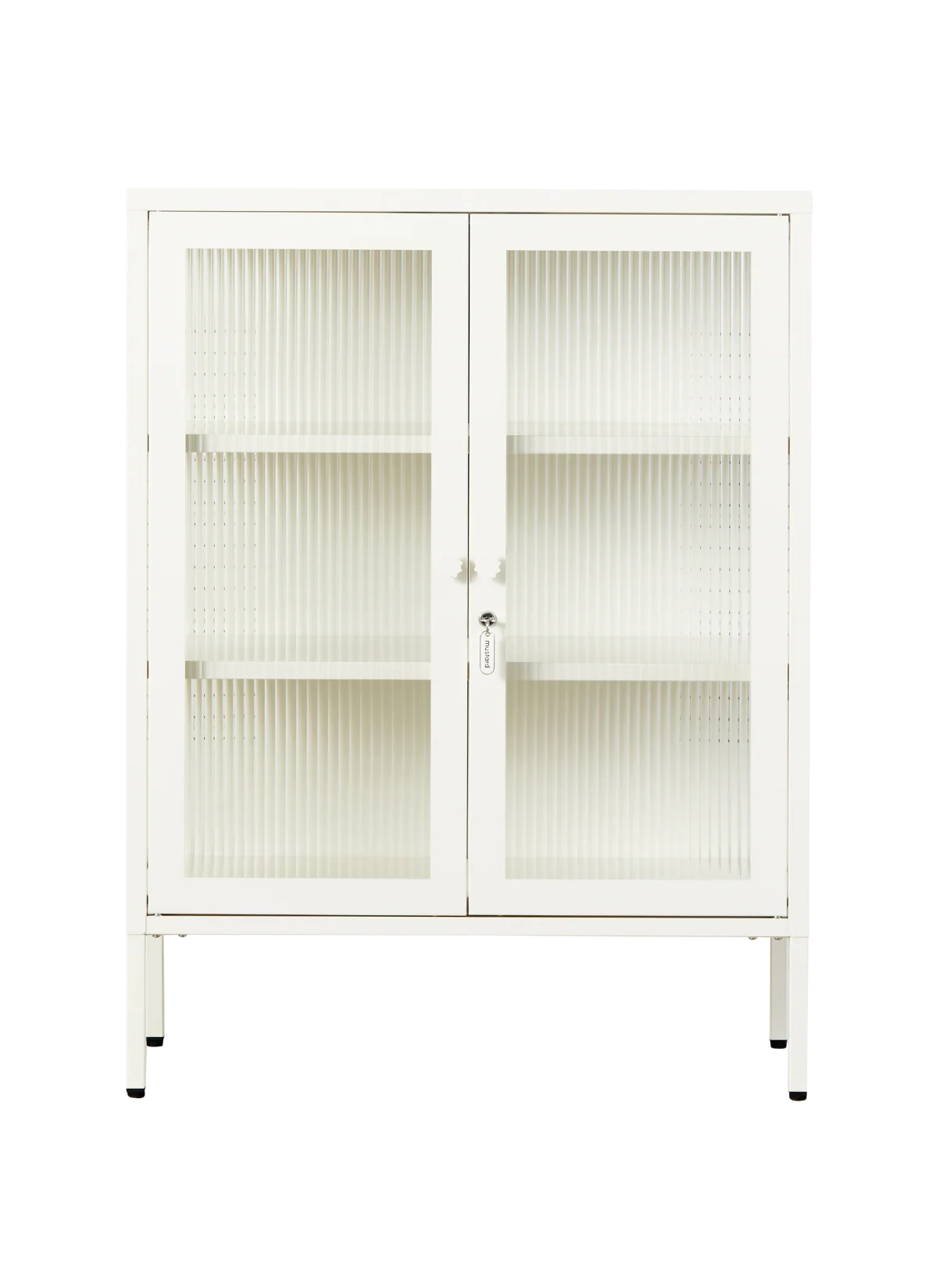 Inside, you'll find two adjustable shelves, a door bolt and a subtle embossed 'mustard', to let you know it's the real deal. Outside, fluted glass panels are set in a metal frame with medallion handles, a lock, a custom Mustard enamel keyring, adjustable feet and wall attachment points.