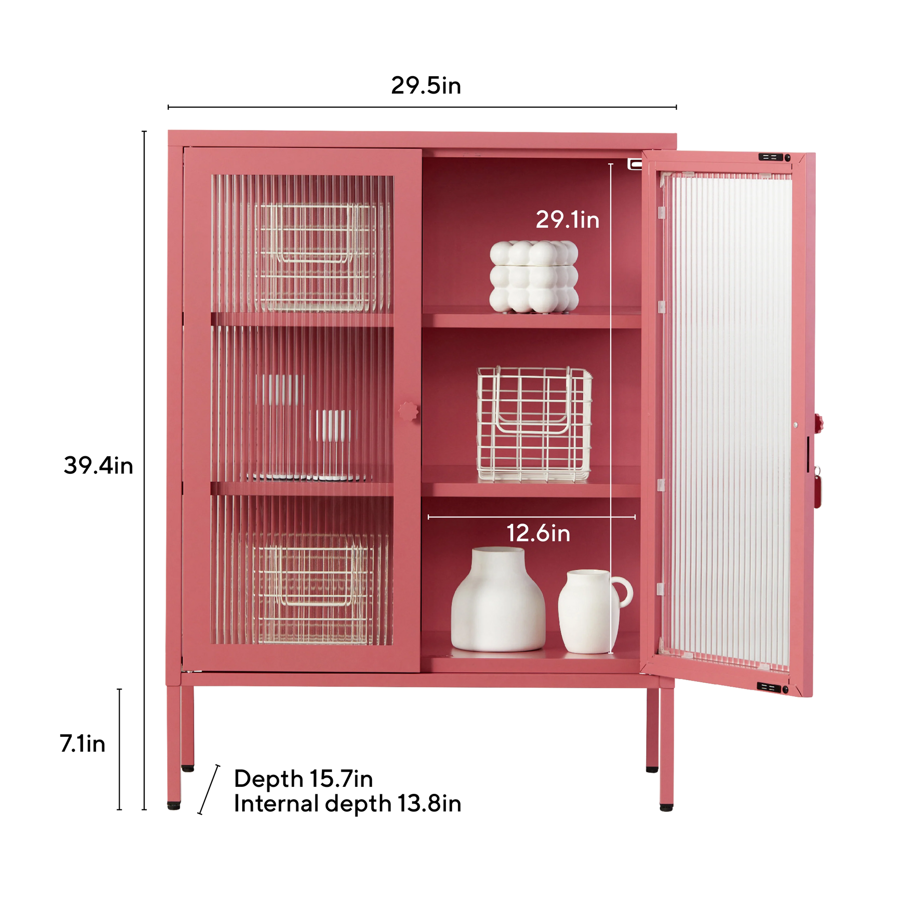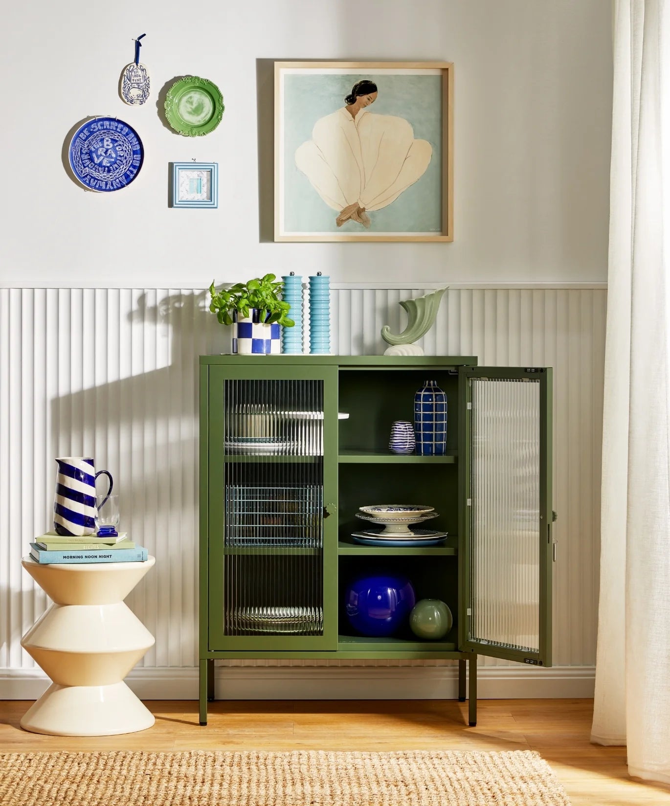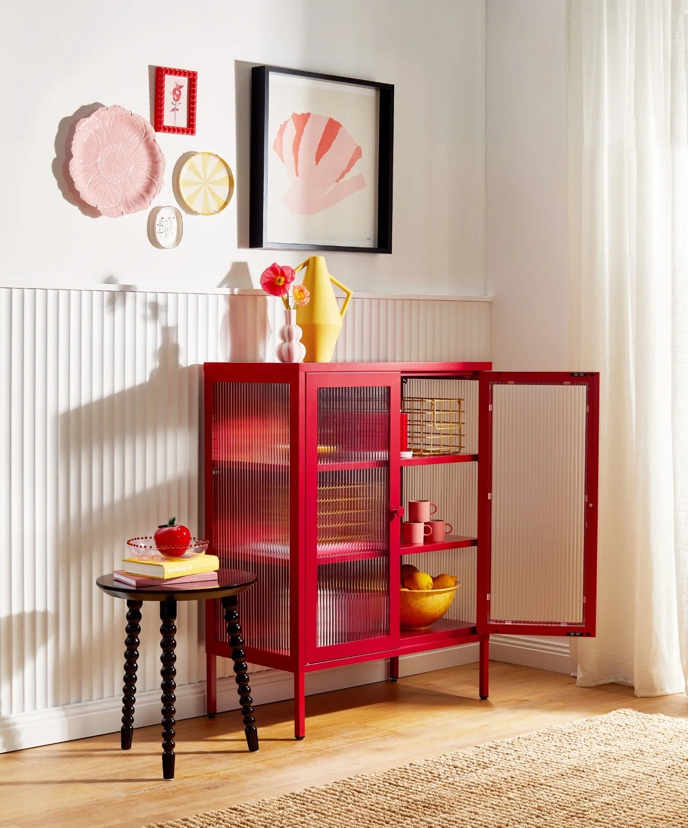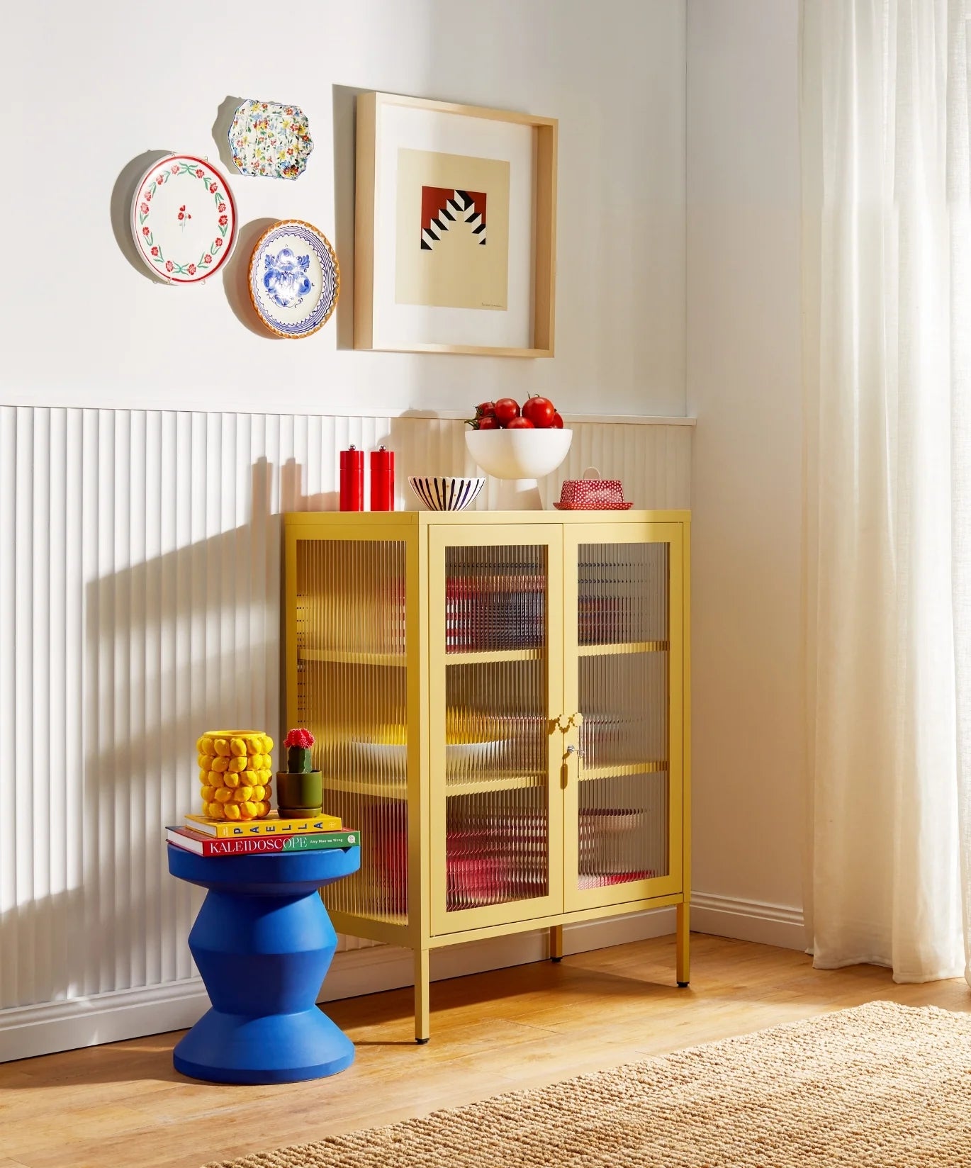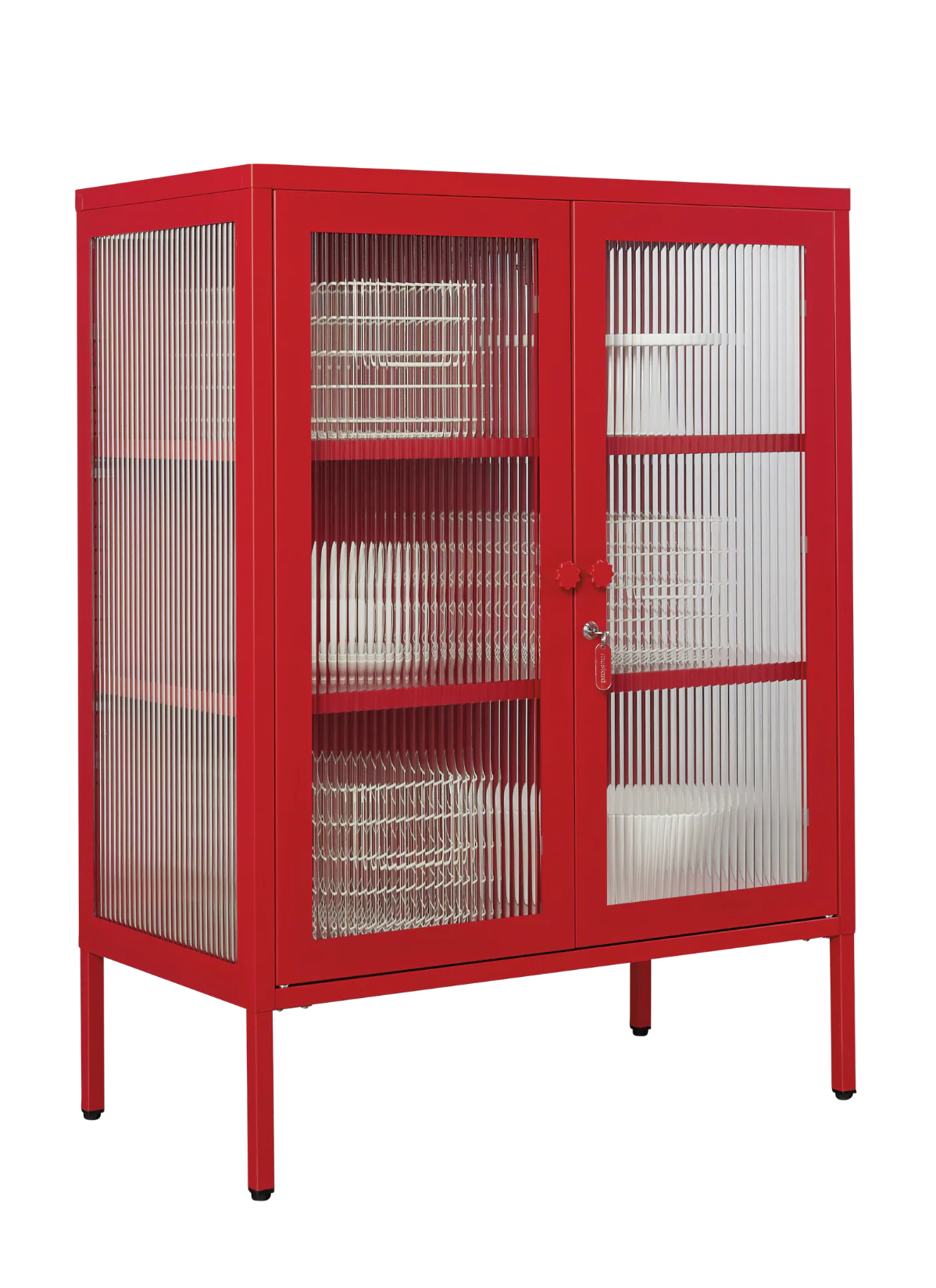 Inside, you'll find two adjustable shelves, a door bolt and a subtle embossed 'mustard', to let you know it's the real deal. Outside, fluted glass panels are set in a metal frame with medallion handles, a lock, a custom Mustard enamel keyring, adjustable feet and wall attachment points.