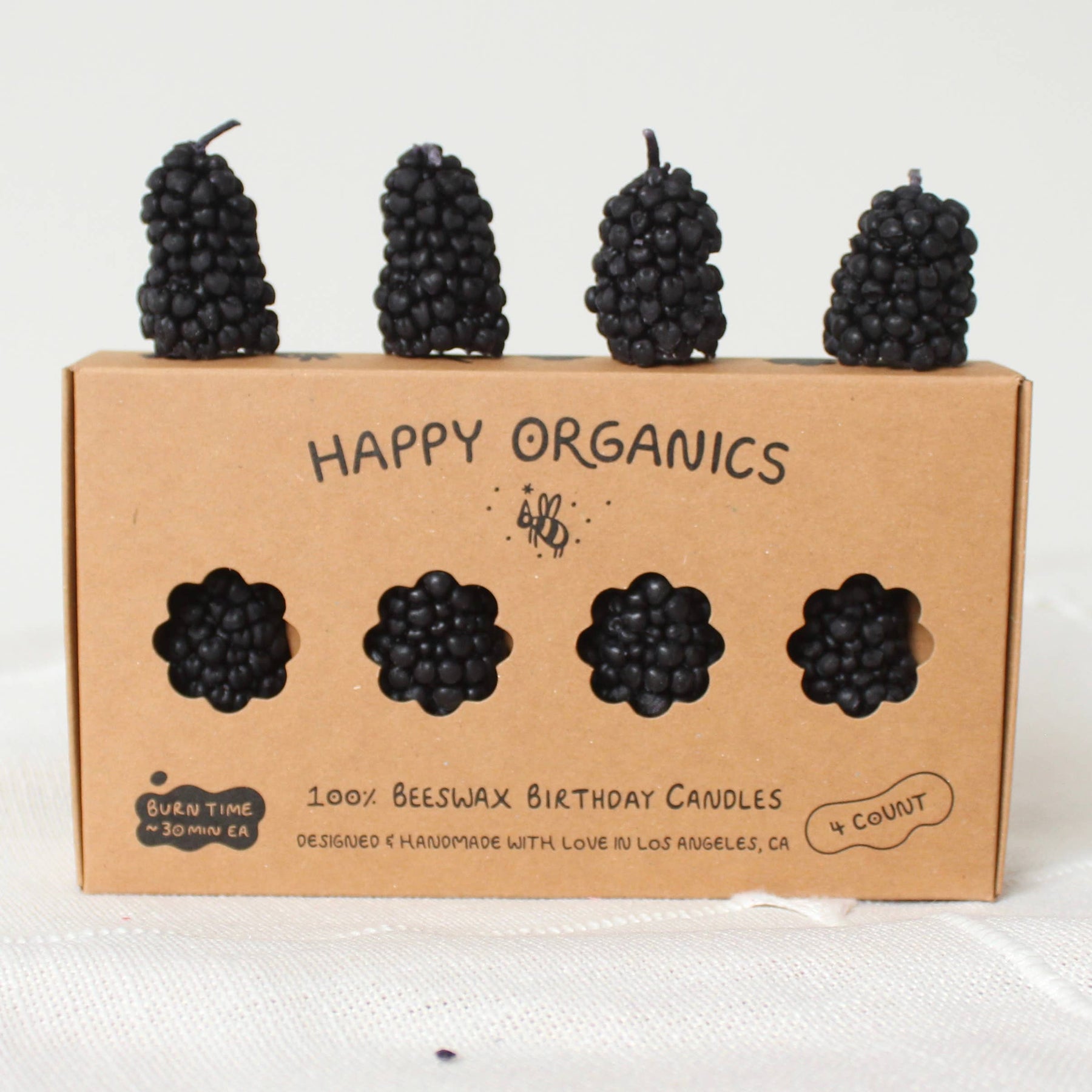 Celebrate birthdays and everyday milestones with a charming set of fruit-shaped candles. This curated box includes four handcrafted blackberry beeswax candles—inspired by berries we source from our family farm, local markets, and grocery stores. Each candle is poured by hand using molds made from real fruit, capturing every tiny detail for a delightful, realistic look. Perfect for topping cakes, tarts, or cupcakes, these unscented candles bring a playful pop of color and a farm-fresh touch to celebrations of all kinds. ⸻ ✨ Product Details • Includes: 4 birthday candles • Materials: 100% beeswax, cotton wick, eco-friendly dye (non-carcinogenic, phthalate-free, third-party tested) • Handmade in: Los Angeles, CA • Safety: Third-party tested 📦 Packaging • Display: Candles nestled in crinkle cut paper inside a reusable mini berry basket • Outer Packaging: Kraft box (approx. 6” x 3.5” x 1”) with Happy Organics branding—ready for gifting or merchandising ⸻ This smaller box makes an ideal stocking stuff