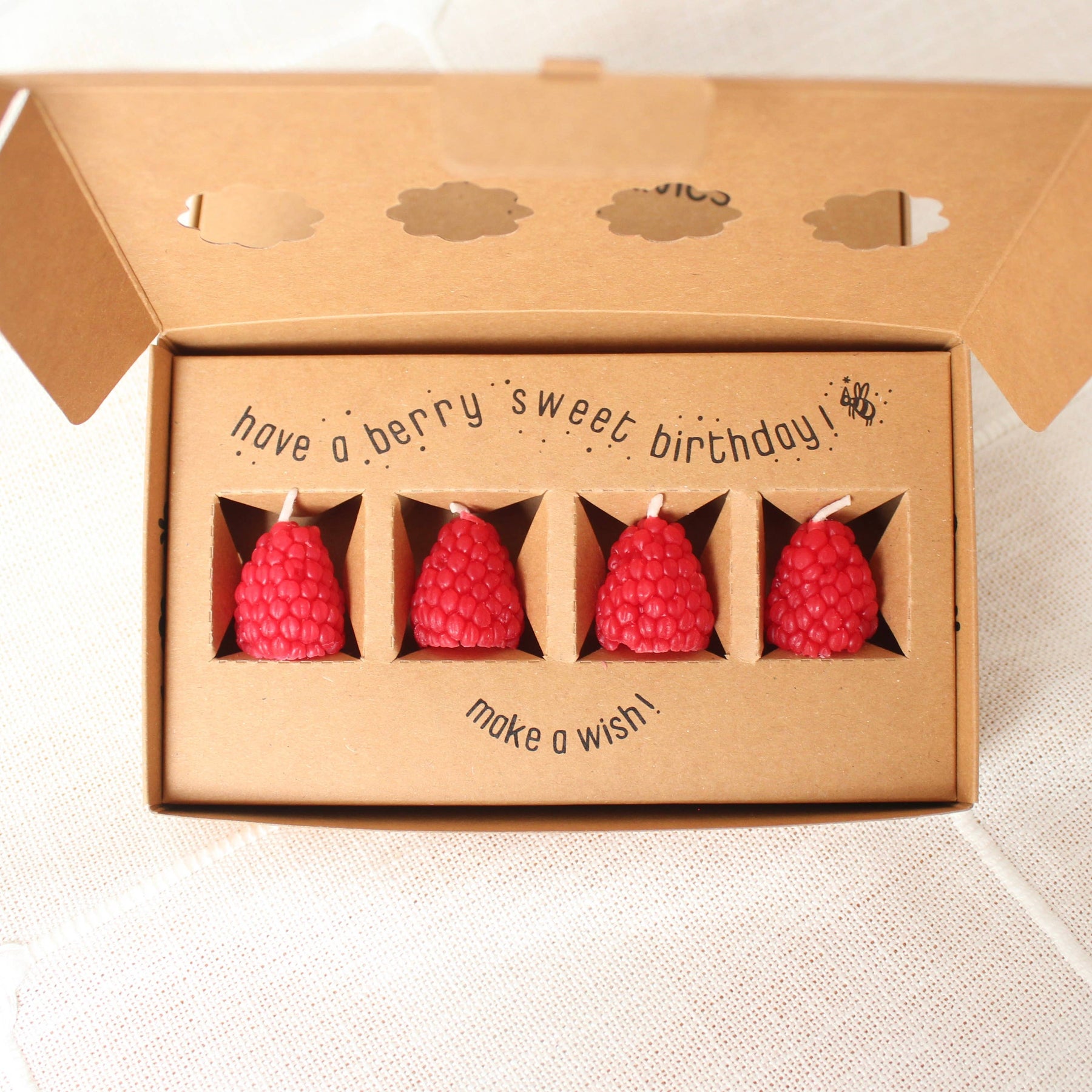 Celebrate birthdays and everyday milestones with a charming set of fruit-shaped candles. This curated box includes four handcrafted raspberry beeswax candles—inspired by berries we source from our family farm, local markets, and grocery stores. Each candle is poured by hand using molds made from real fruit, capturing every tiny detail for a delightful, realistic look. Perfect for topping cakes, tarts, or cupcakes, these unscented candles bring a playful pop of color and a farm-fresh touch to celebrations of all kinds. ⸻ ✨ Product Details • Includes: 4 birthday candles • Materials: 100% beeswax, cotton wick, eco-friendly dye (non-carcinogenic, phthalate-free, third-party tested) • Handmade in: Los Angeles, CA • Safety: Third-party tested 📦 Packaging • Display: Candles nestled in crinkle cut paper inside a reusable mini berry basket • Outer Packaging: Kraft box (approx. 6” x 3.5” x 1”) with Happy Organics branding—ready for gifting or merchandising ⸻ This smaller box makes an ideal stocking stuffe