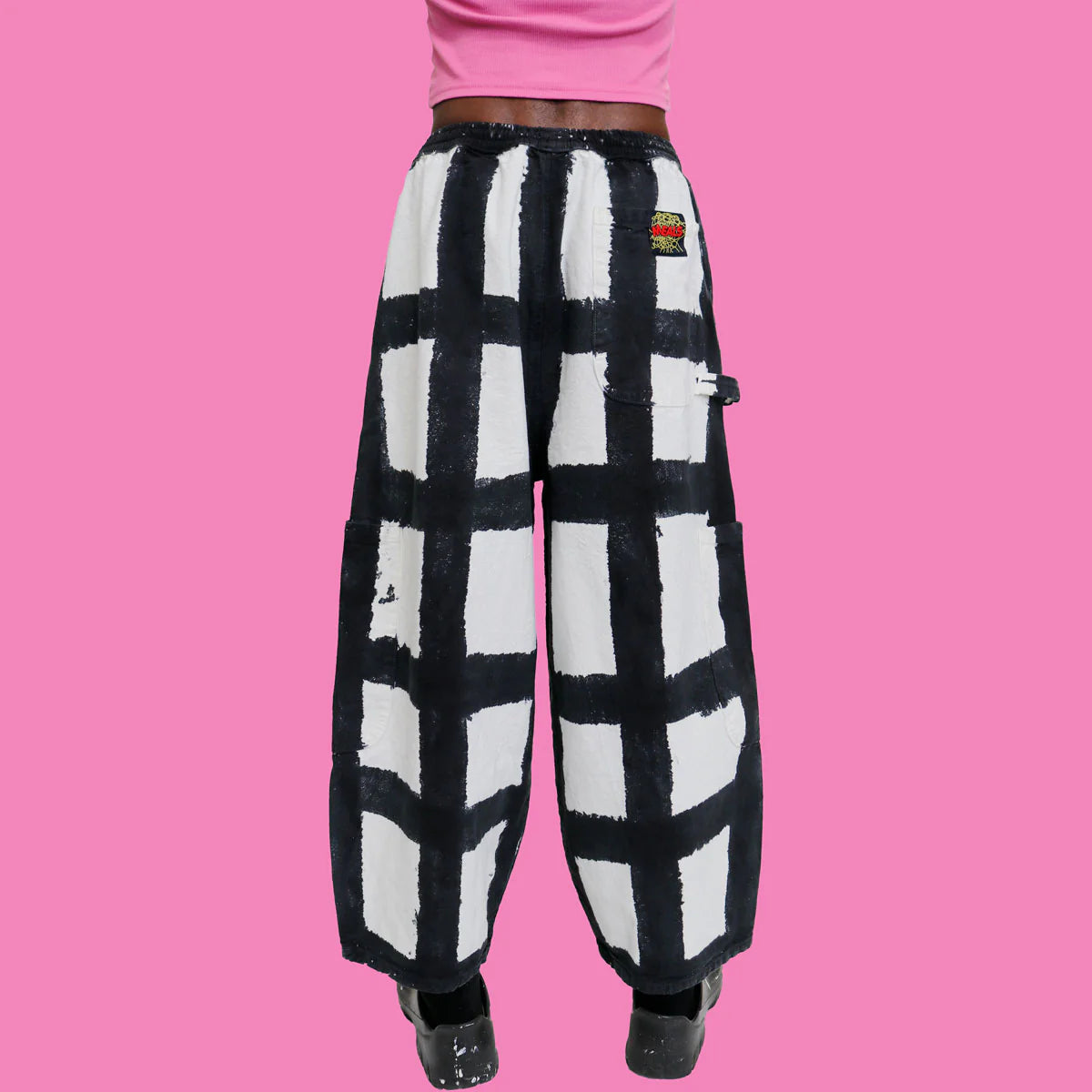 Cropped pants with 5 massive pockets. Hand painted, licorice checkerboard. Elastic waist + drawstring.