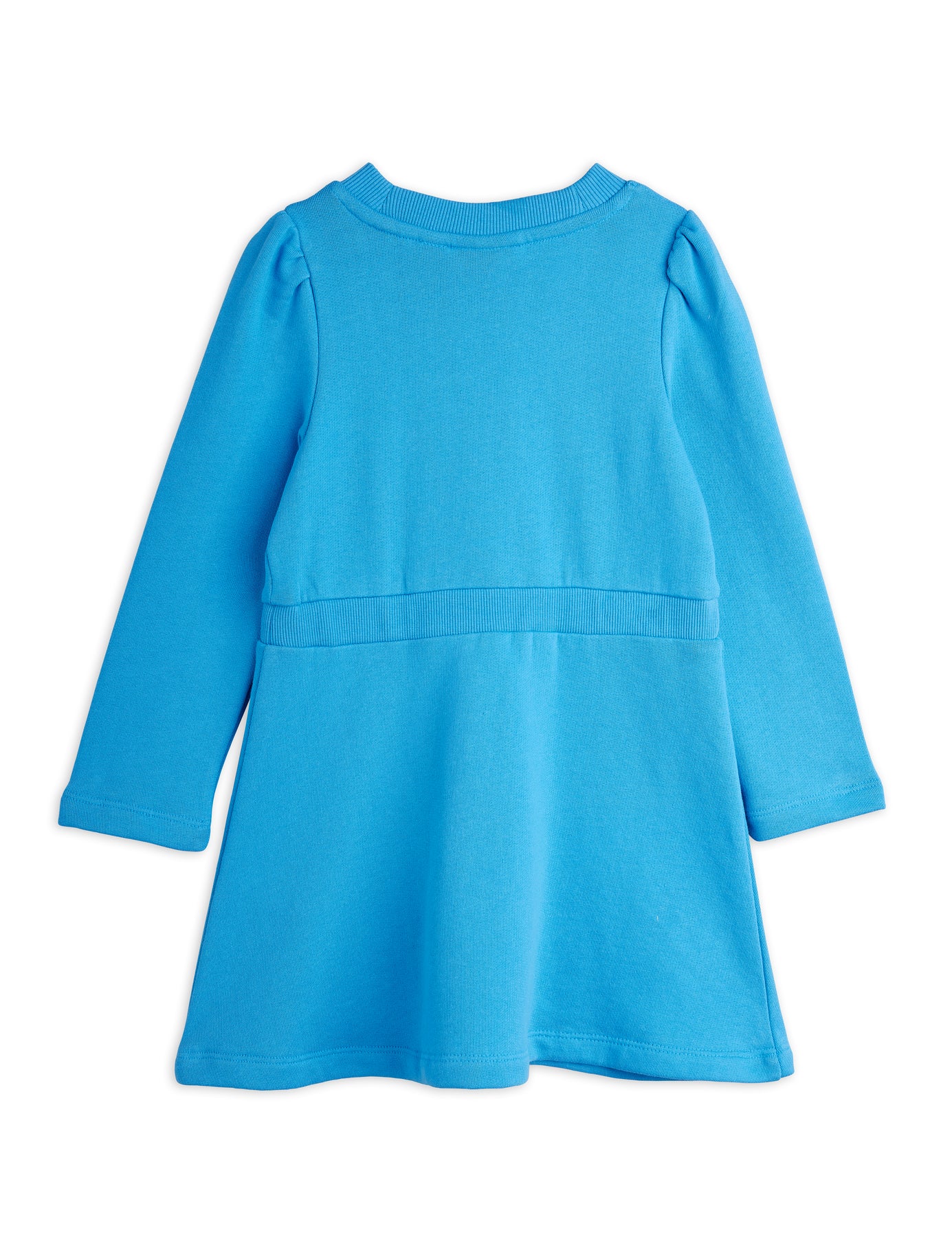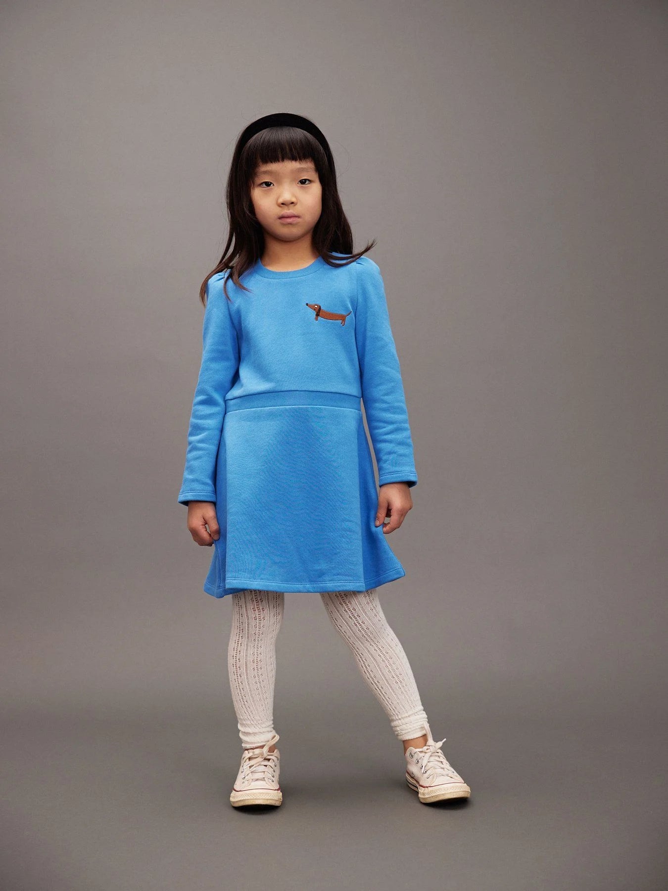 Dress in sweat material with a embroidered dog, made from 100 % GOTS certified organic cotton. Designed with puffed shoulders, a ribbed neck and rib detailing on the waist.