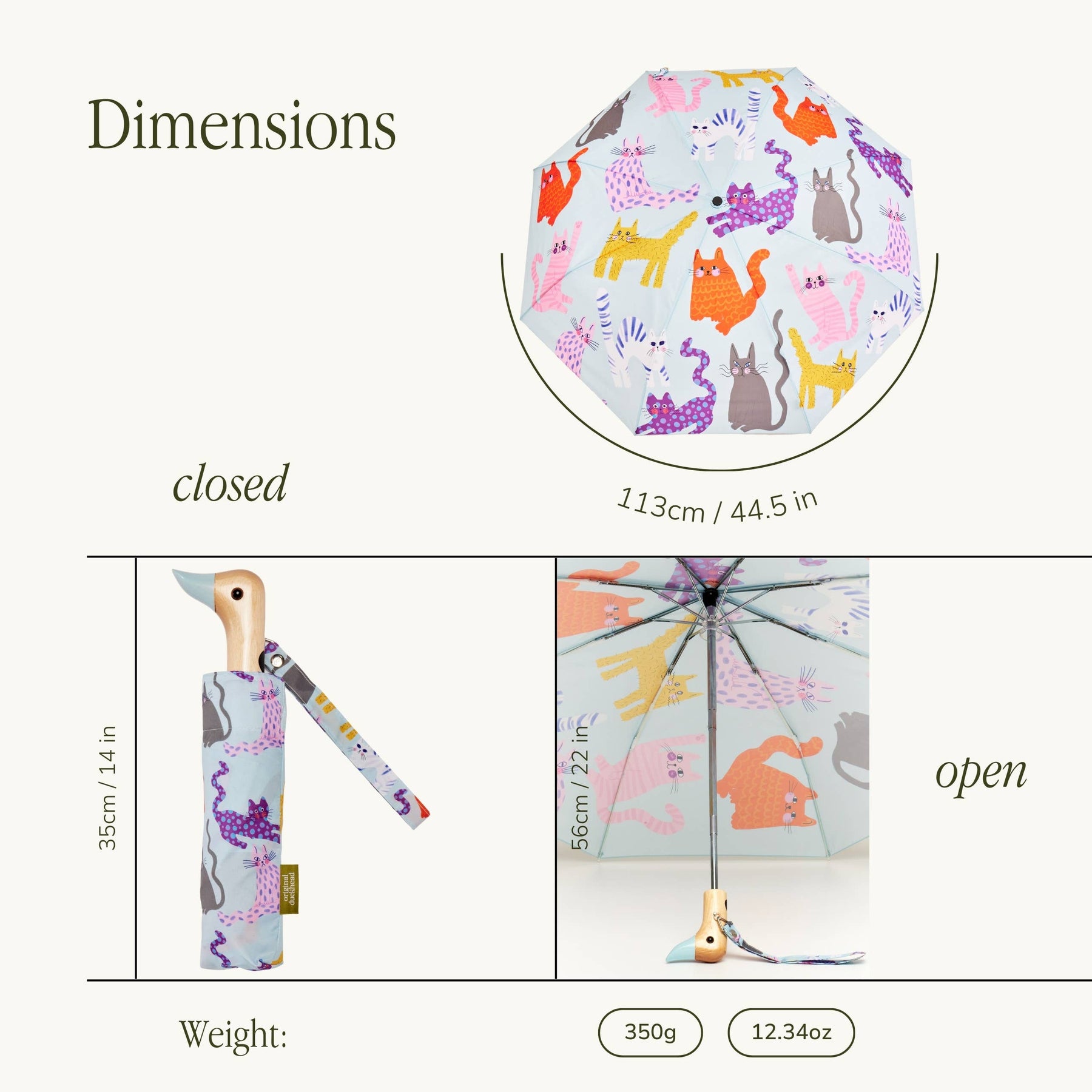 Each canopy is crafted from 9 recycled plastic bottles, helping reduce waste while creating a premium, water-resistant fabric. The iconic duck-head handle is carved from one solid piece of sustainably sourced birch wood, giving every umbrella a unique, natural finish.