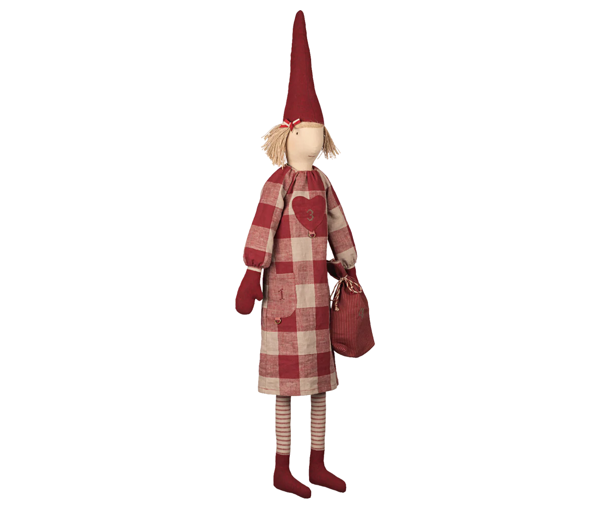 December is full of family traditions and this calendar pixy can be your next. The Advent calendar girl has 4 rings/pockets to fasten small treats - one for the 4 last Sundays before Christmas. It has a strap in the neck, so it is easy to hang up.