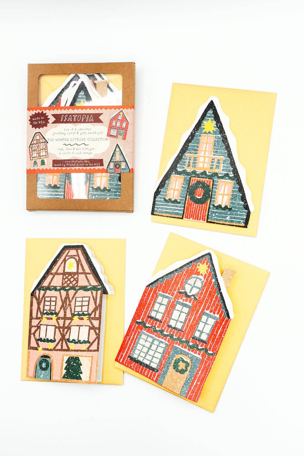 The Winter Cottage Collection is a set of holiday cards featuring three snow-covered cottages, each lovingly illustrated with twinkling lights, wreaths, and a dusting of vintage charm. Inspired by cozy Nordic winters and quiet villages, this trio captures the magic of the season—perfect for sending warm, heartfelt wishes all holiday long.