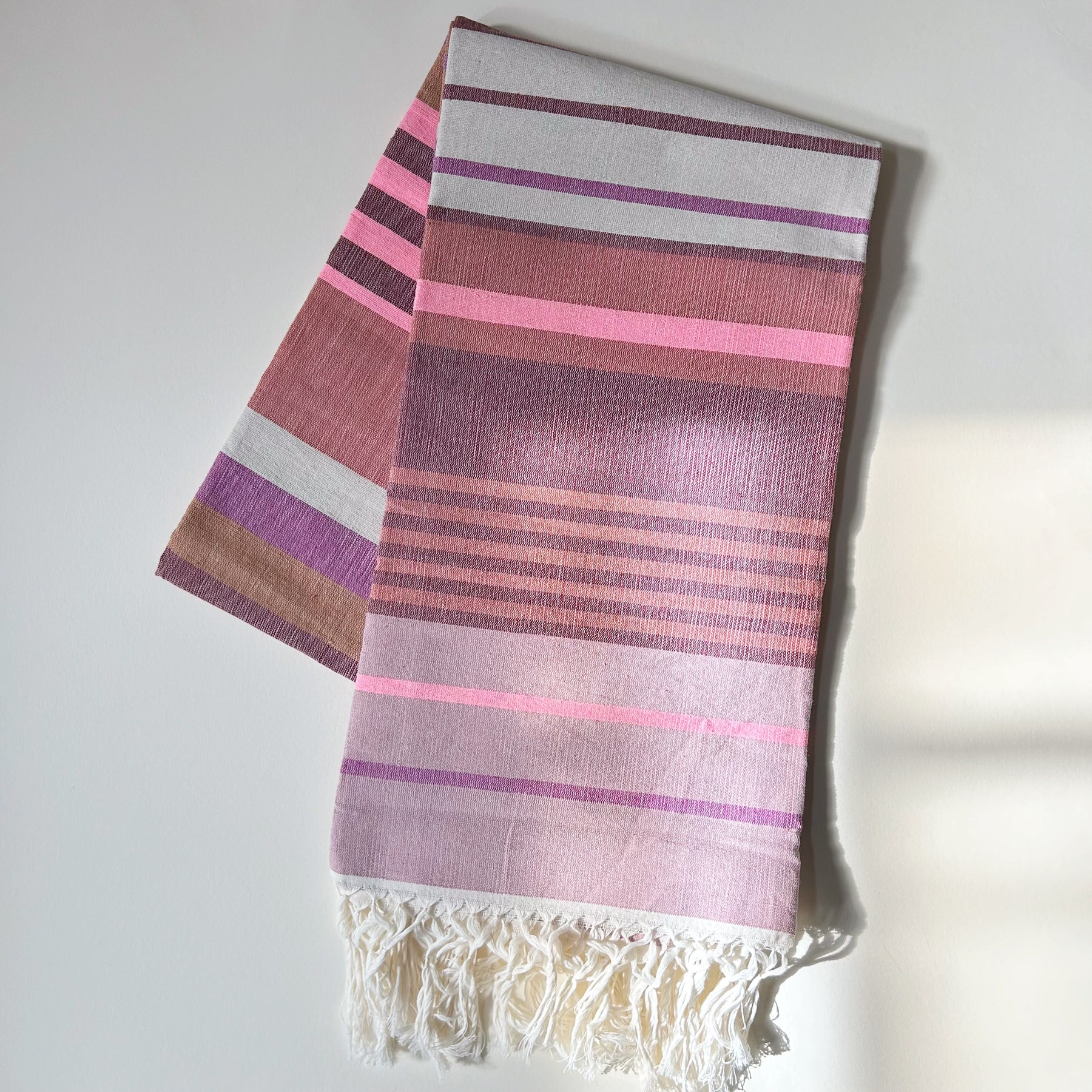 This blanket was handwoven in Oaxaca using the flying shuttle loom. It is bright, cozy, and finished with a rustic edge and fringe.