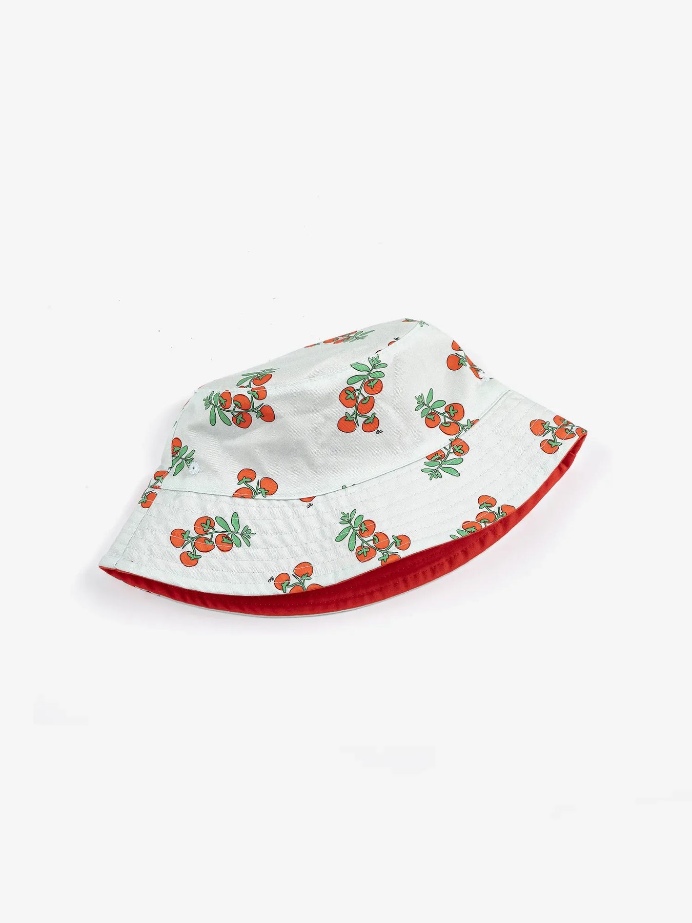 Reversible bucket hat with Juicy Tomatoes print and solid red logo side. Lightweight and ready for sun-filled days.