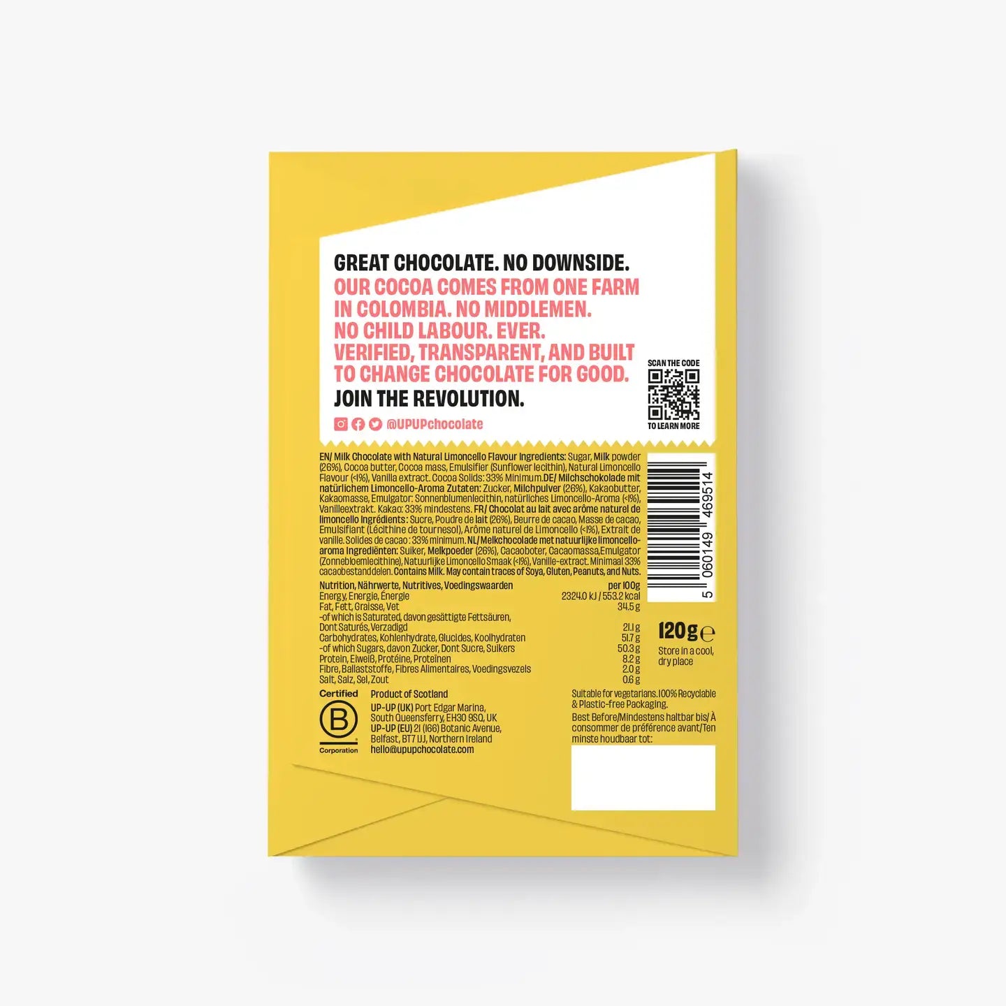 UP-UP Limoncello Chocolate is inspired by Italy’s beloved liqueur. Crafted with Single Estate 33% cacao from fine flavour cocoa beans grown in Colombia’s Casenare region, this bar is infused with the vibrant zest of limoncello flavour. The result is a delightful blend of creamy sweetness and refreshing citrus notes, offering a perfectly balanced and taste of sunshine in every bite.