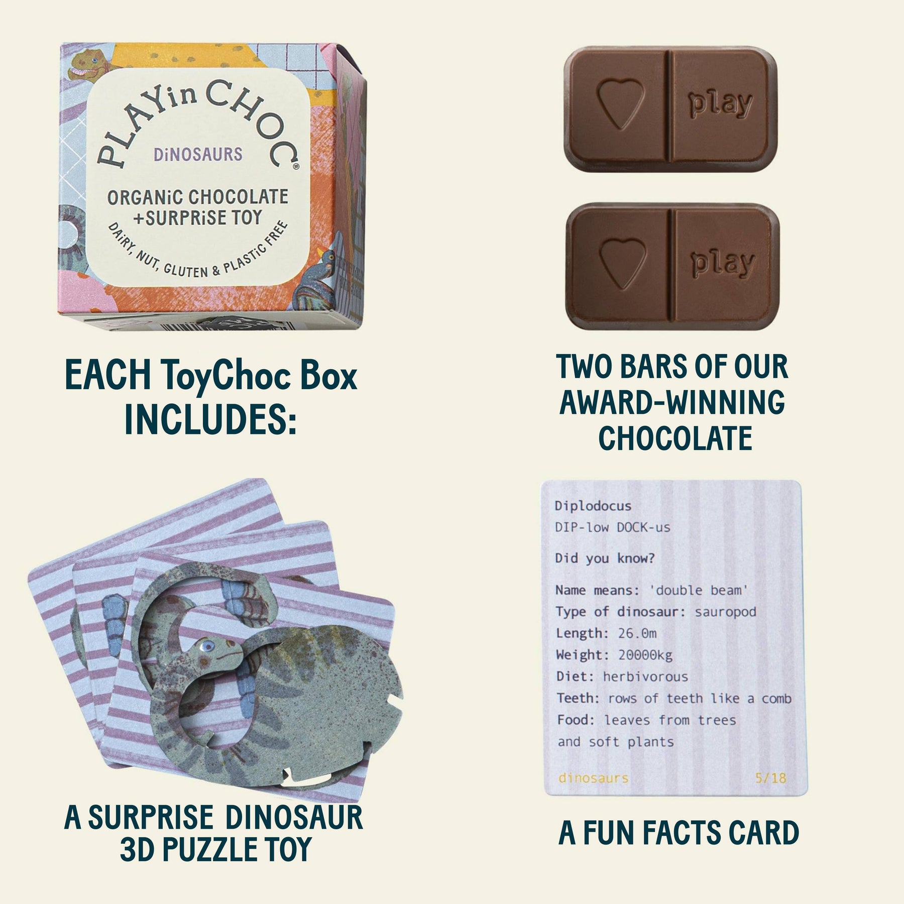 PLAYin CHOC ToyChoc Box contains 2 x 10g individually wrapped, deliciously creamy, organic dairy free chocolates and a delightful card toy to assemble.