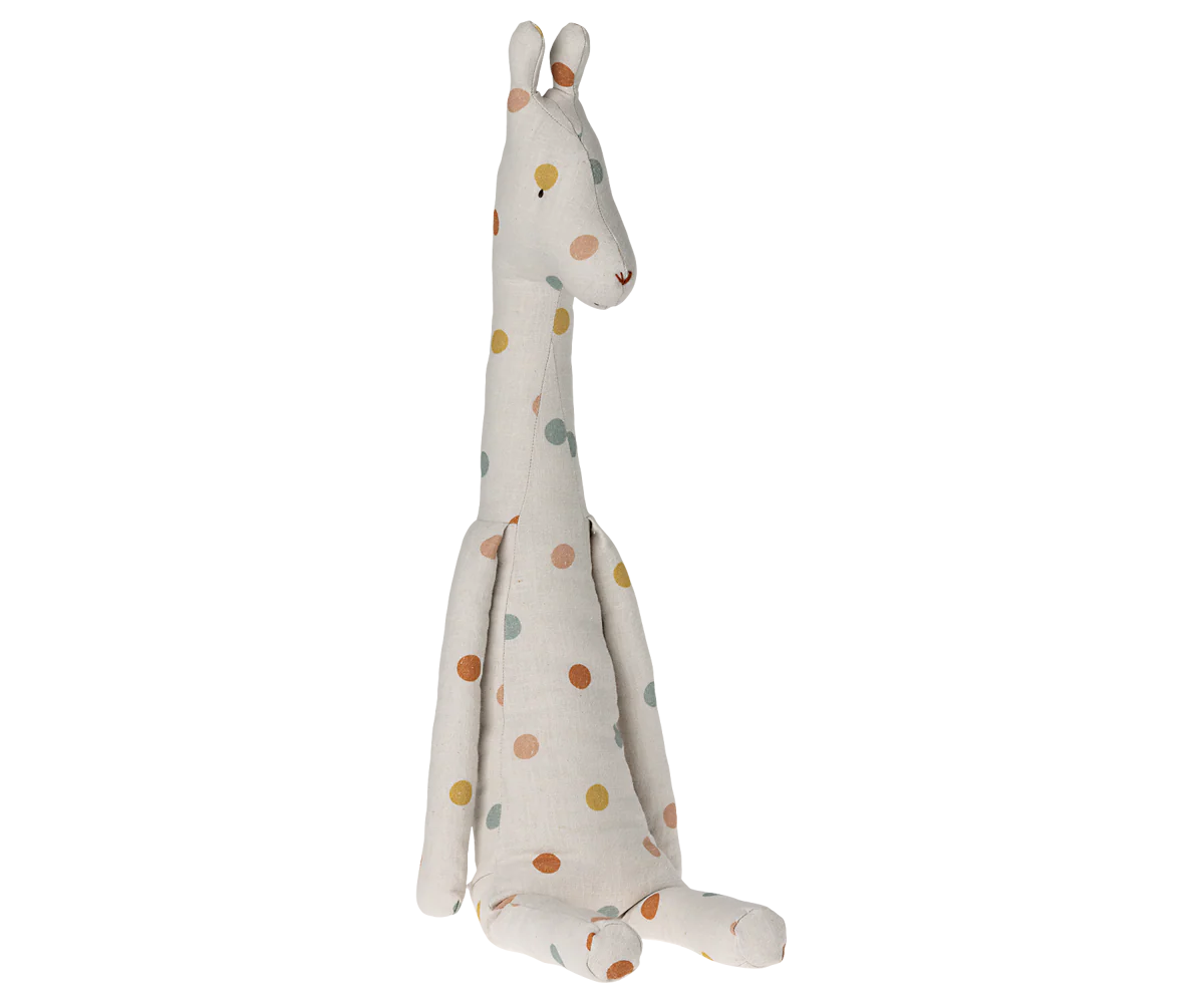 This giraffe comes in soft linen fabric with a multi-dot print. It has a sweet look and size - a new best friend for the small ones.