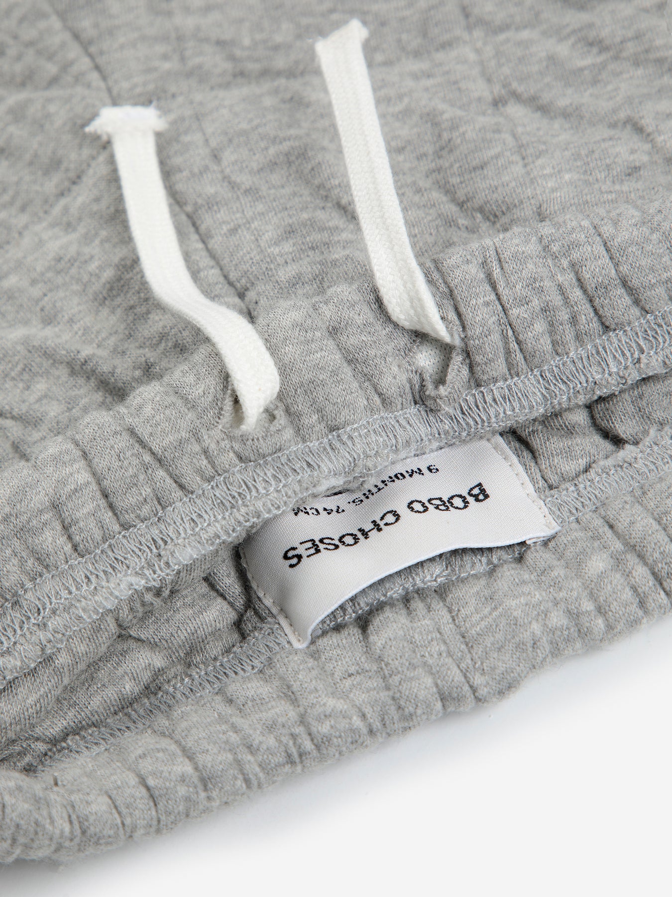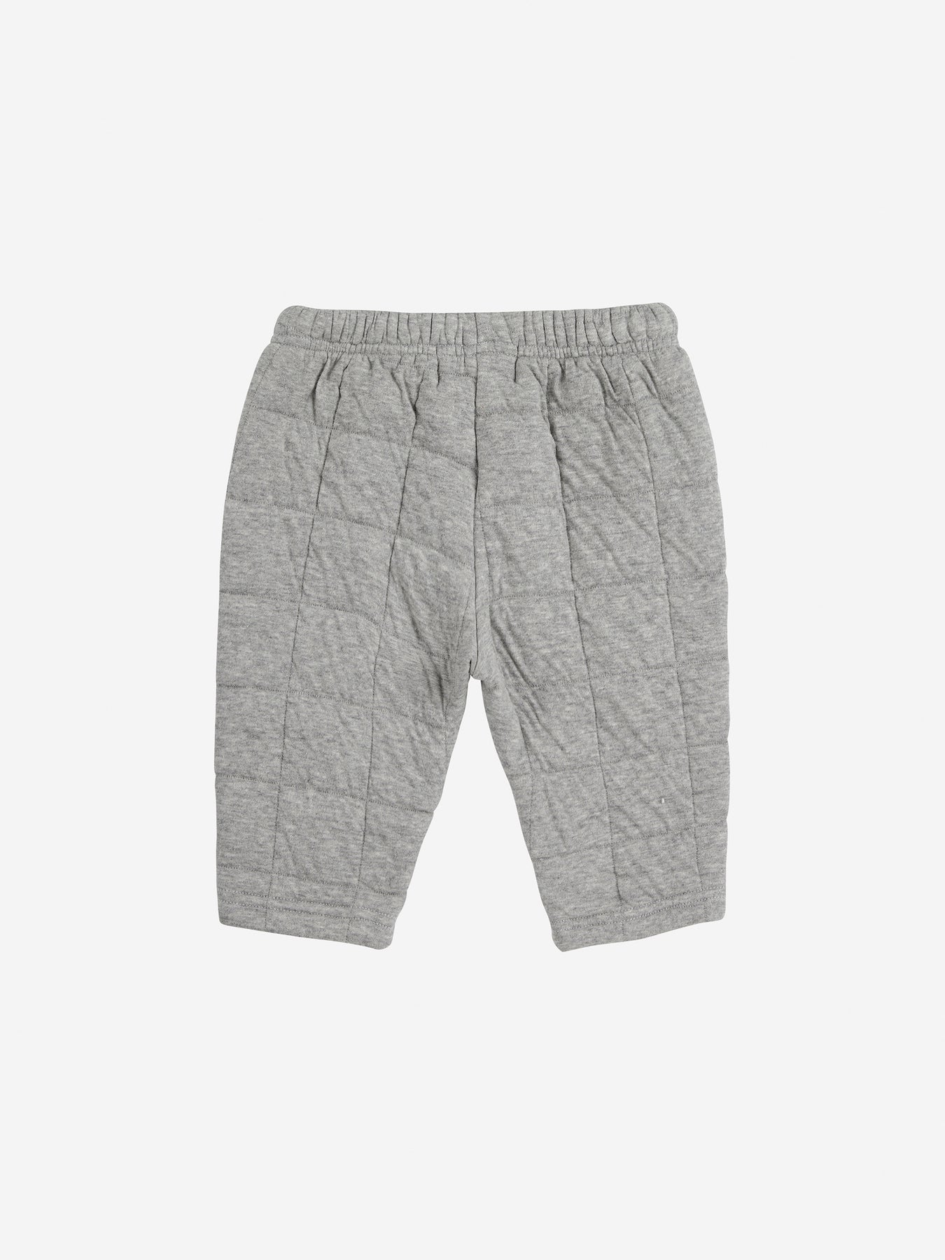 Light heather grey pants. Designed with elasticated waistband, embroidery, cocoon fit, long length, quilted padded, contrast fabric patch and fleece.