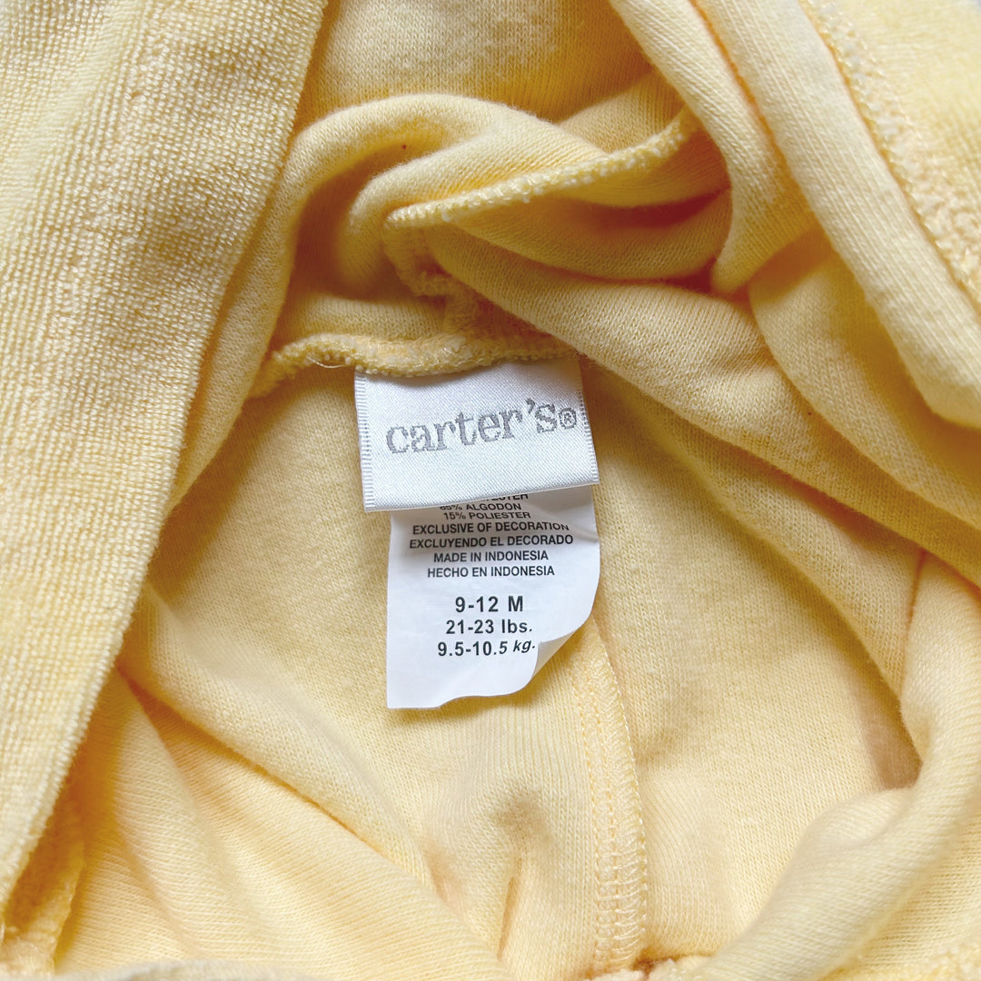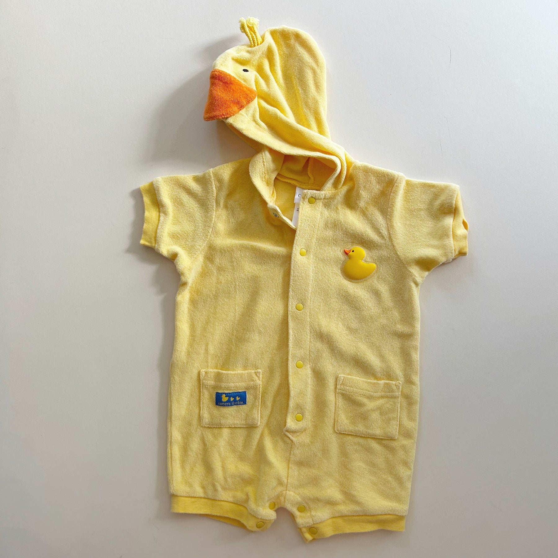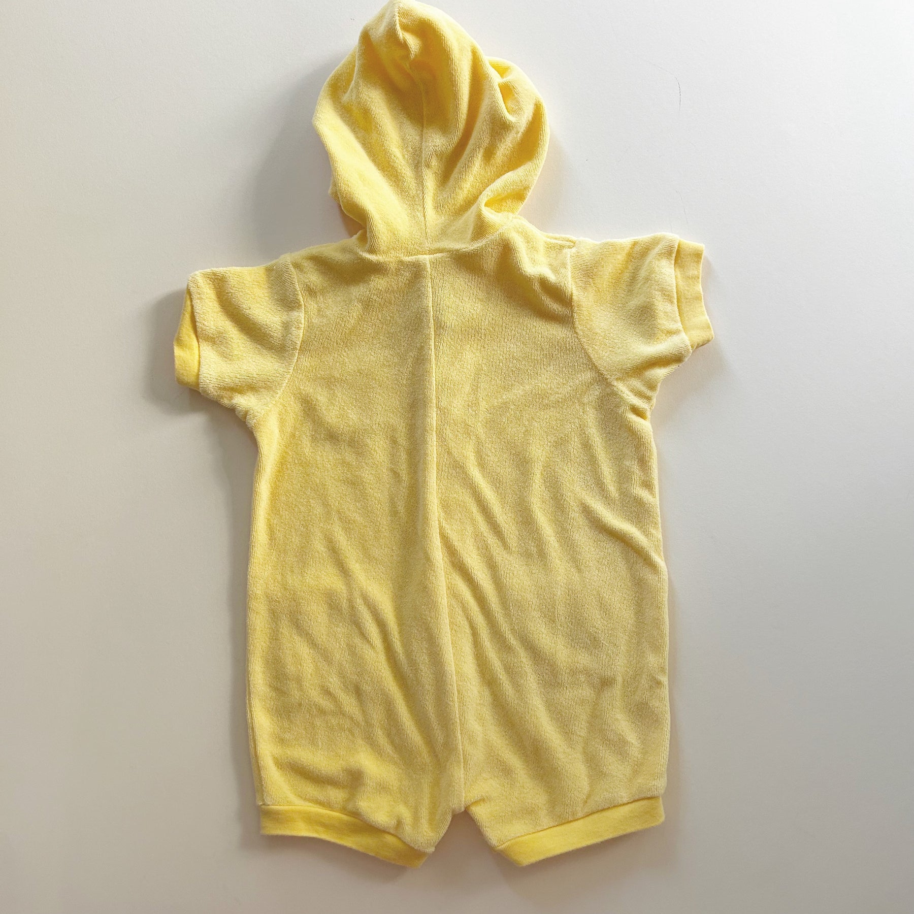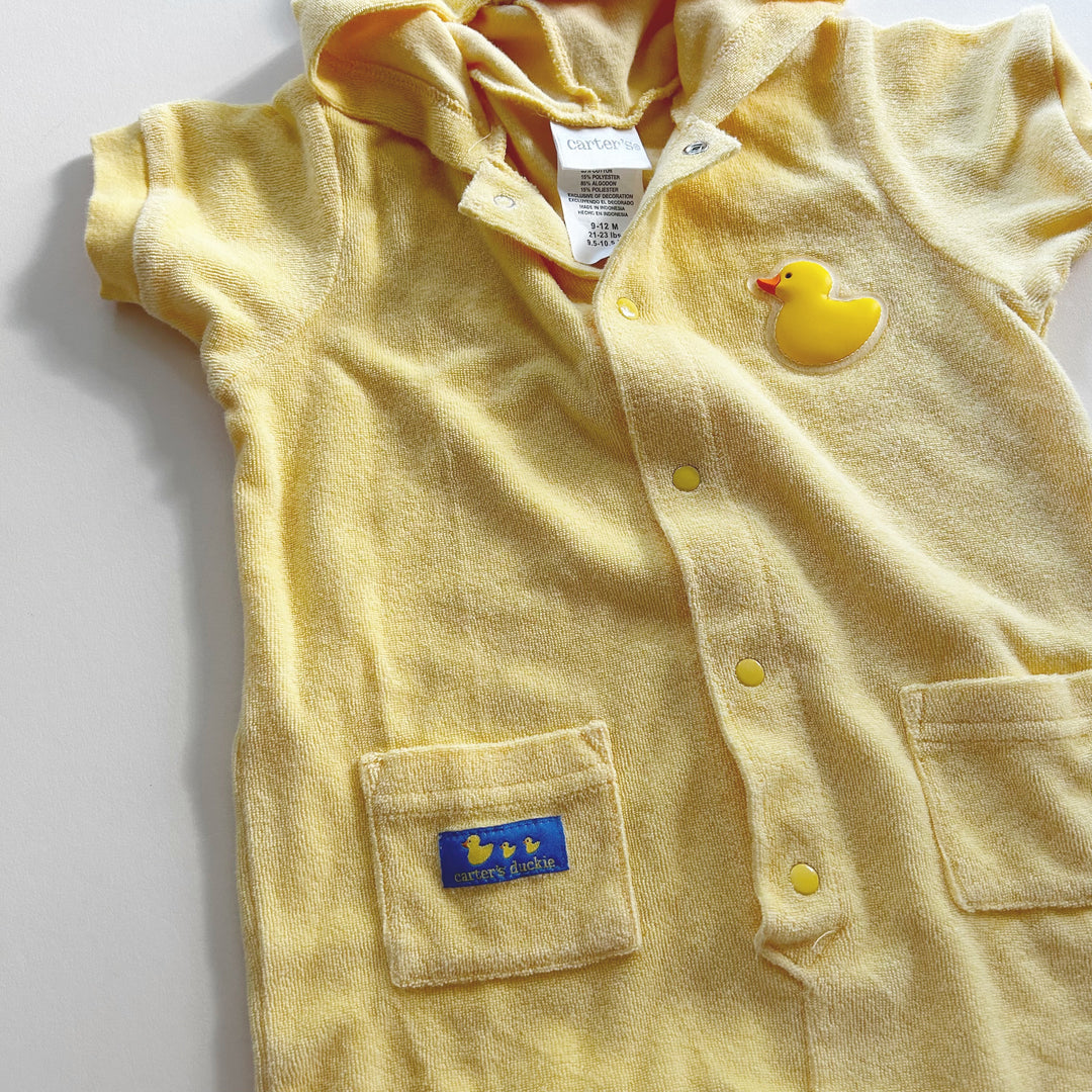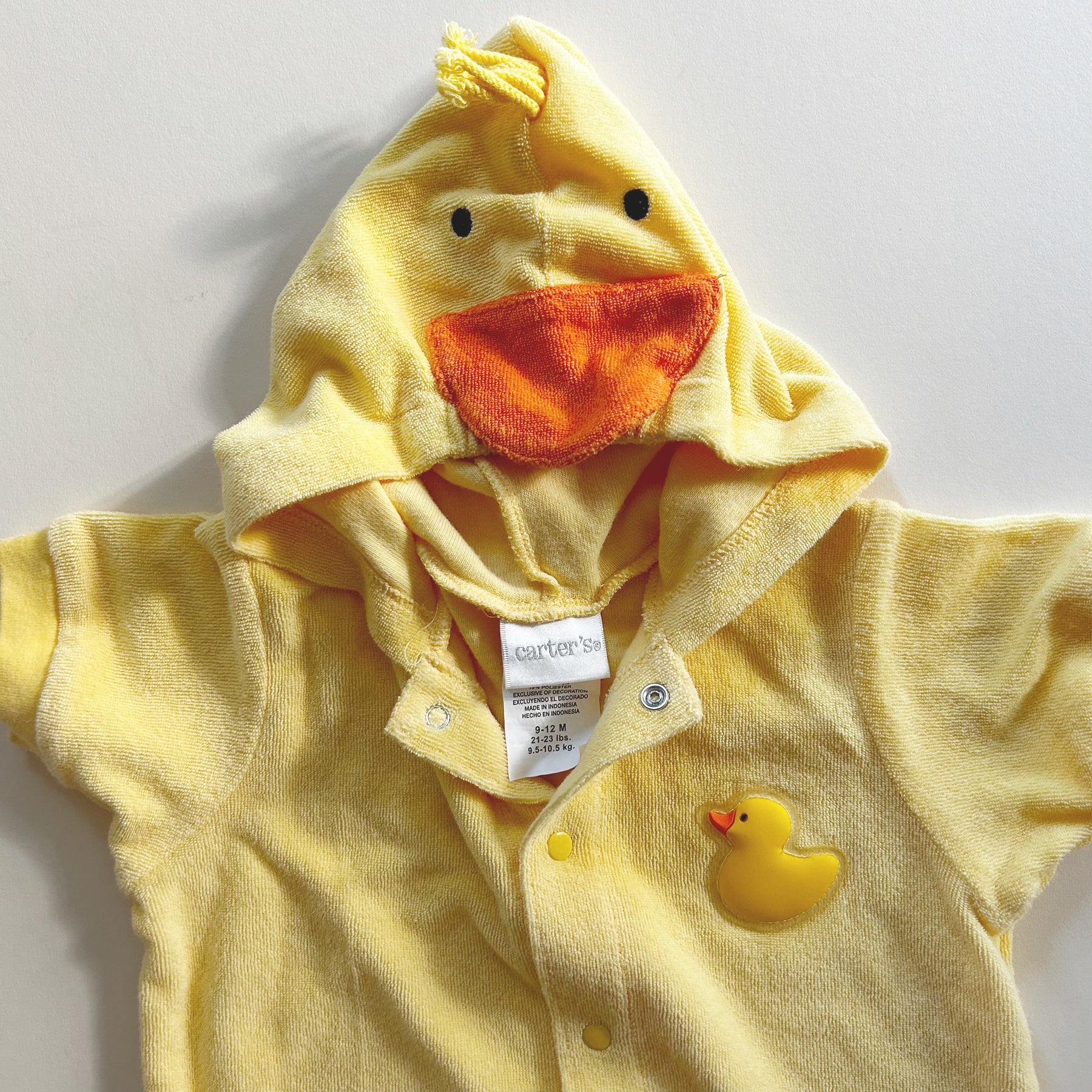 Retro yellow terrycloth romper from Carter's with duck hood and detail on chest. Good used condition wight light wear. Size 9-12 mo (measurements available upon request). Cotton/poly blend. Extremely adorable!