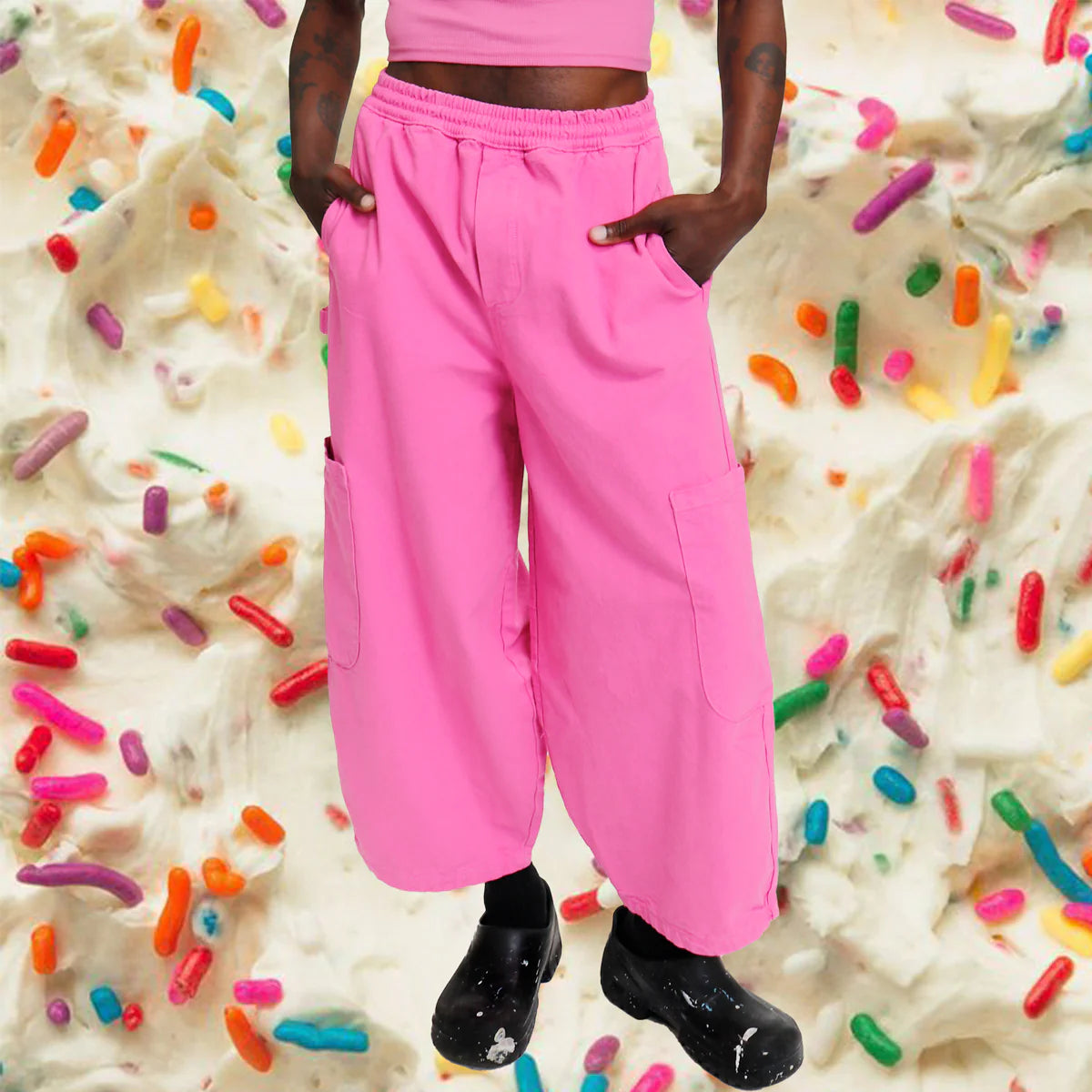 Cropped pant with 5 big pockets. Color is strikingly similar to a traditional Southern California pink donut box. Elastic waist + drawstring. Made in LA.