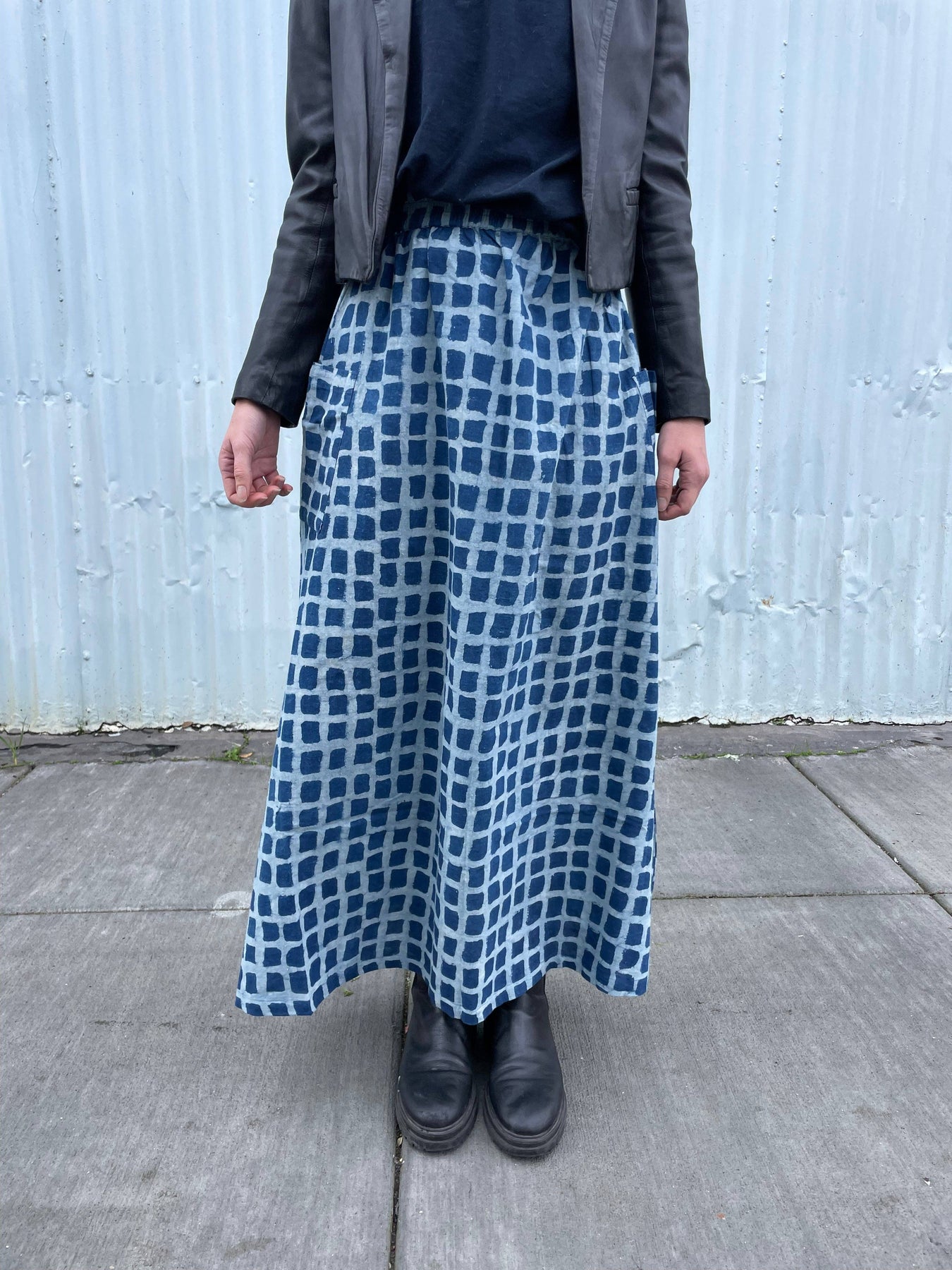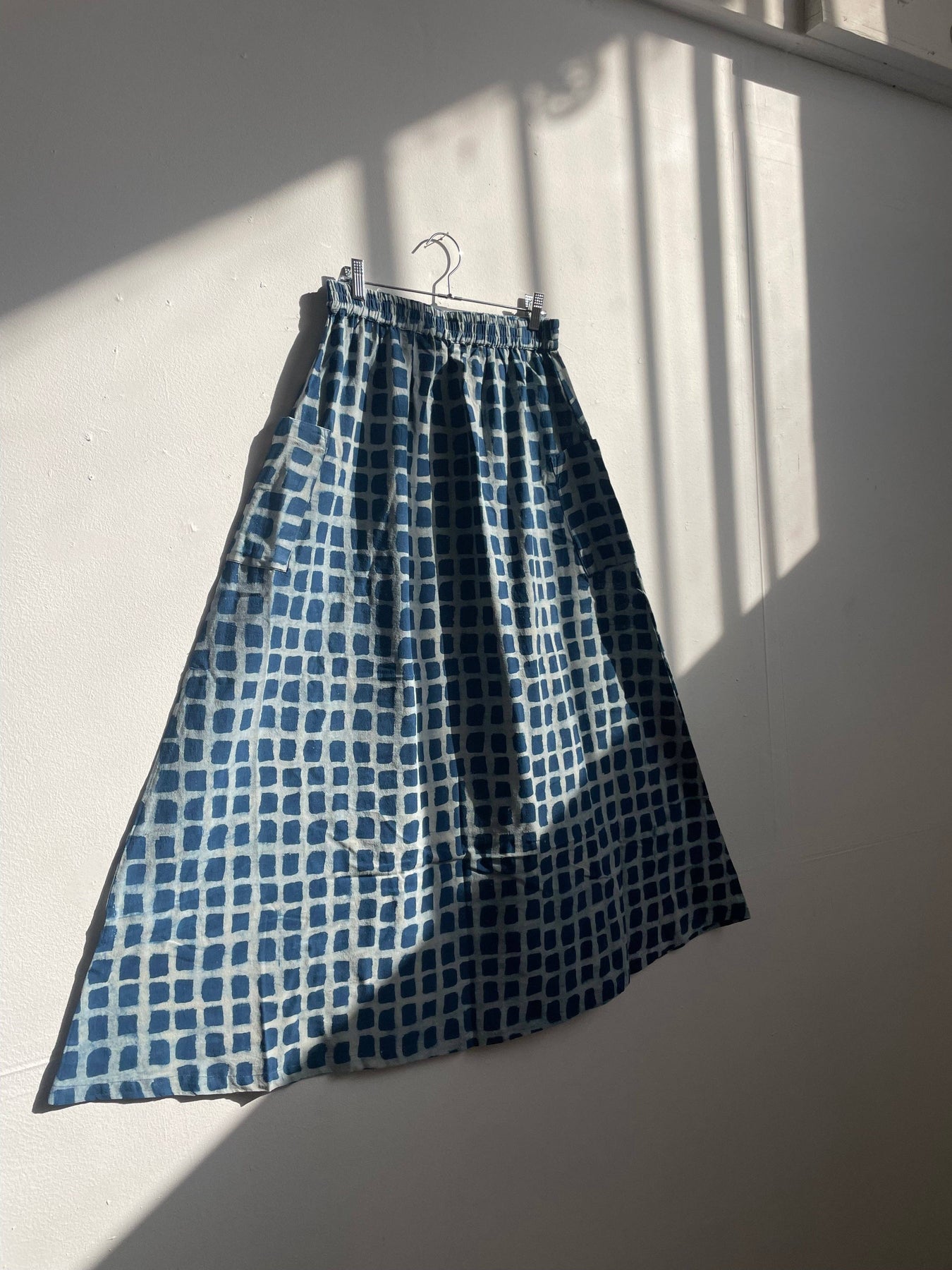 Skirt from size XS to XXL. 100% natural hand-woven cotton. Woven and Hand-block printed by our artisans in our cooperative in India. Dimensions: Total waist relaxed: XS (64.5cm/25.2in), S (69.5cm/27.1in), M (74.5cm/in), L (82cm/29.1in), XL (92cm/36.2n), XXL (102cm/40.1in) Length: XS (95.5cm/38in), S (67cm/38.5in), M (99cm/39in), L (100cm/39.25in), XL (101cm/39.5n), XXL (101cm/39.5n) Care: To maintain its beauty, cold hand wash separately. Refresh in a bath of gentle soap or gently use your hands to slightly rub. Use a natural detergent that does not contain citrus or other acidic oil scents. Machine dry on low or hang dry out of direct sunlight. This product has been dyed or block-printed using ancient techniques. Colors may gradually change over time.