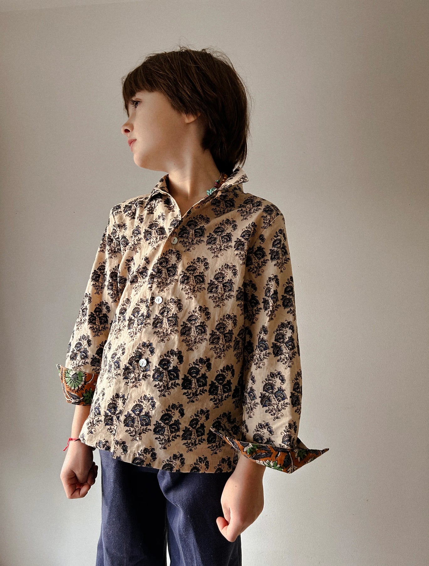 Originally inspired by a 1960’s pajama top the Hill Top has become a closet staple. Gender neutral by design with beautiful shell buttons. This year Home Brand decided to add a yoke and locker loop for easy hanging. The interior yoke and cuffs are patchworked with our Sailor Floral print so when you roll the wrists there is a little surprise.