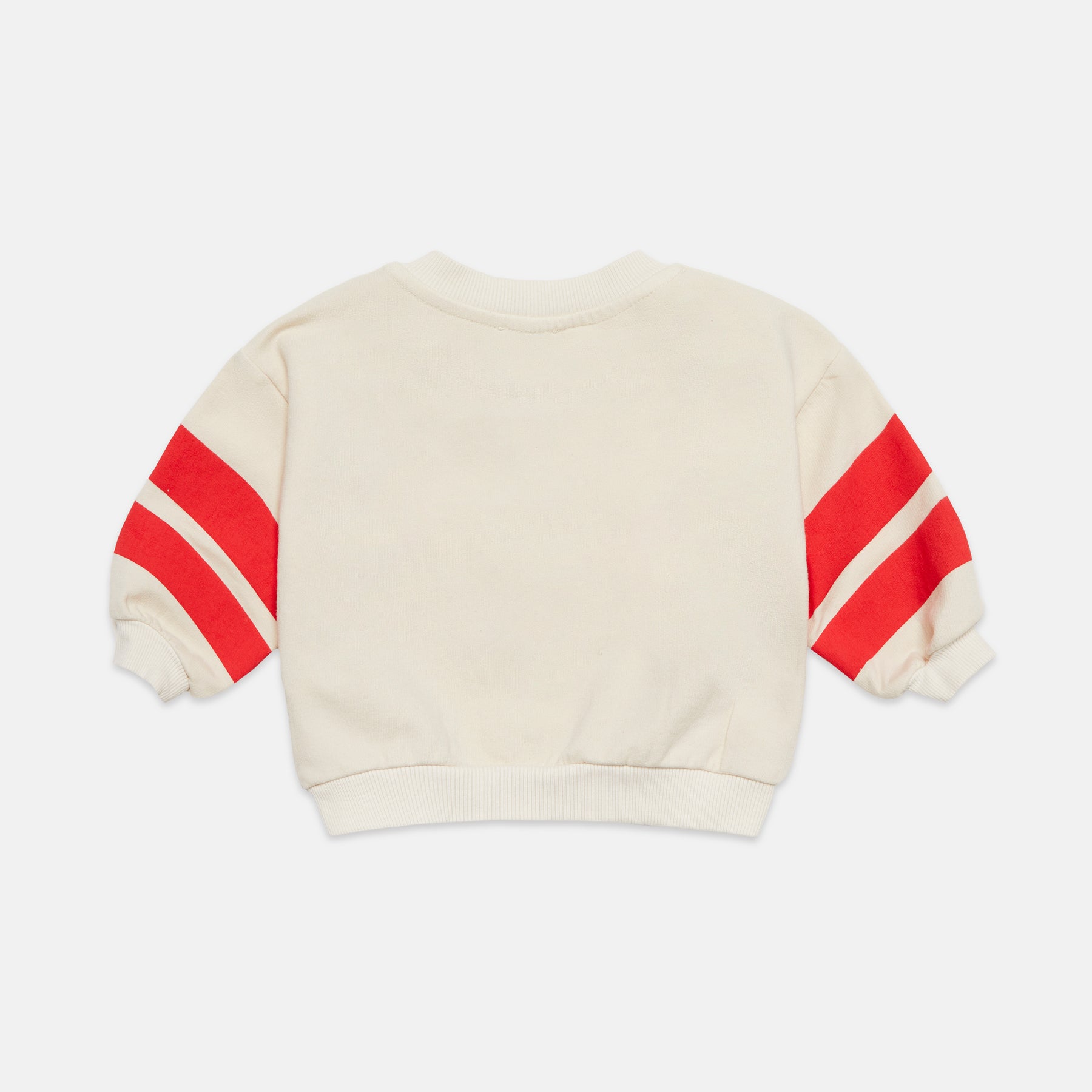 Cotton baby sweatshirt with an apple graphic at the front and contrast stripes at the sleeves. Snap buttons at the shoulder for easy dressing.