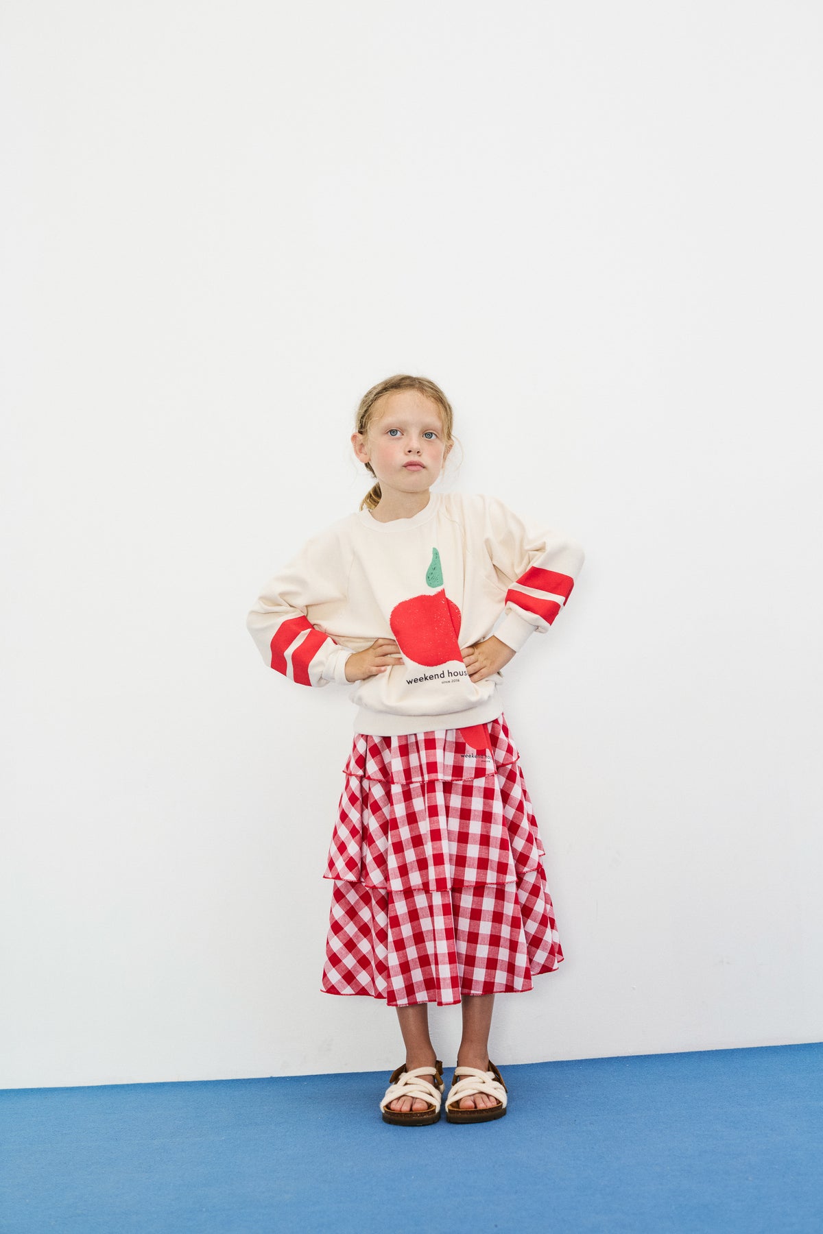 Tiered cotton skirt in a red gingham check with a playful apple print detail. Elastic waistband and three layered ruffles for a full, swishy silhouette.