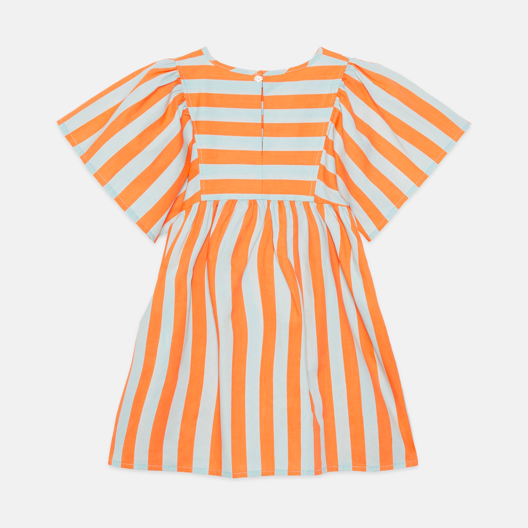 Lightweight cotton dress with bold orange and soft blue stripes. Features flutter sleeves, a gathered waist, and a small house patch at the chest.