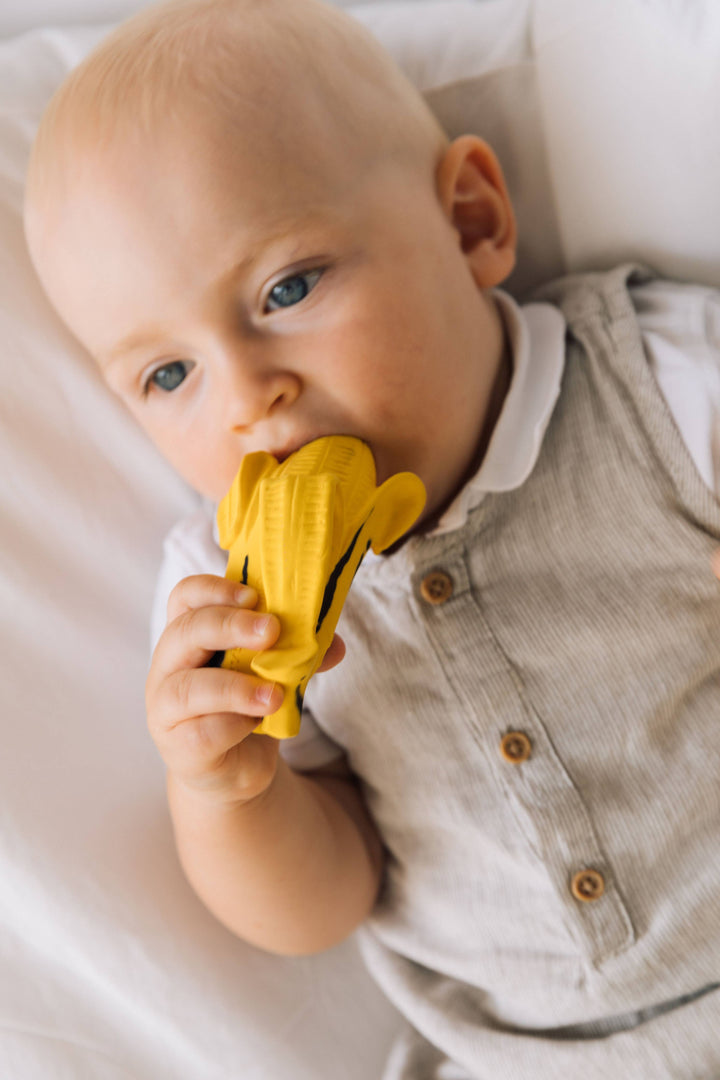 This edition of Ana Banana in Pop Art style is perfect for introducing kids to the world of art and creativity. Made from 100% natural rubber and hand-painted with natural pigments. Ideal as a teether, bath toy, and sensory plaything. Its vibrant colors, intricate textures, and ergonomic shape will stimulate babies' senses while soothing their gums during teething! Soft and flexible for easy grasping by baby's hands, and also designed for hanging. Introduce kids into the art world while chewing on this realistic teether!