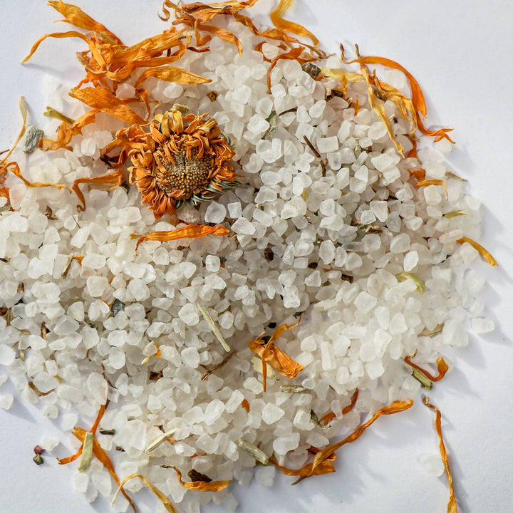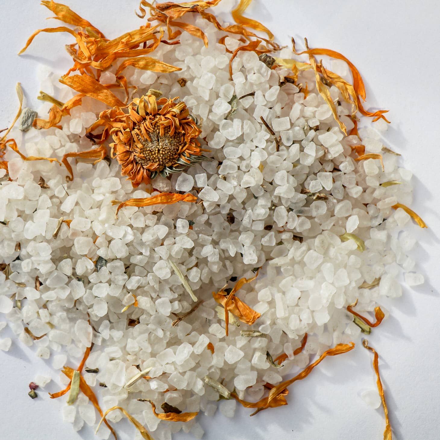 Formula: Pure Ocean Sea Salt, Dried Calendula Flowers, Echinacea Root, Echinacea Leaf, Oregon Grape Root, Marshmallow Root