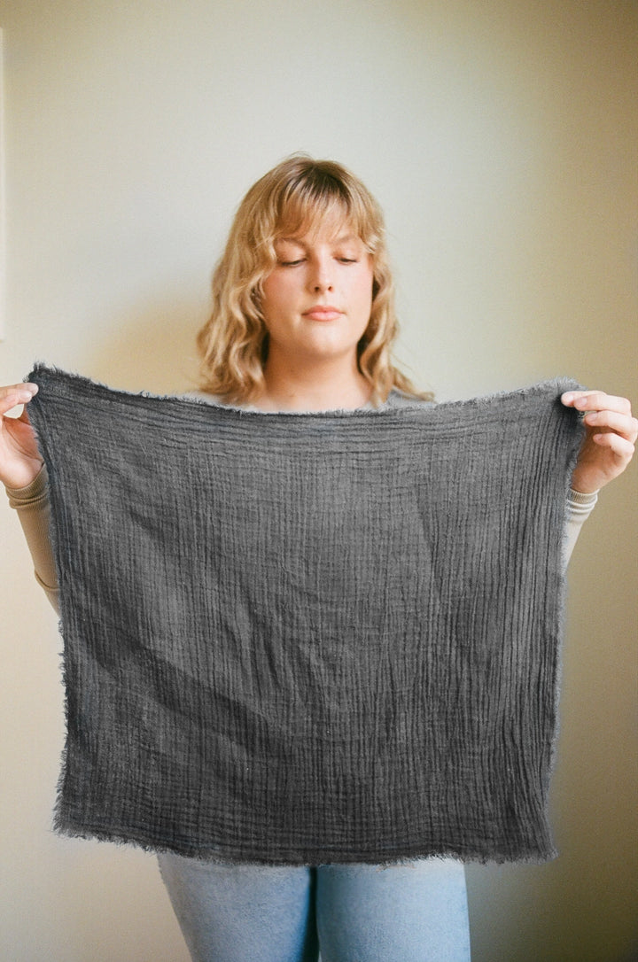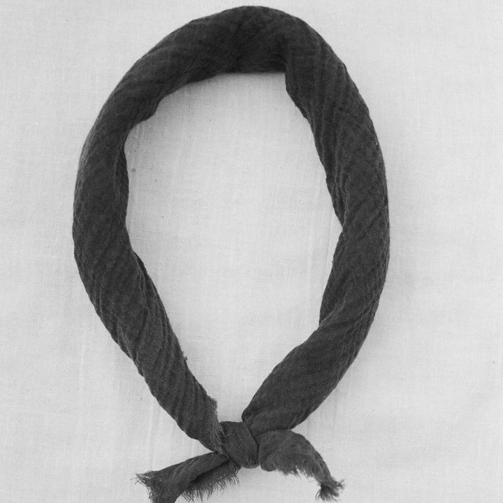 100% GOTS certified organic cotton double gauze with raw edges. Made from 100% GOTS certified organic cotton double gauze with raw edges, each bandana is hand dyed with pomegranate rind and iron. Whether you wear it around your neck as a bandana or your head to keep your hair back, this bandana is versatile and chic. Plus, it's also a great option for your furry friend! Each piece has natural variations and light mottling effects that add texture and an organic feel.