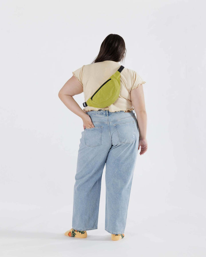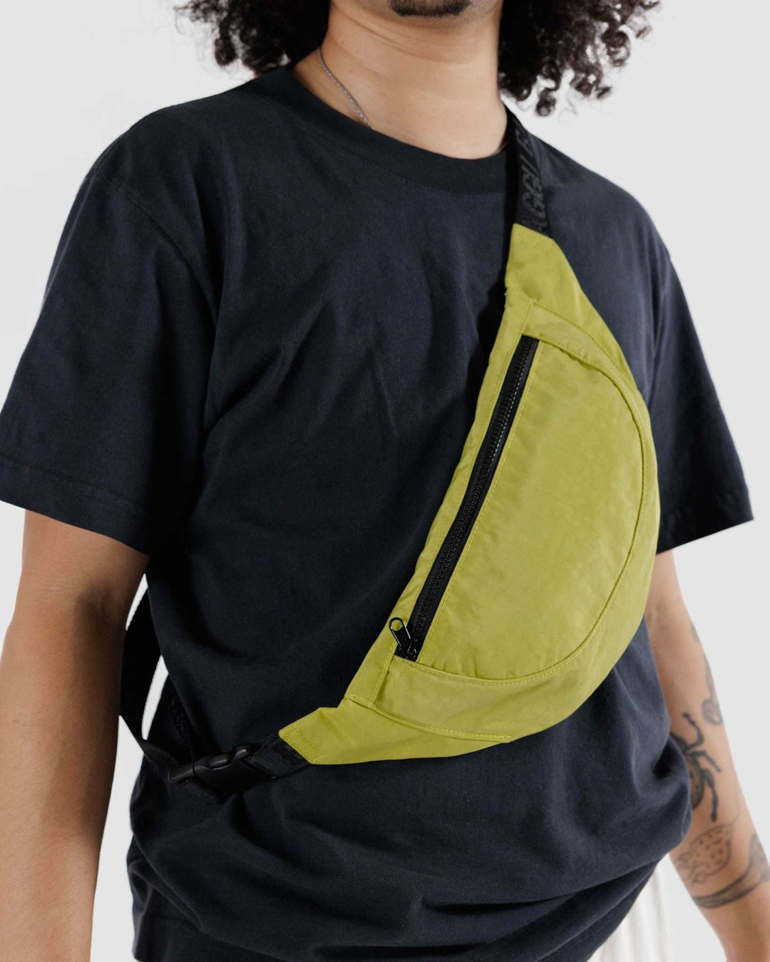 A slouchy, softly structured nylon bag with an adjustable strap. Interior zip pocket with a magnetic closure.