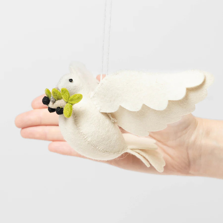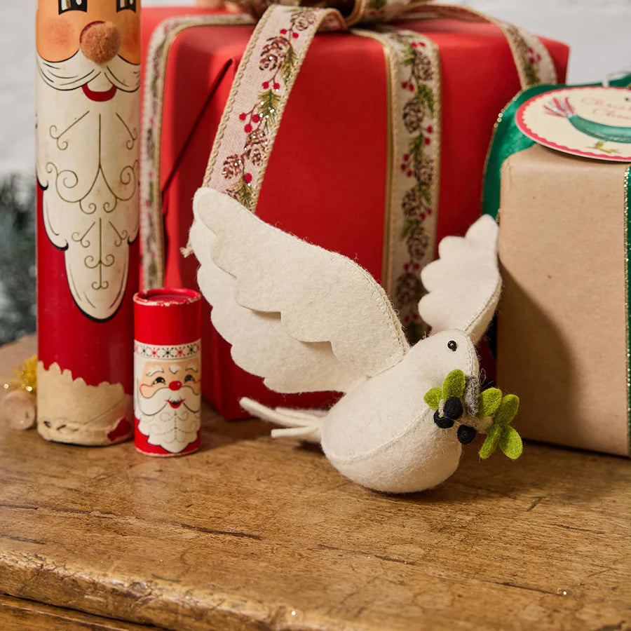 Bringing Peace to earth, this special felt dove spreads its stunning wings and flies. A beautiful reminder of the true meaning of the season. Hang it in a doorway or window. It also looks lovely perched on a Christmas tree.