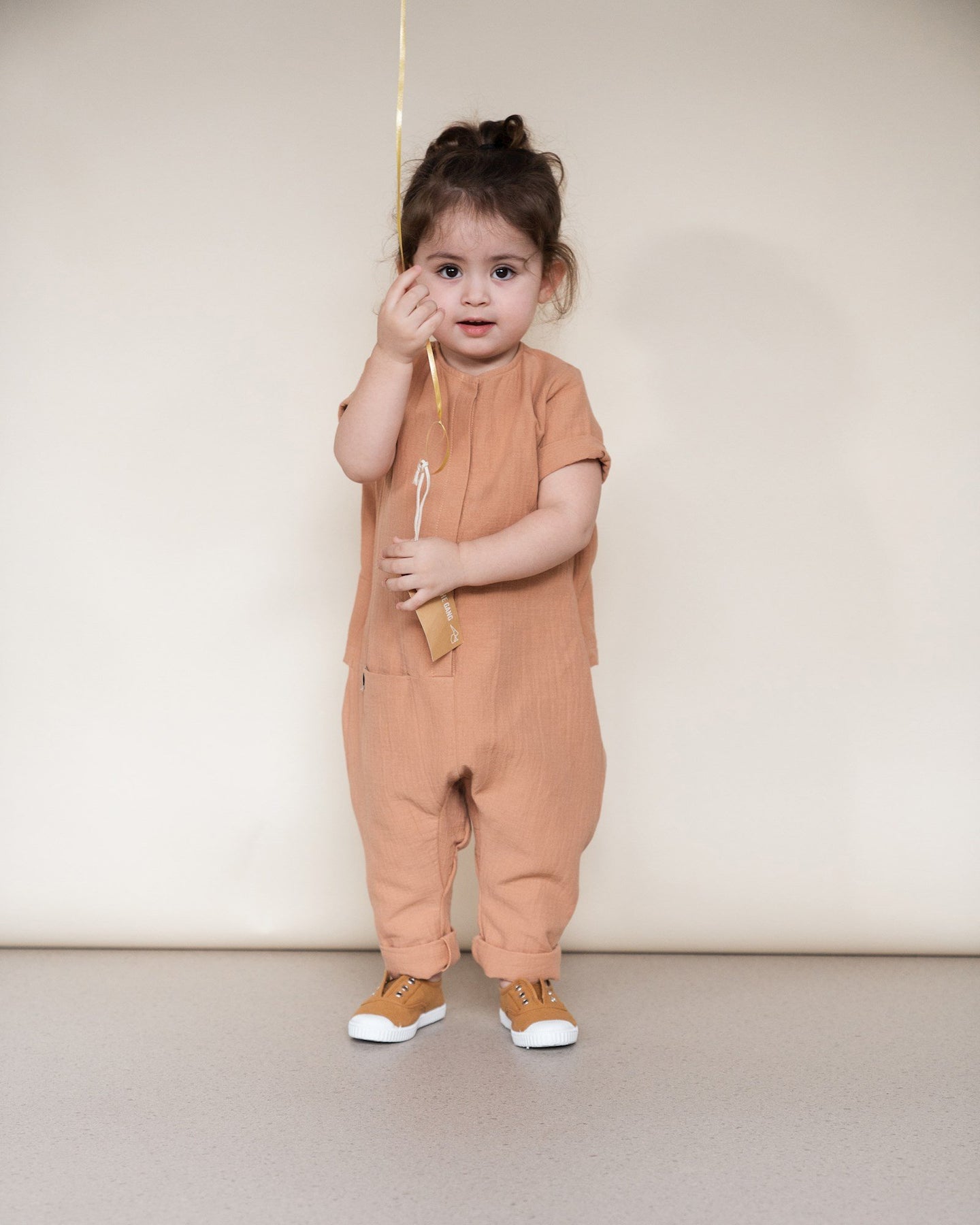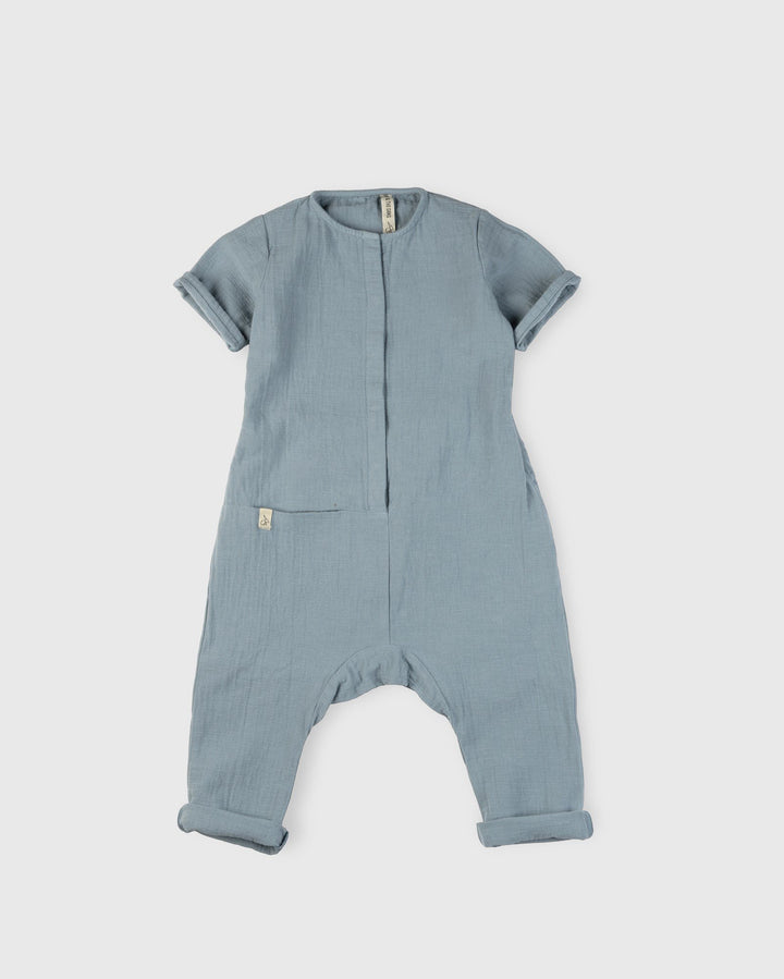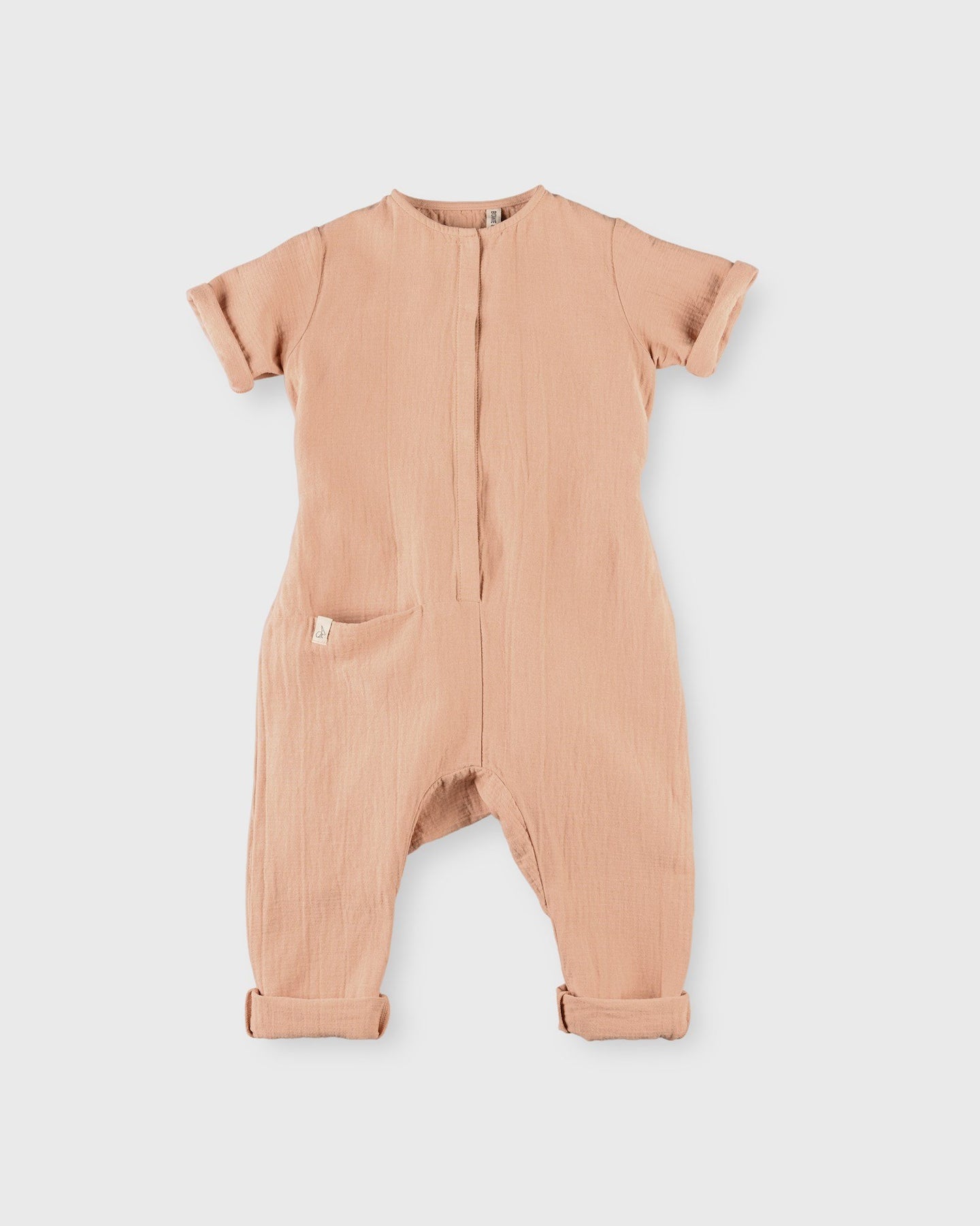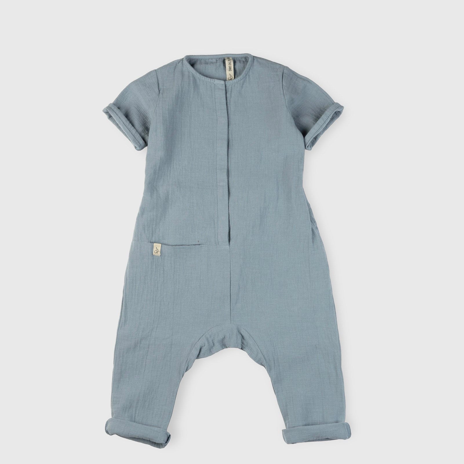 Summer jumpsuit with snap fasteners at the front and elastic open back for an easy diaper change.