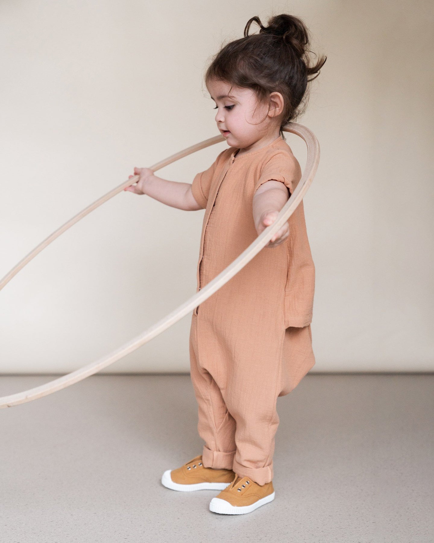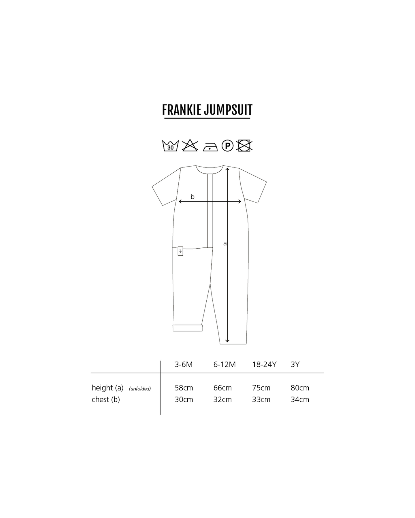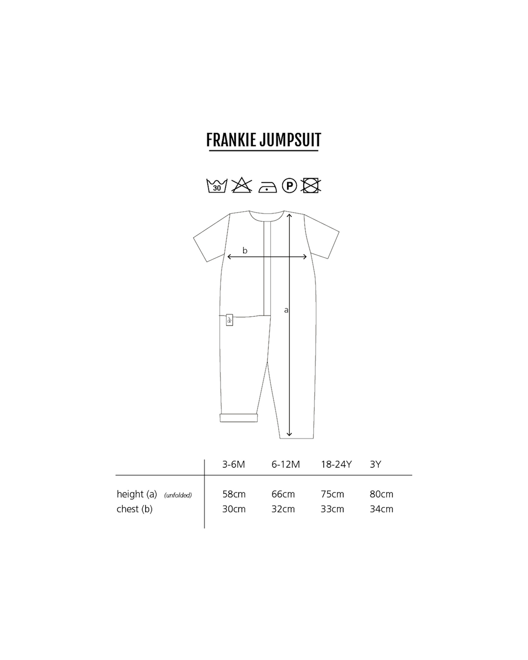 Summer jumpsuit with snap fasteners at the front and elastic open back for an easy diaper change.