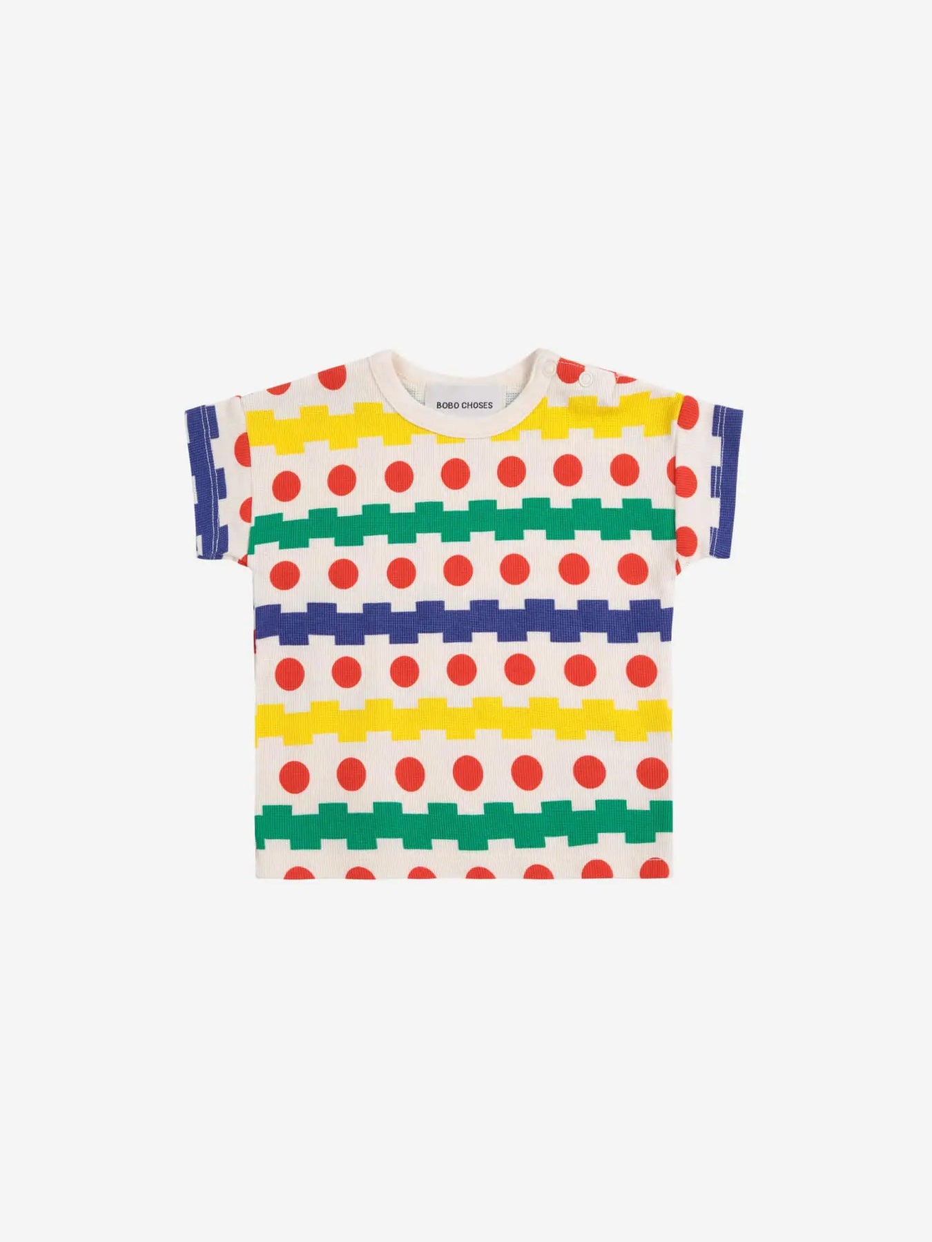 Playful and full of character, this multicolor t-shirt inspires joy and creativity. Made from 100% organic cotton, its soft fabric is gentle on the skin, offering breathable comfort. Designed with short sleeves, a dropped shoulder, and a loose fit, it’s both fun and functional with its shoulder snap fastening. Thoughtfully made in Spain with care for the future.