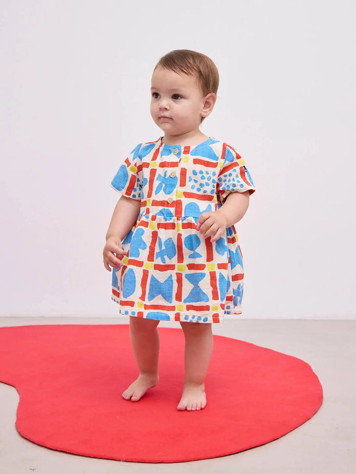 Vibrant and versatile, this multicolor dress inspires joyful exploration. Made from 100% organic cotton, it features short sleeves, a dropped shoulder, and an evasé fit for effortless movement. Gathering details, embroidery, and a round neck add charm, while the front button fastening ensures ease of wear. Thoughtfully crafted in Spain.