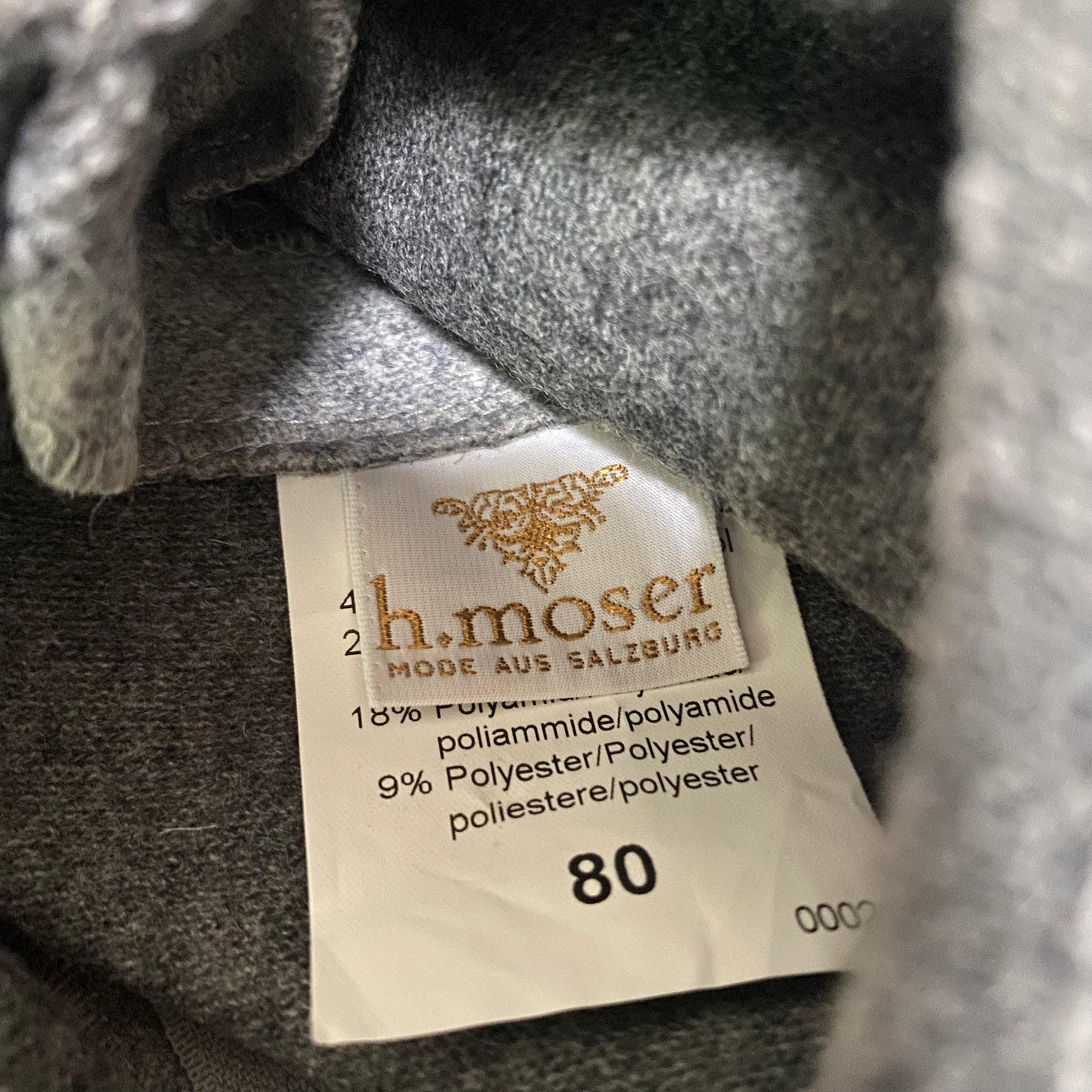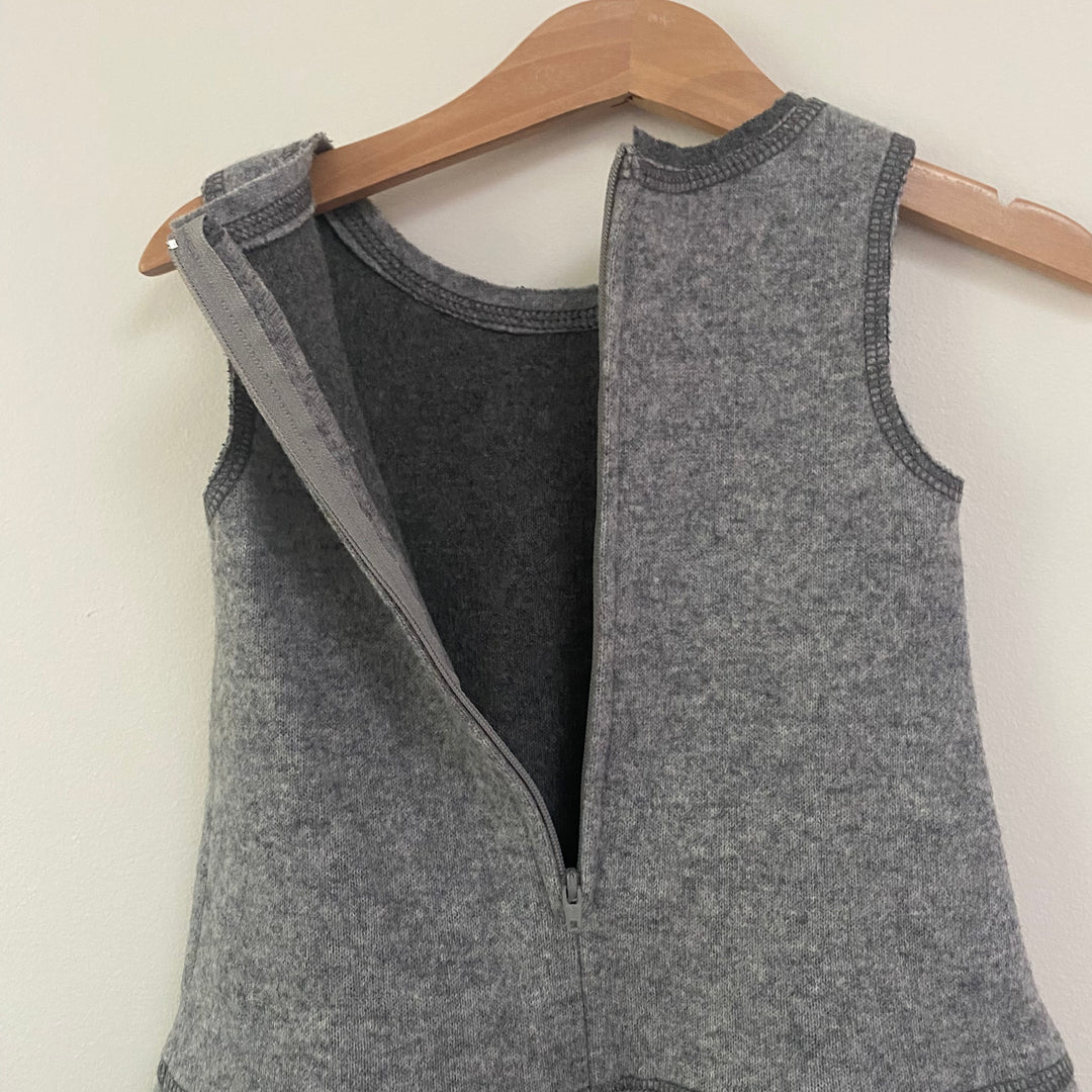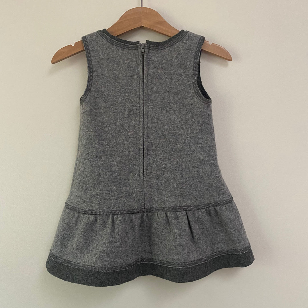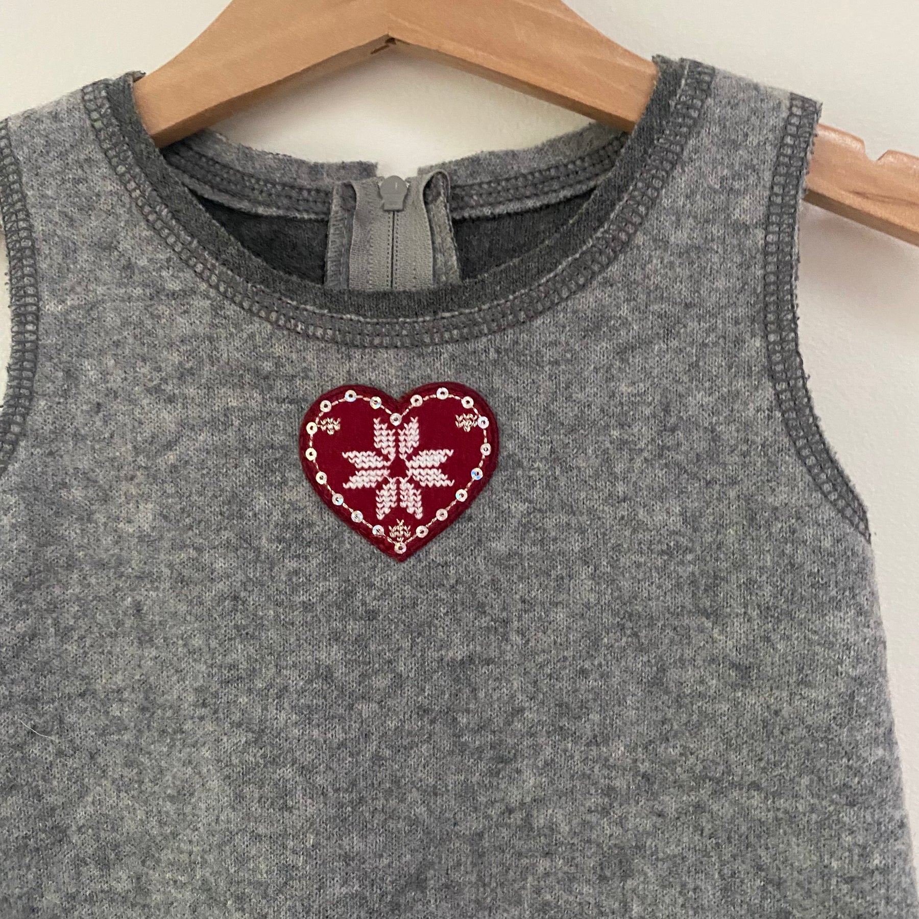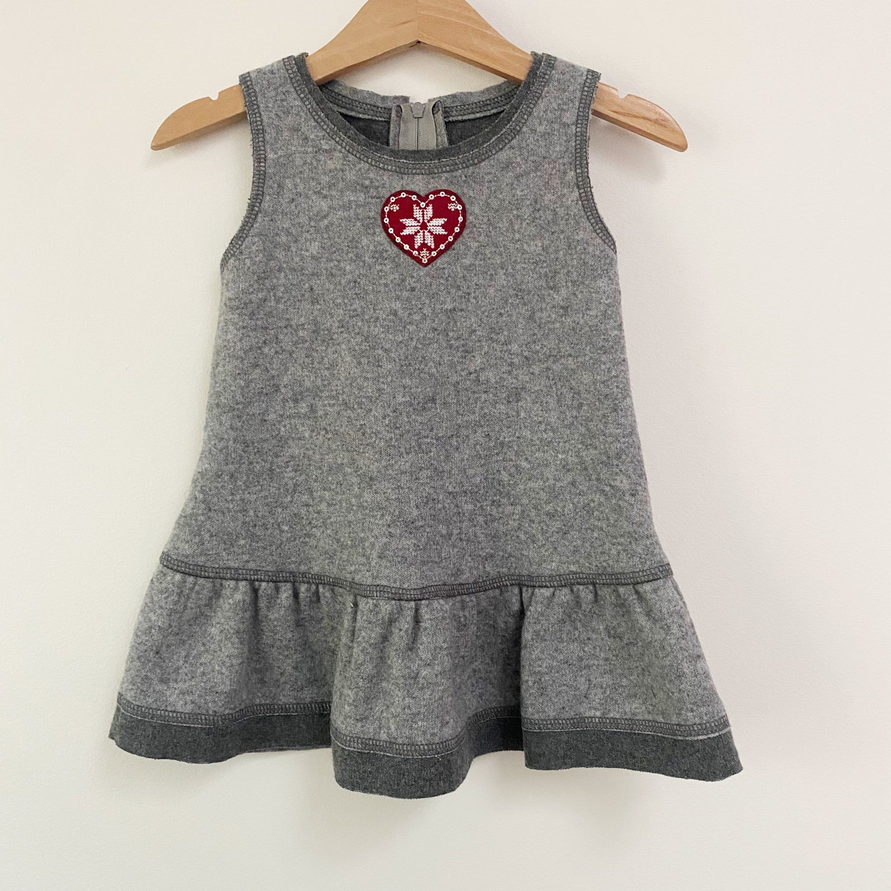 Wool blend jumper dress from Austrian-based H. Moser. Light grey with red/white decorative heart on center front. Size 80, or approx 12-24 mo (17" length, 9.5" pit-to-pit). Made in Europe.
