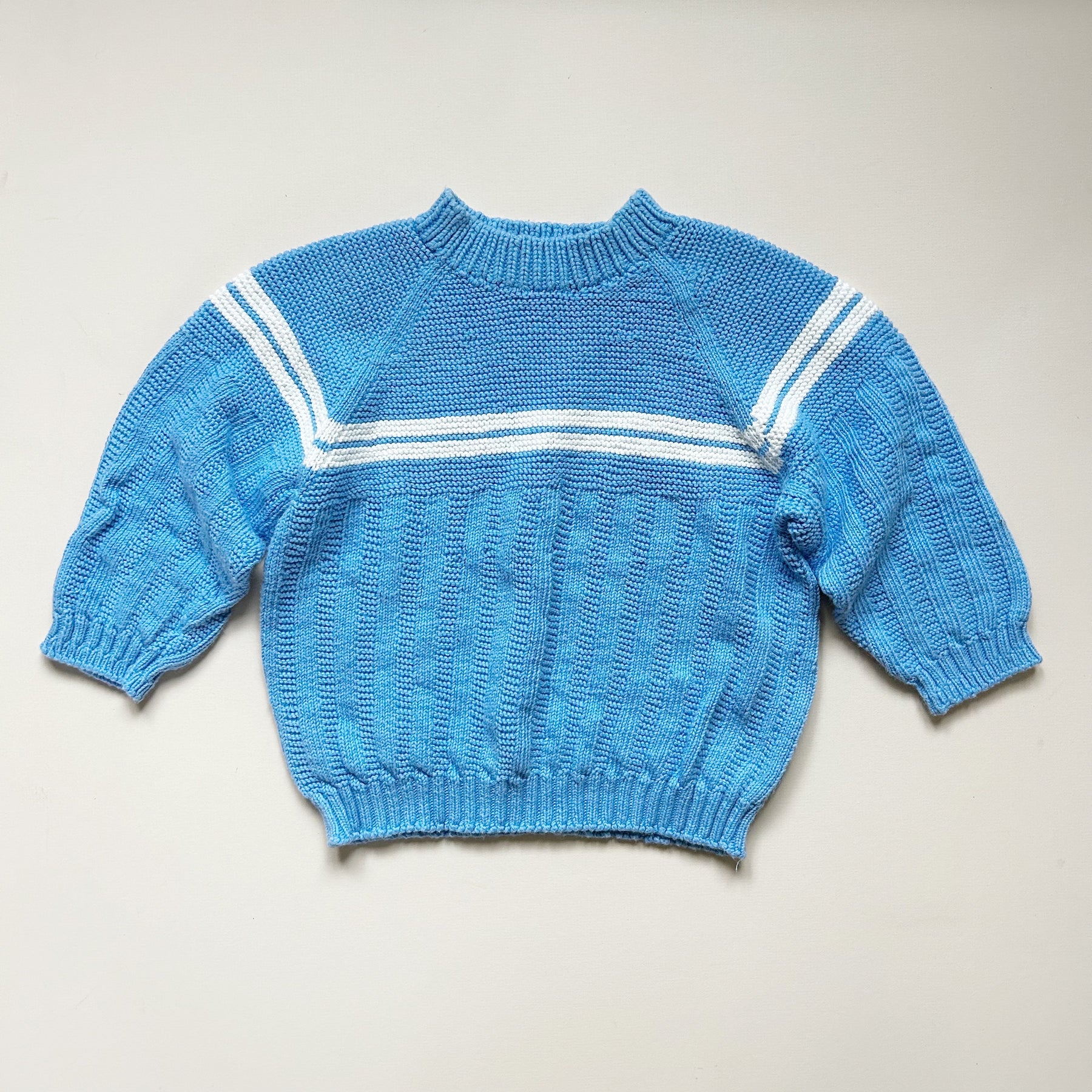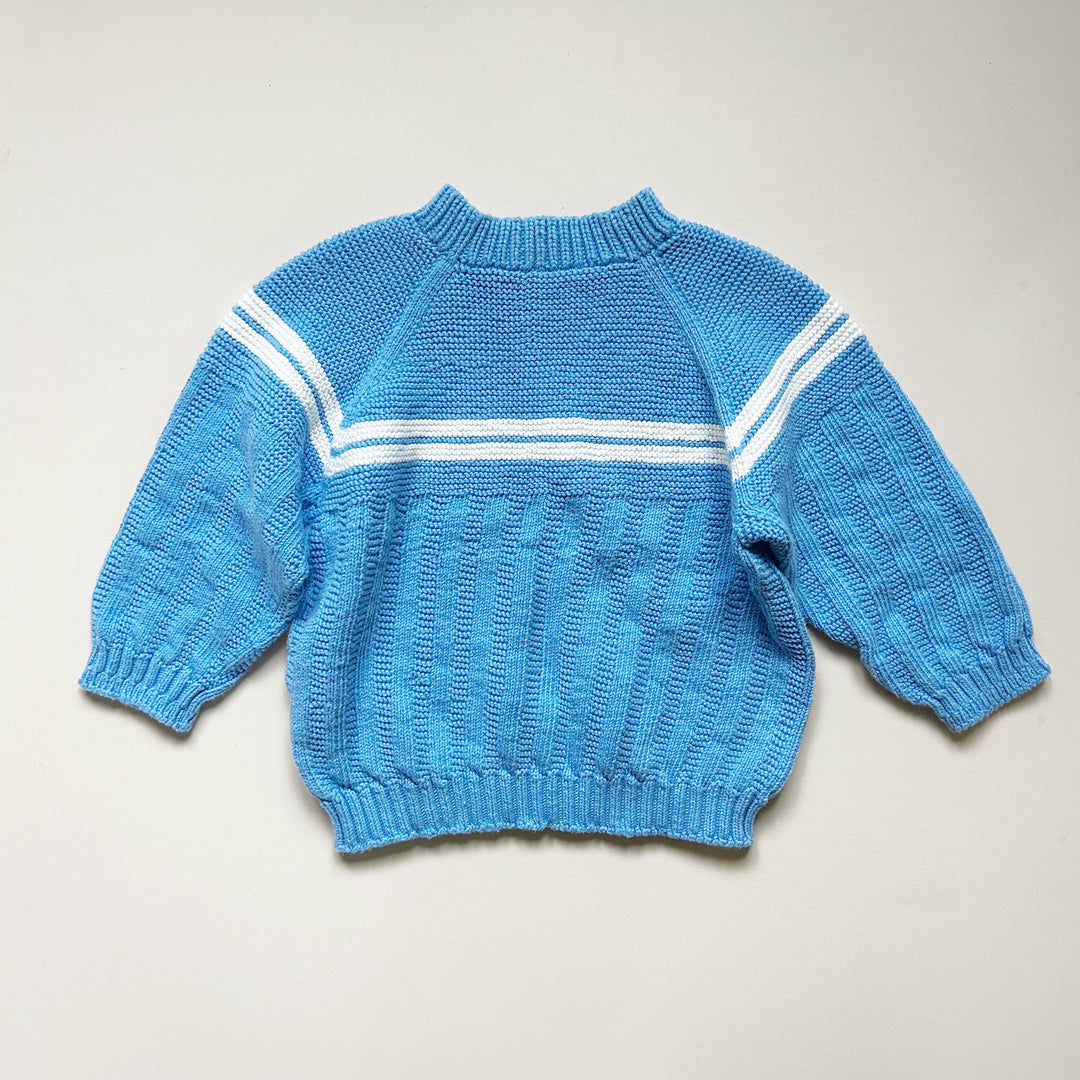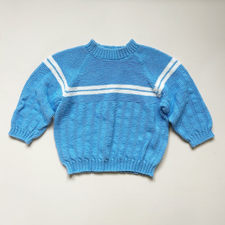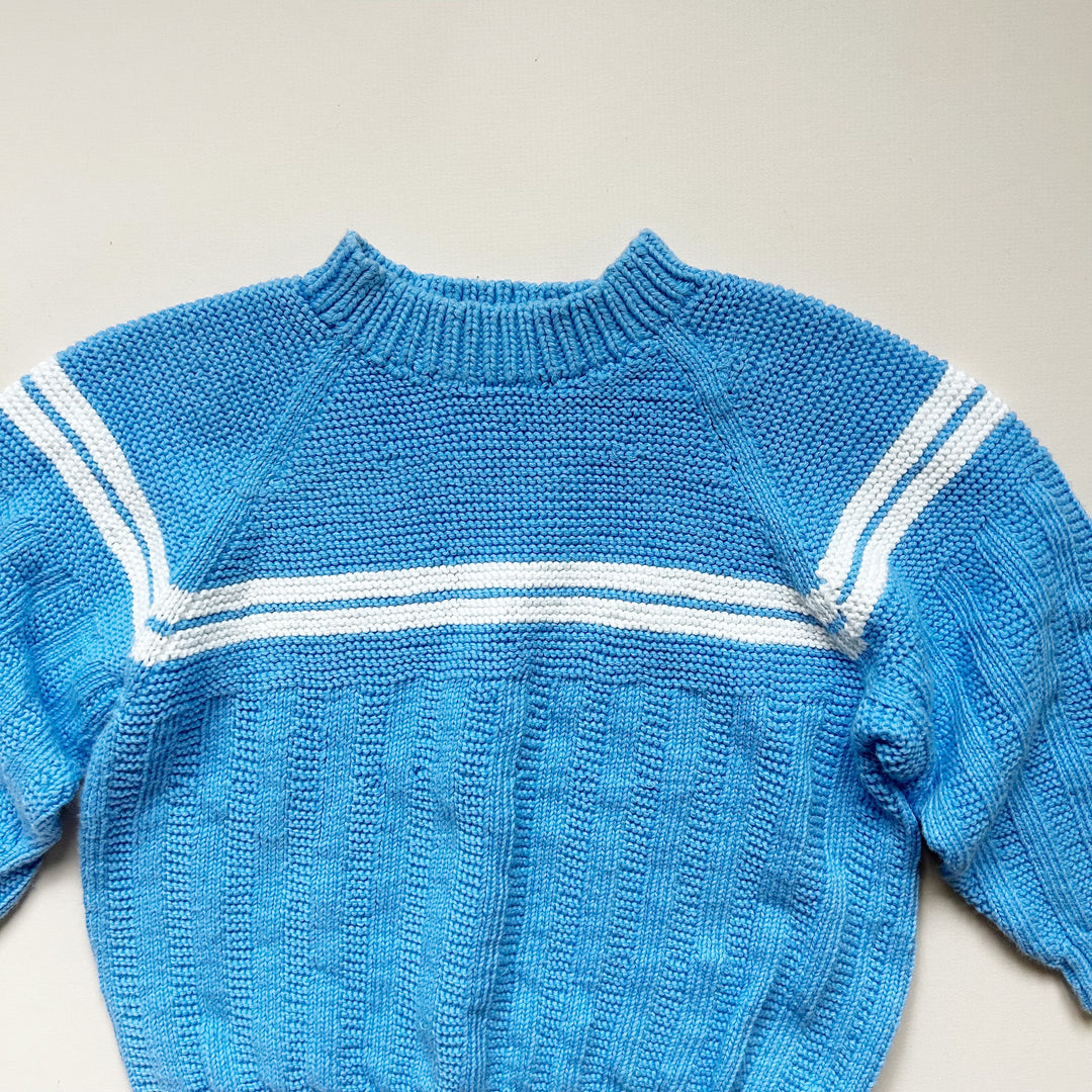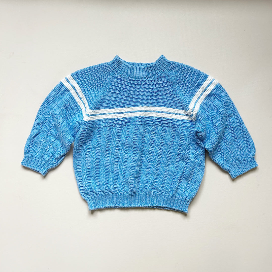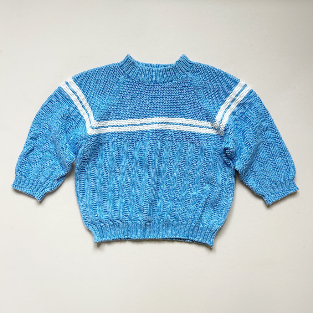 Handknit sweater in blue with white stripe detail. Good used condition with light wear. Size approx 24 mo -- please see measurements (13" length, 15.5" sleeve length). Feels like cotton.