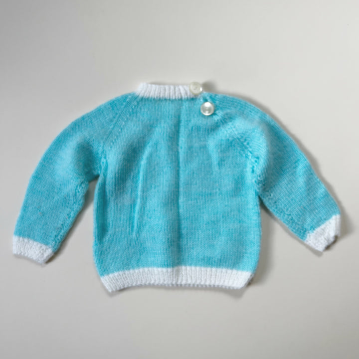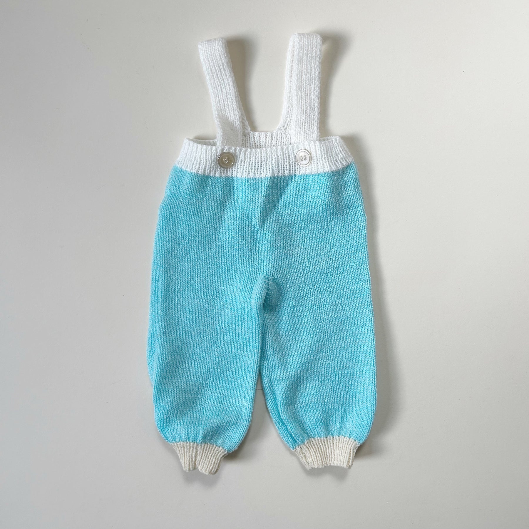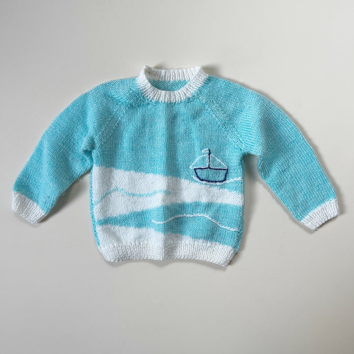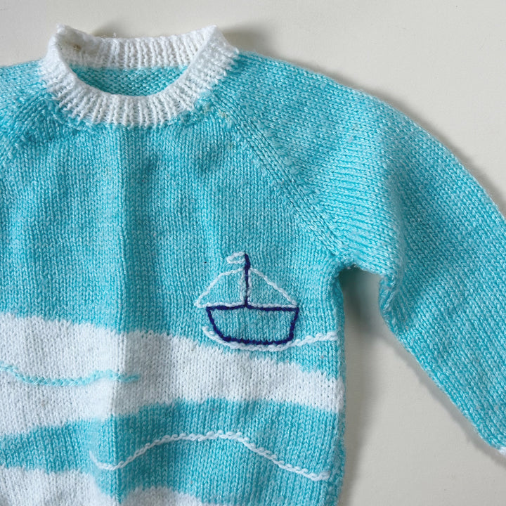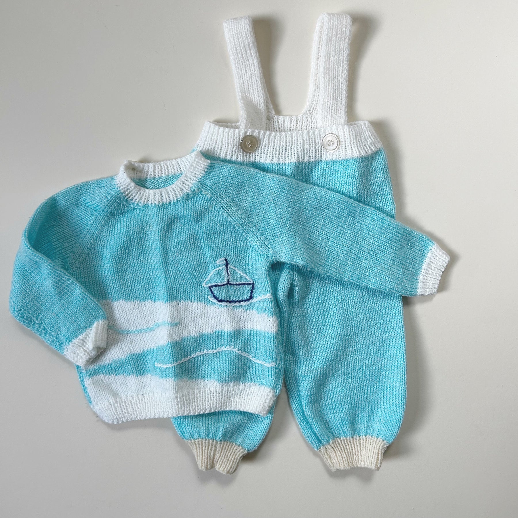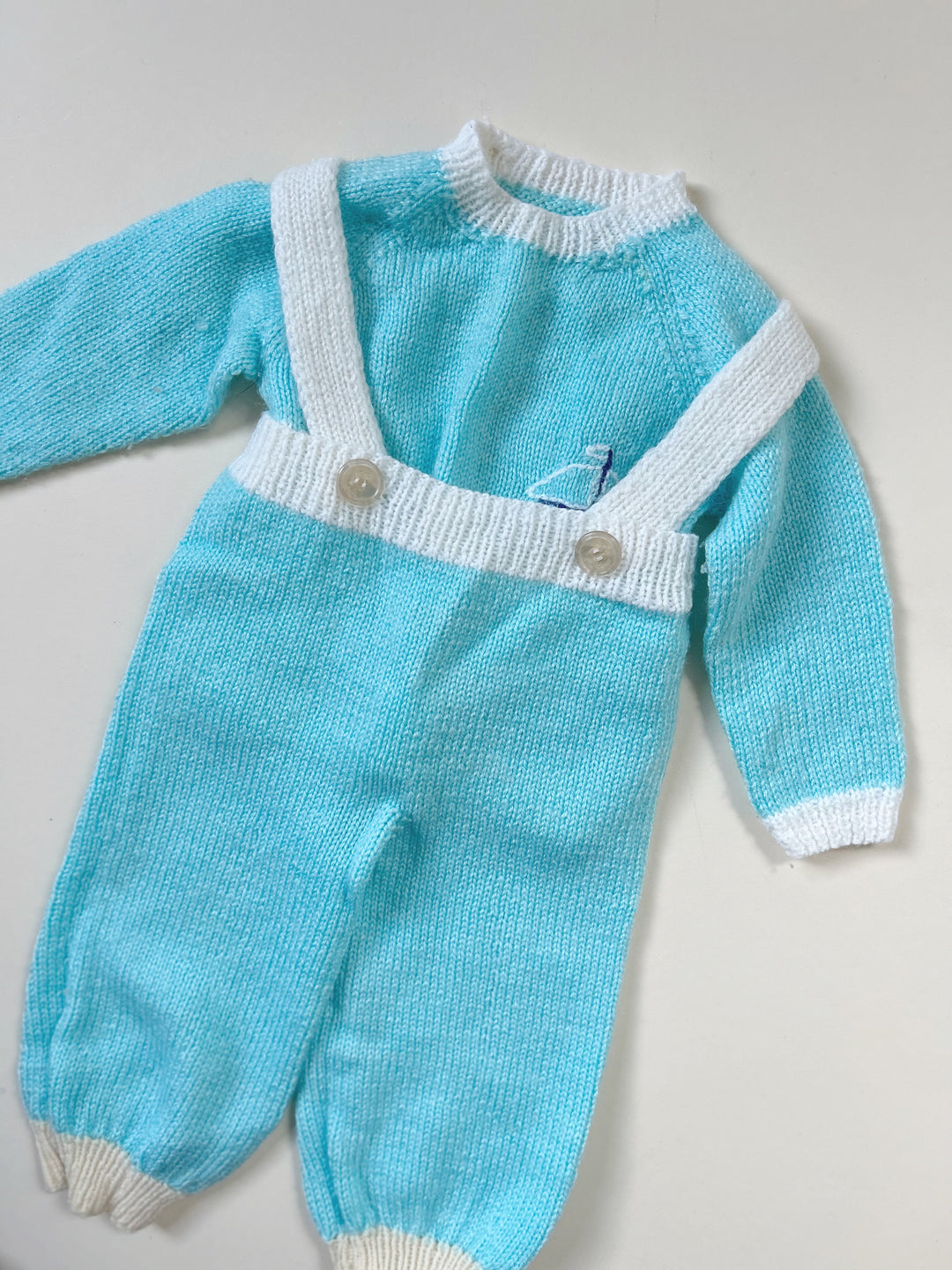 The sweetest handmade overall and sweater set! Light blue and white, sweater features sailboat detailing on front. Overalls have button straps for easy on/off.