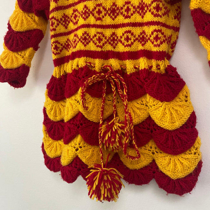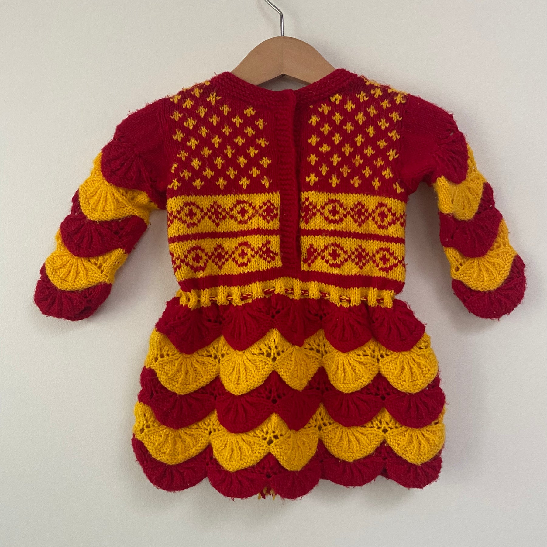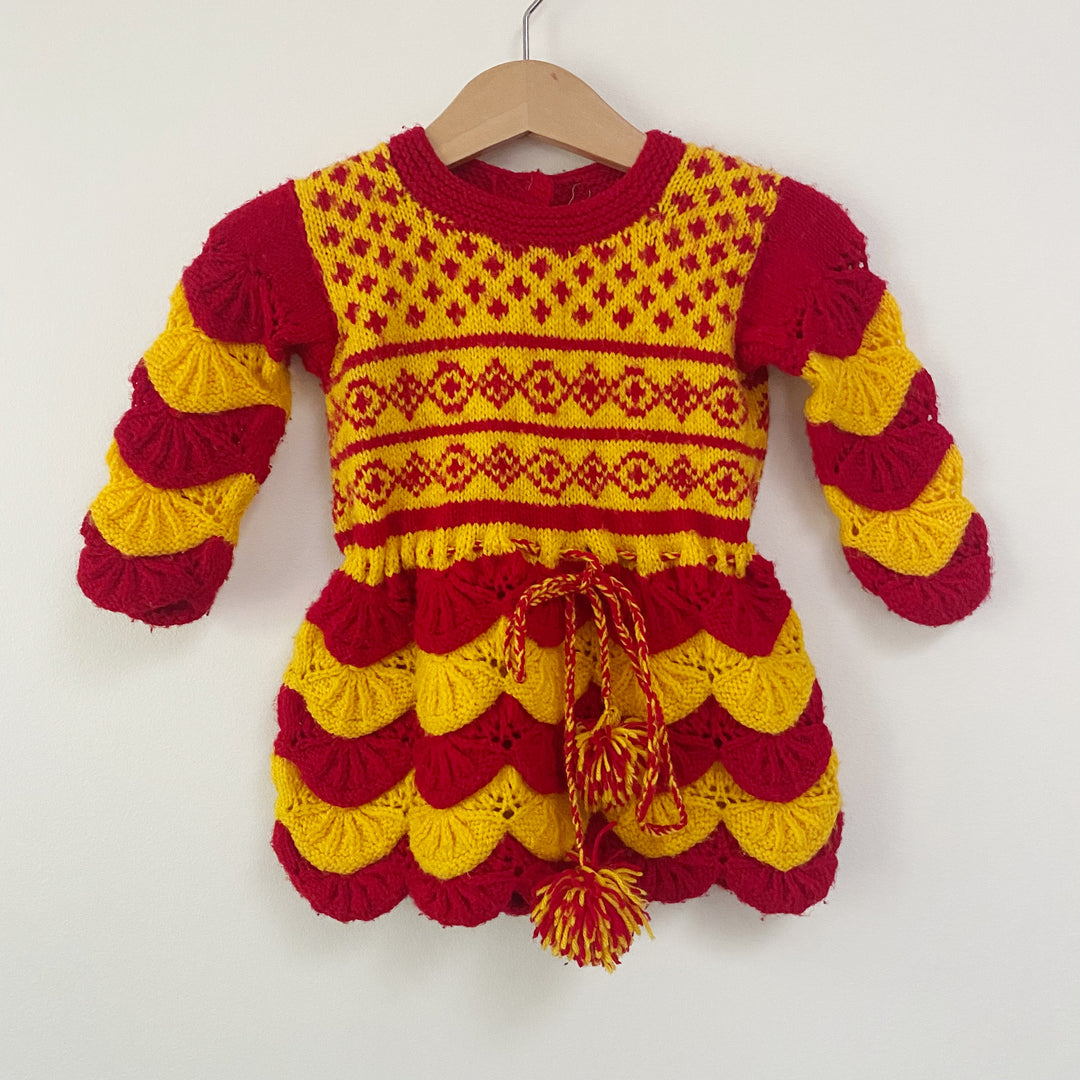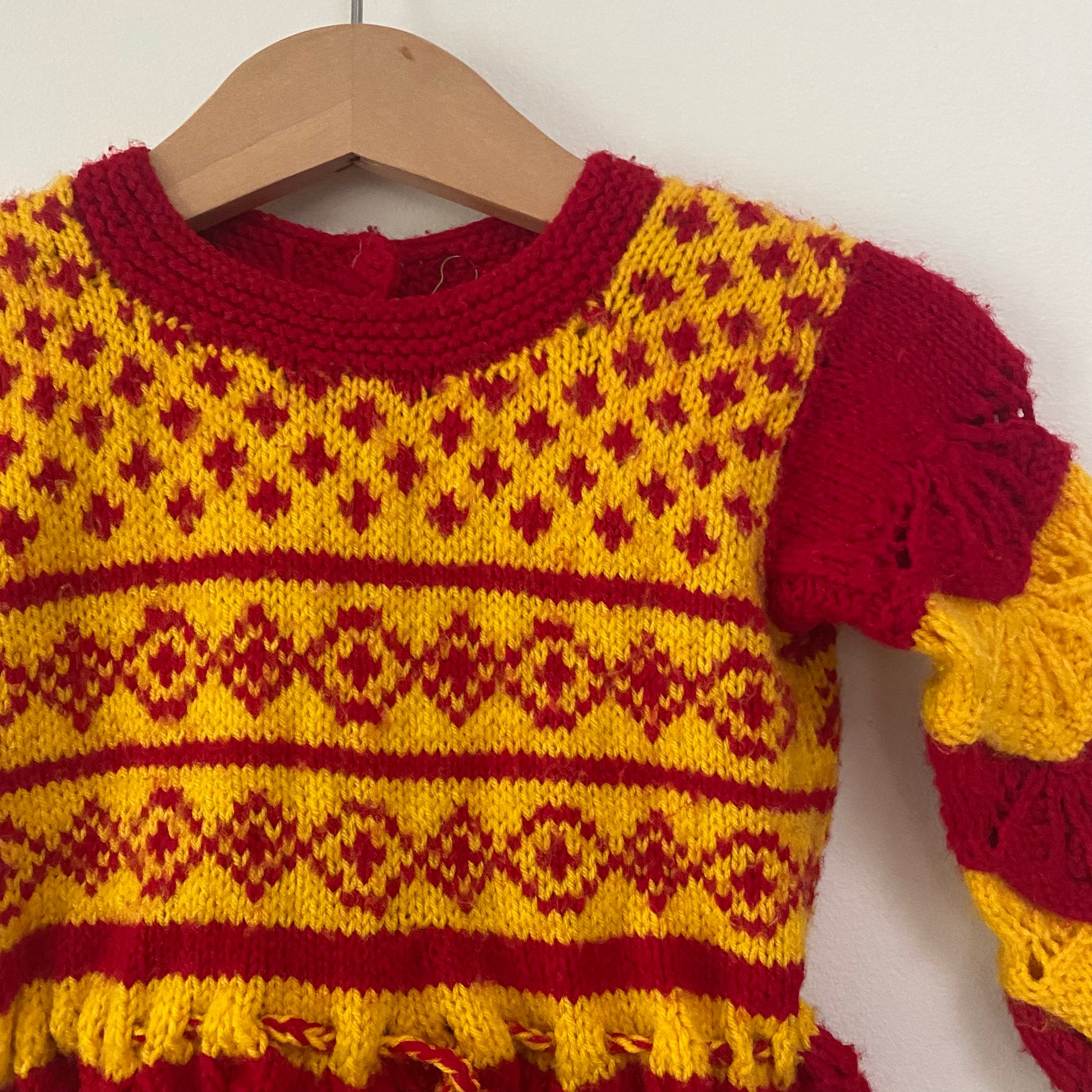 Handmade knit dress with bold red and yellow design. Acrylic. Size roughly 3-6 mo but please check measurements (14.5" length and 9.5" pit-to-pit). Good used condition for some wear to the knit.