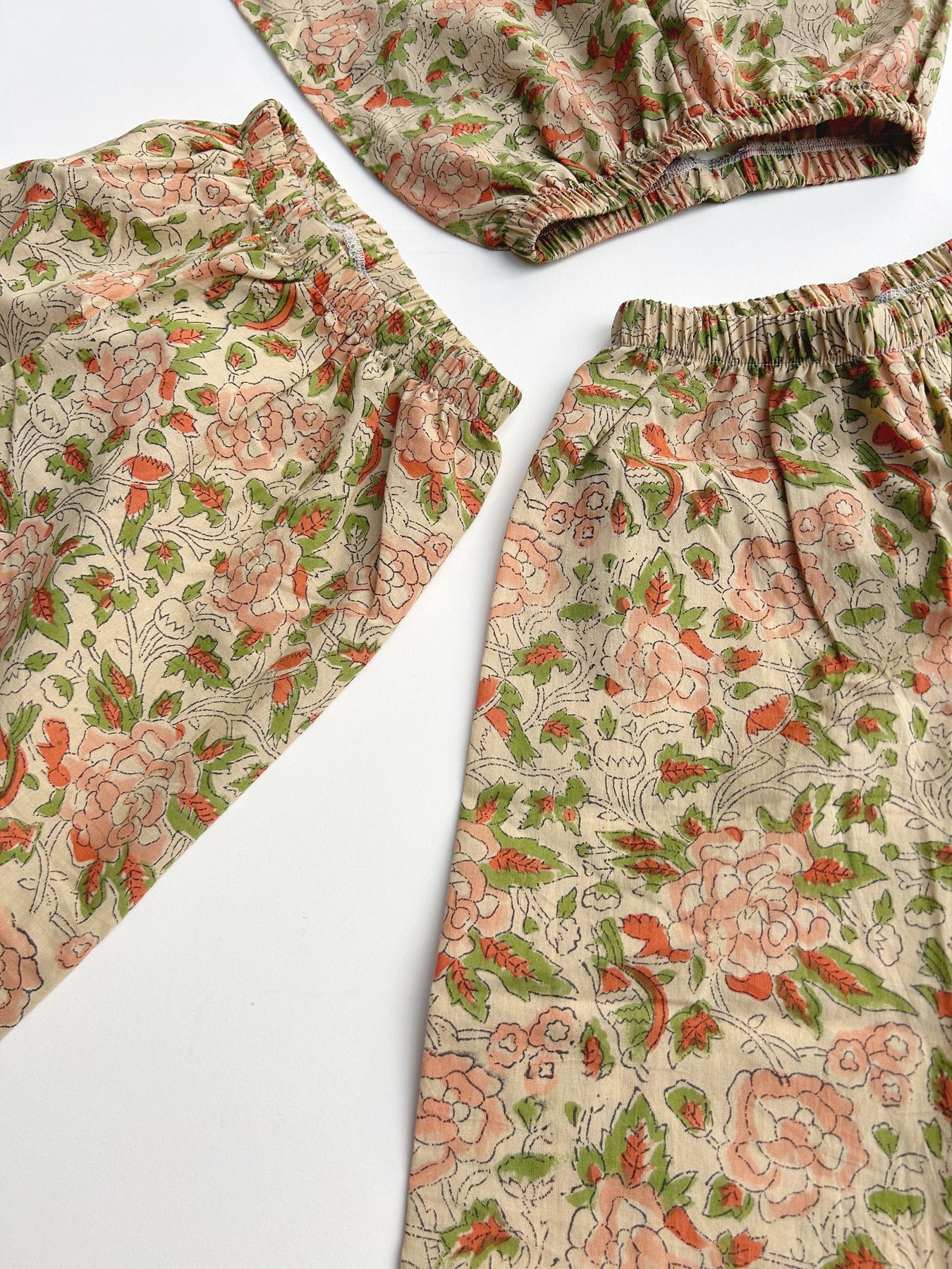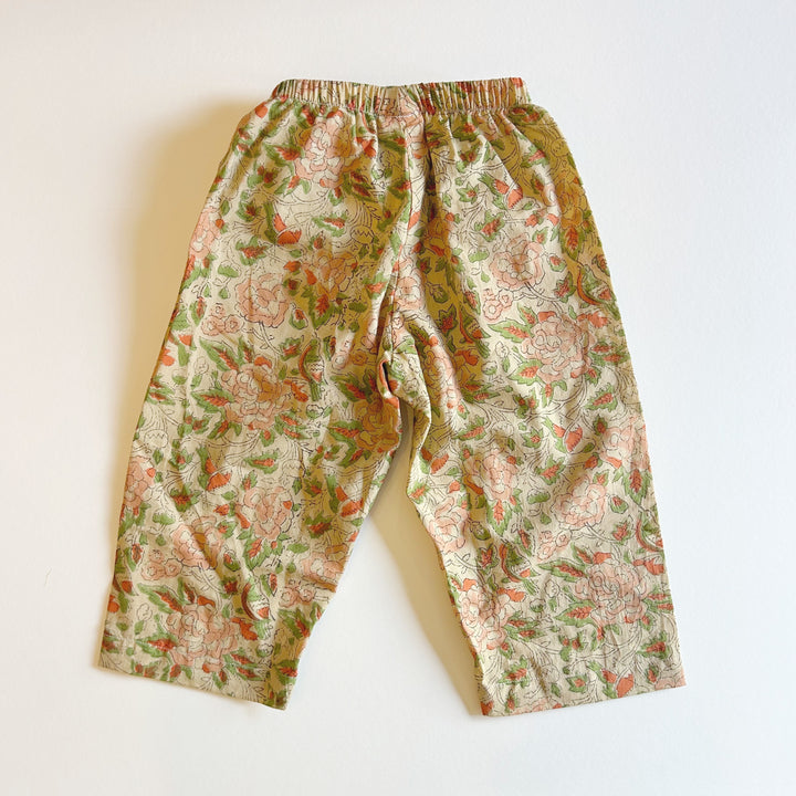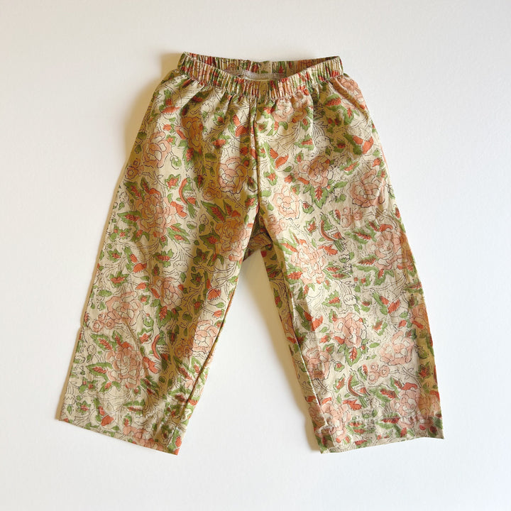 Designed to catch the wind. The Home Brand Hill Pant has quickly become a closet staple and acts as an everything pant.  Its unisex cut is easy and comfortable. The Hill Pant can be worn as elevated lounge wear supporting the deepest slumbers to everyday play. And fancy enough to dual as non fussy party attire.  Wide legged and slightly cropped made from hand block print lightweight cotton these pants pack tight for overnight travel and adventures.  We suggest purchasing according to your child’s true size and when in doubt size up.