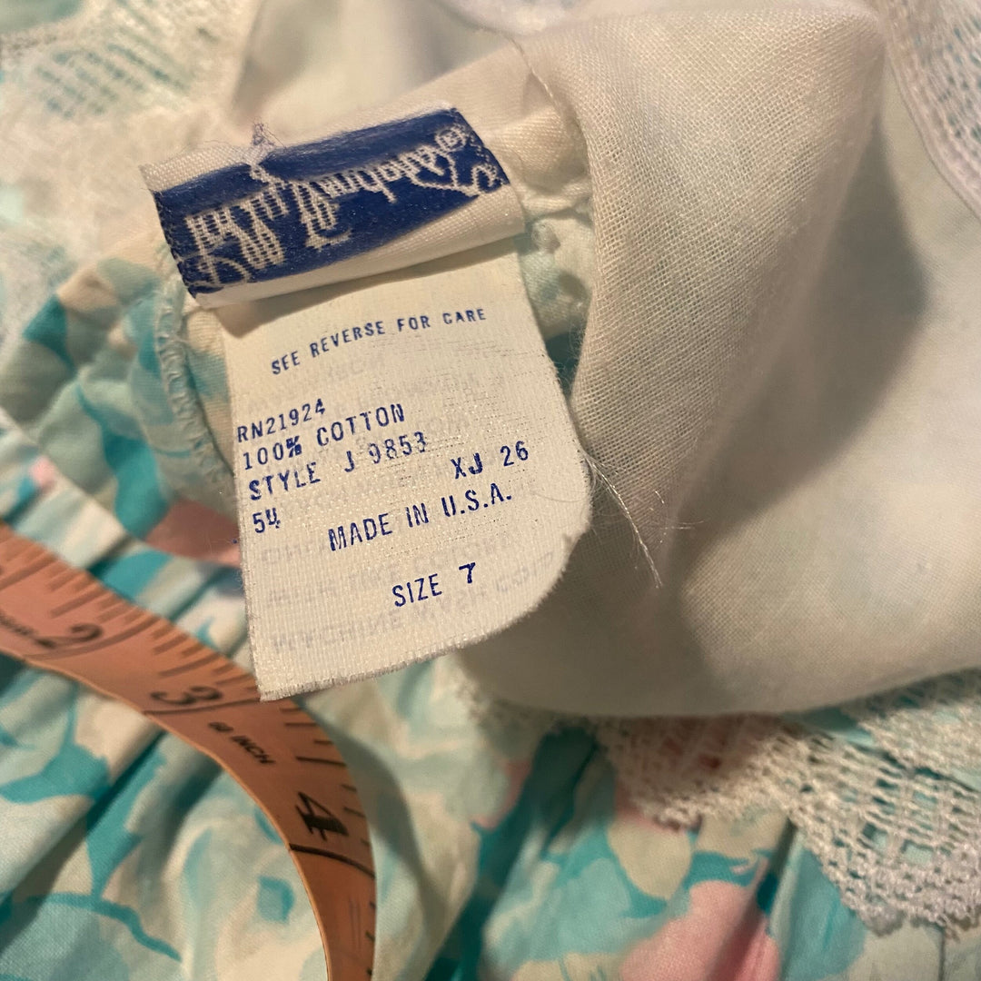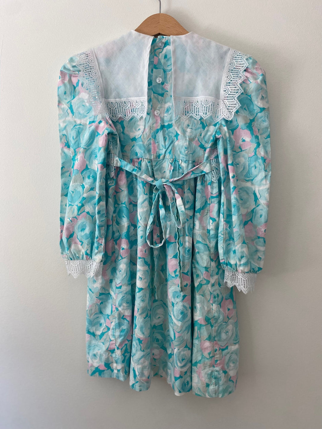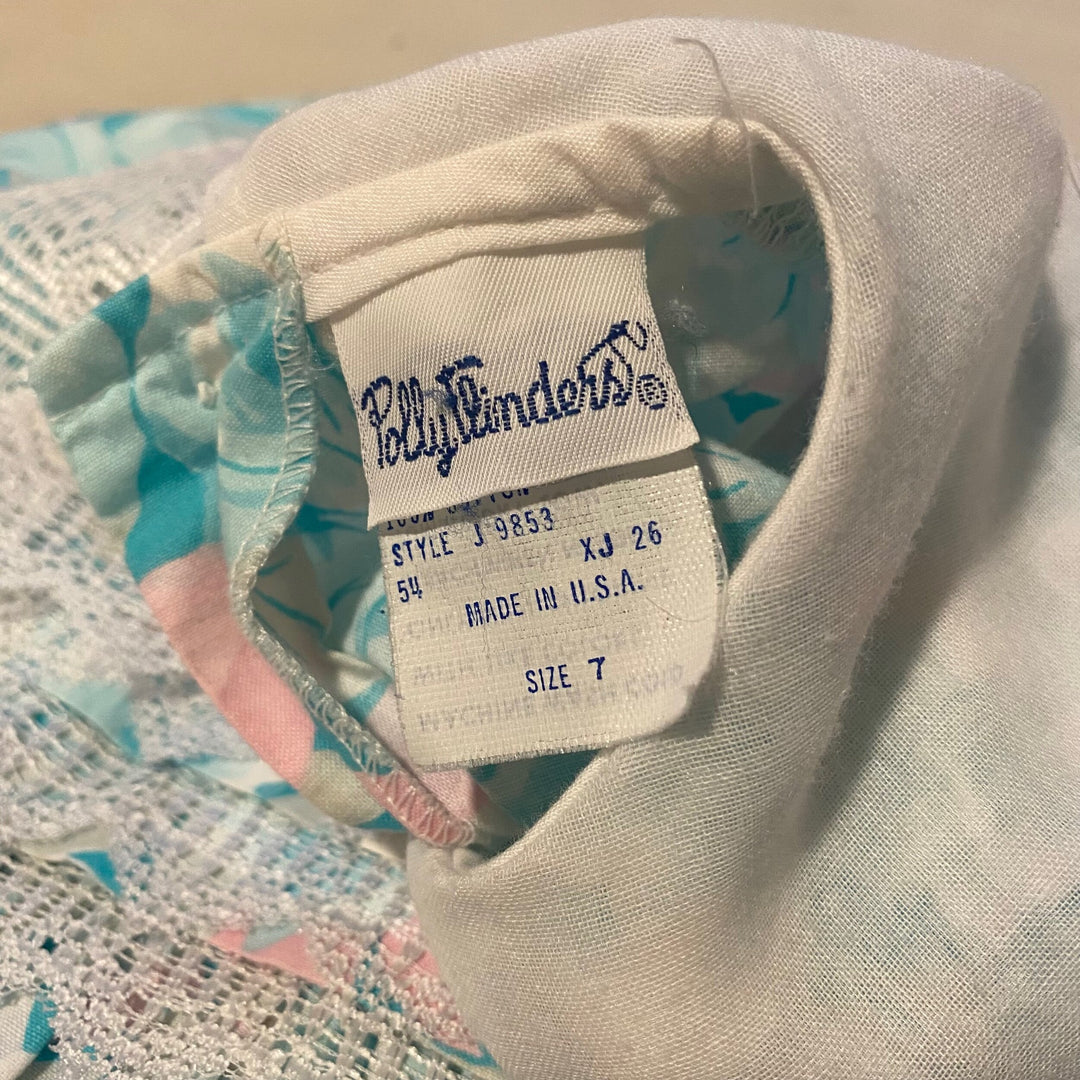 Polly Flinders dress. Light blue, white, and pink floral pattern with lace accents. Missing one button on the back (see image for detail). Otherwise, good vintage condition for some expected wear. Size 7 but please check measurements (27” length, 13” pit-to-pit). Made in USA.