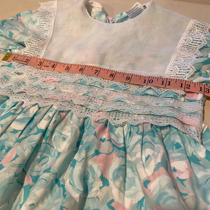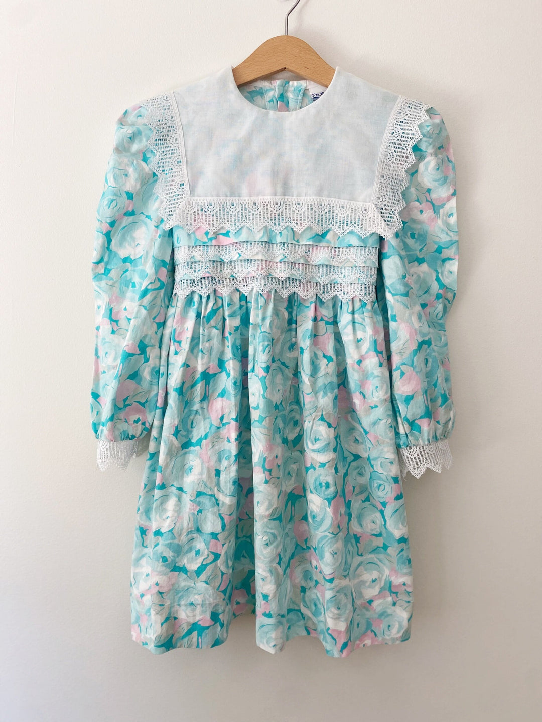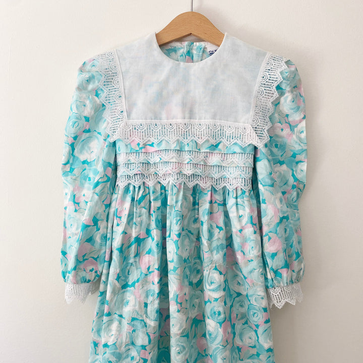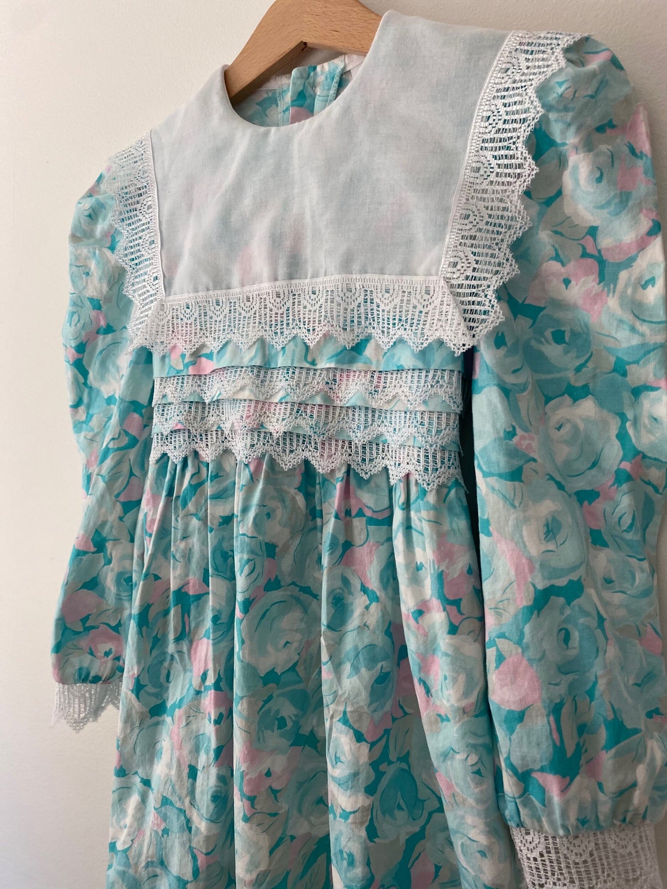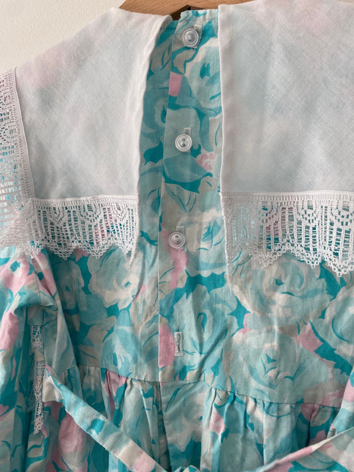 Polly Flinders dress. Light blue, white, and pink floral pattern with lace accents. Missing one button on the back (see image for detail). Otherwise, good vintage condition for some expected wear. Size 7 but please check measurements (27” length, 13” pit-to-pit). Made in USA.