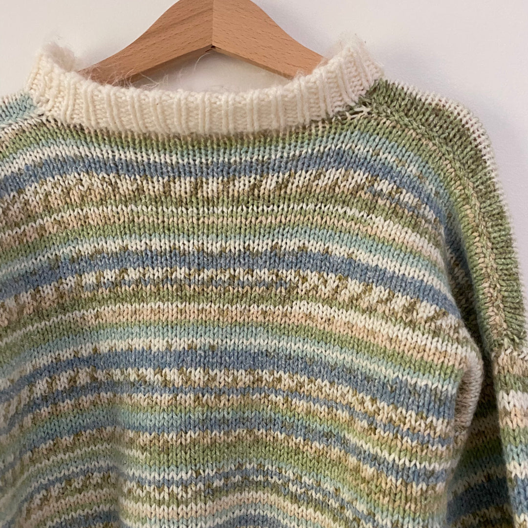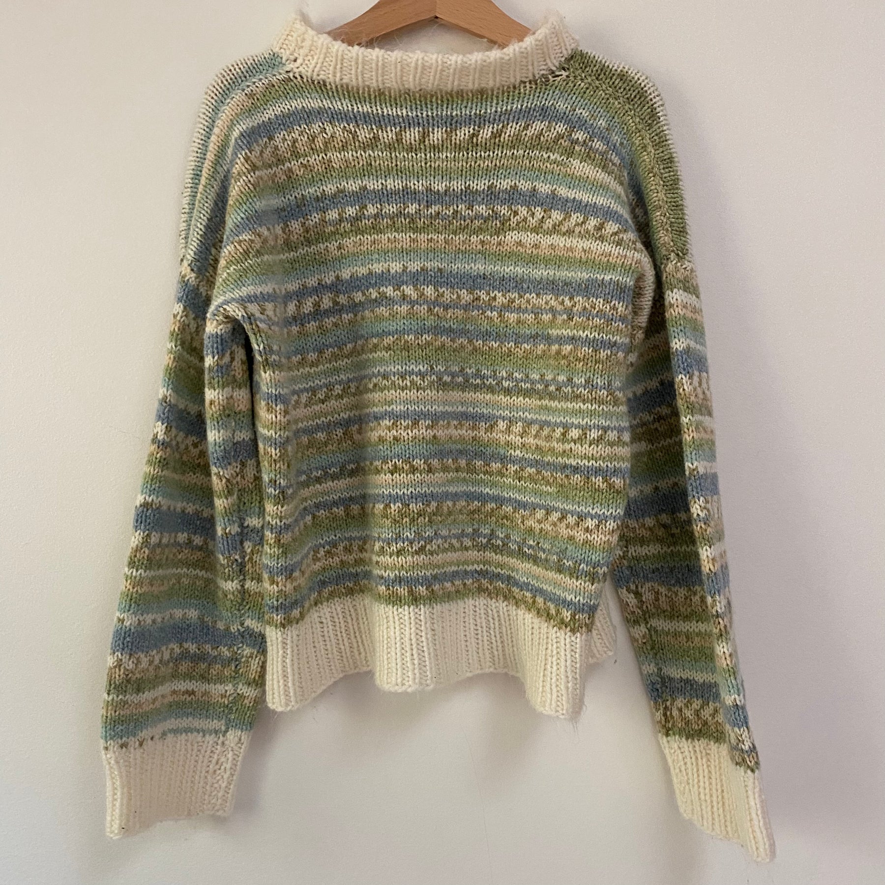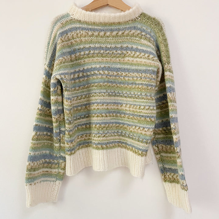 Knit acrylic sweater. No tag but roughly size 8/10-- please check measurements (16.5" length, 17" pit-to-pit). Good condition with some piling/wear.