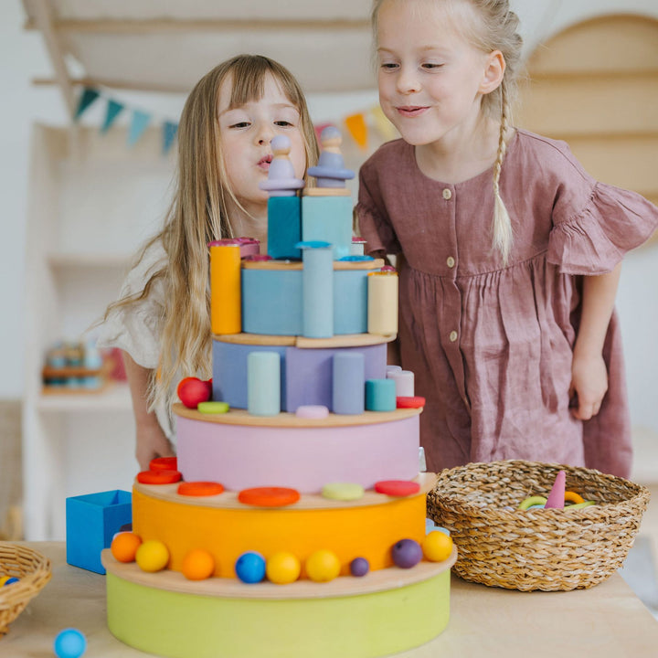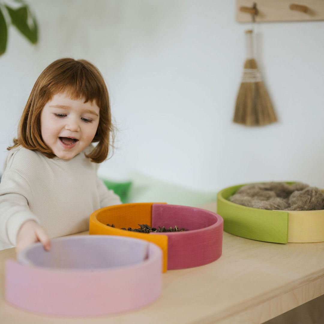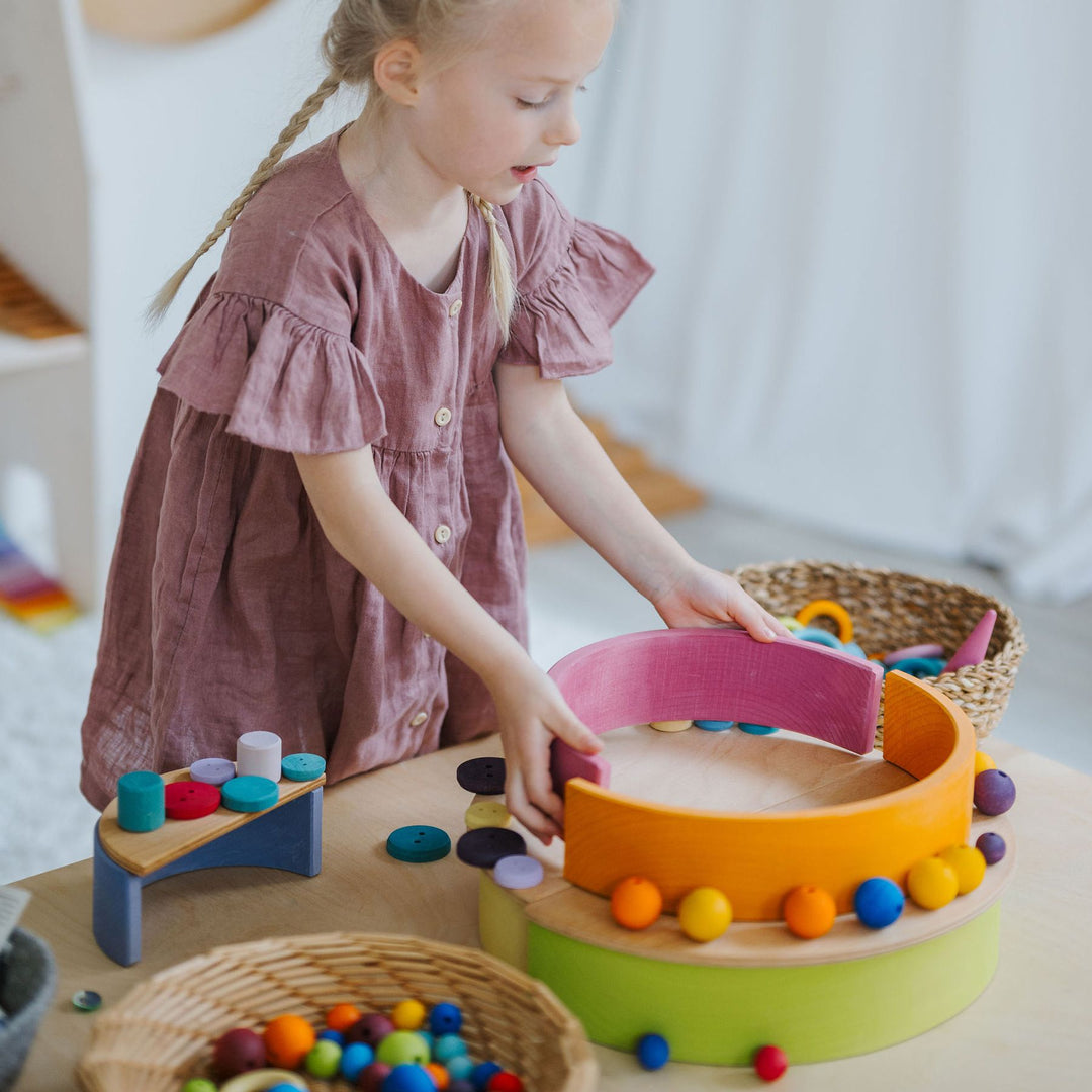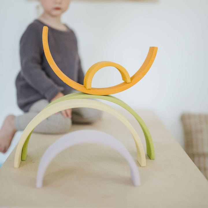 Parents' tip: To encourage free play, we recommend that you do not place the assembled Rainbow for play, but instead tip the individual arches wildly into a basket. This way, the pieces are seen more as building material and the image of the assembled rainbow does not impact the imagination for all the other play and building possibilities.