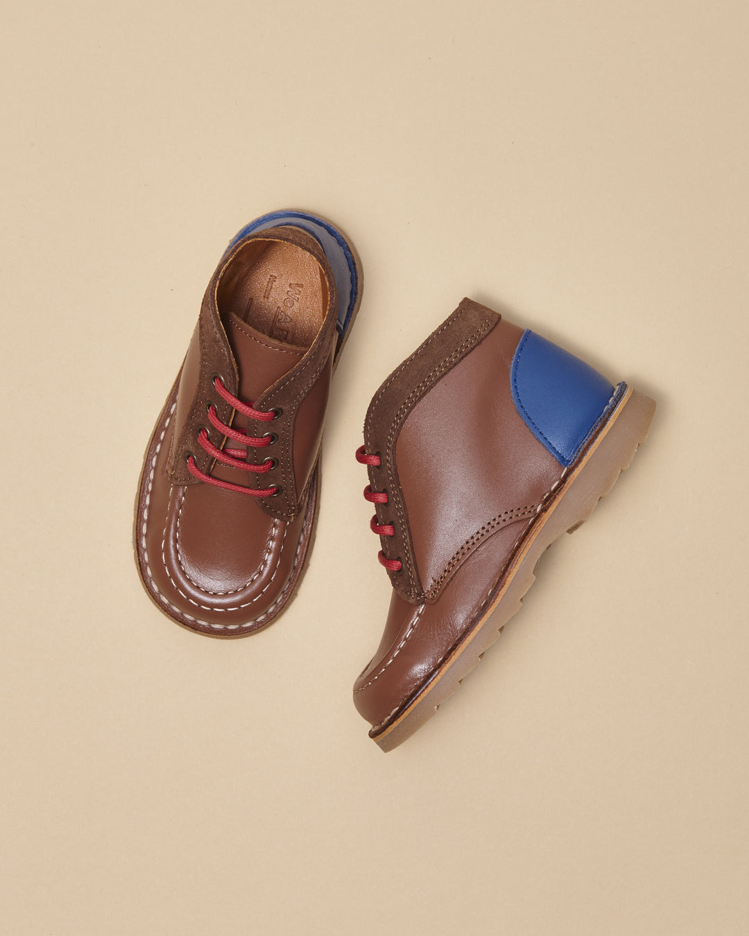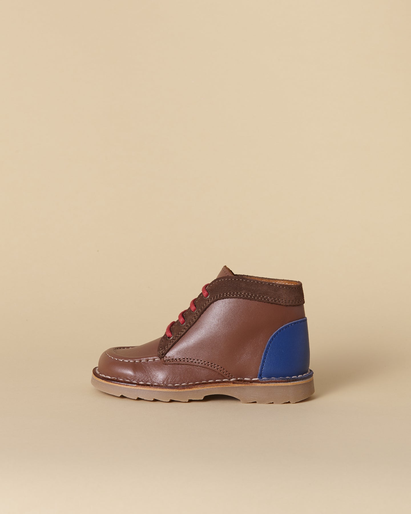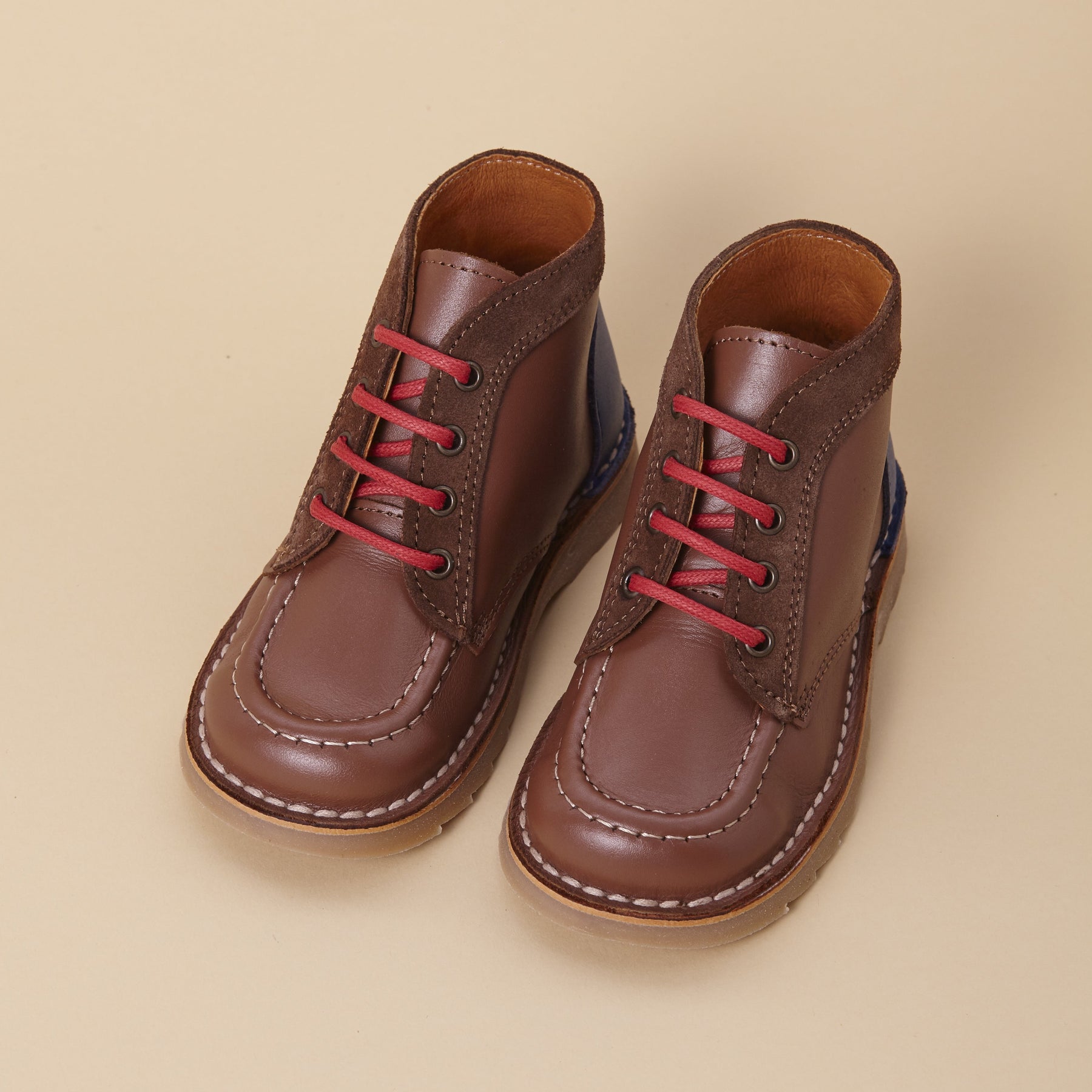 Ankle-high buffed nappa leather boots colorblocked in tan and navy. Deadstock from We A Family. Suede trim in brown at eyerows and collar. Square moc toe. Lace-up closure in red. Treaded crêpe rubber sole