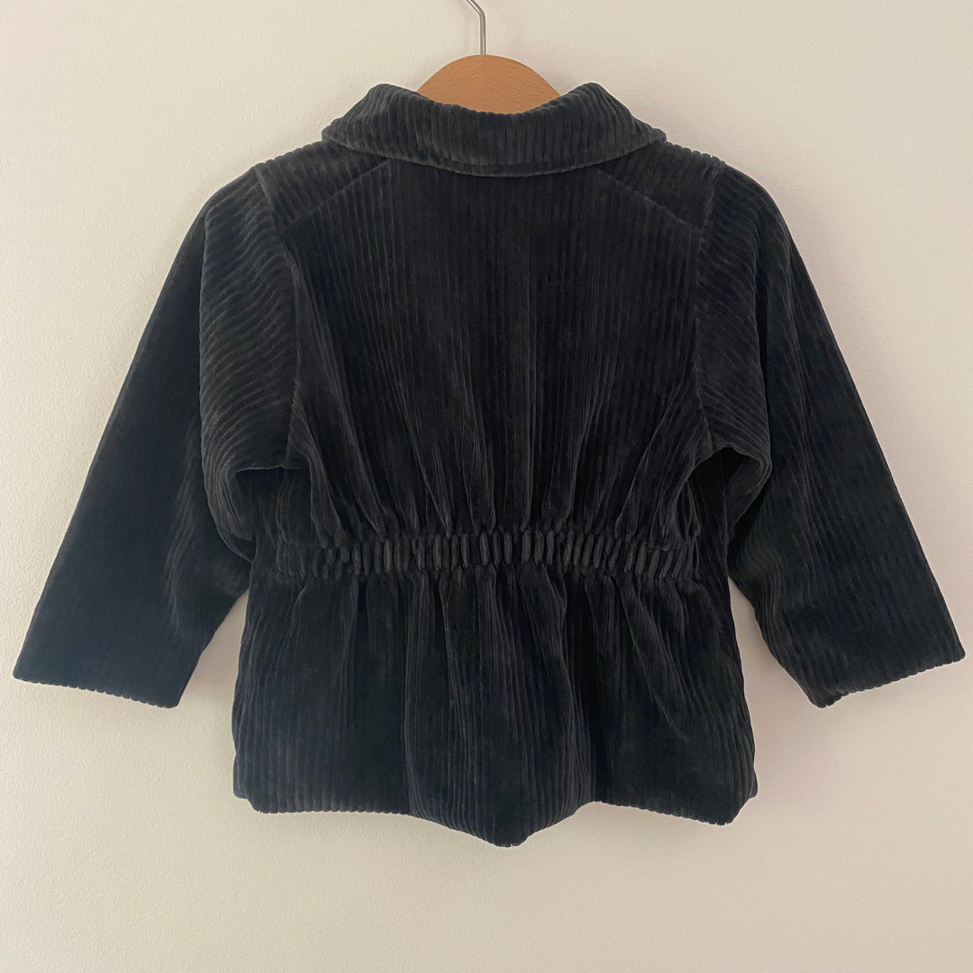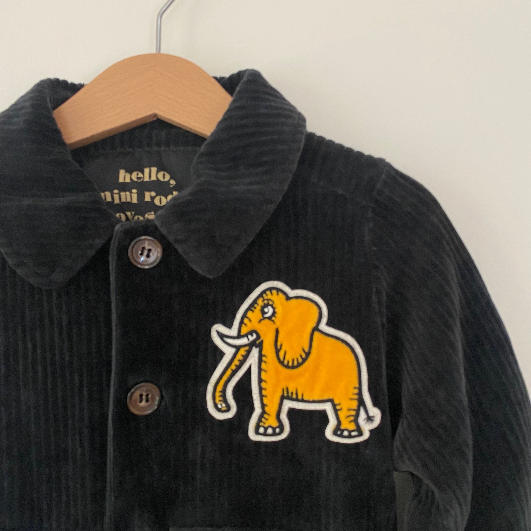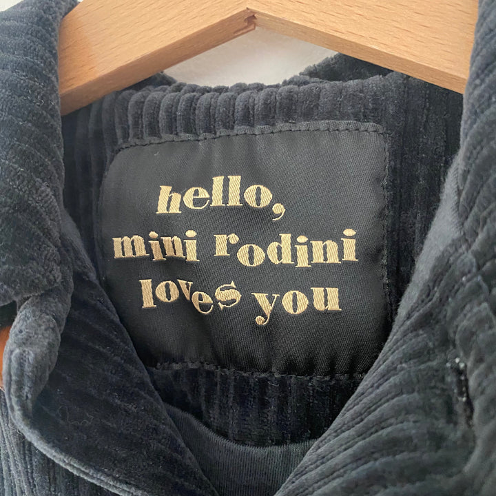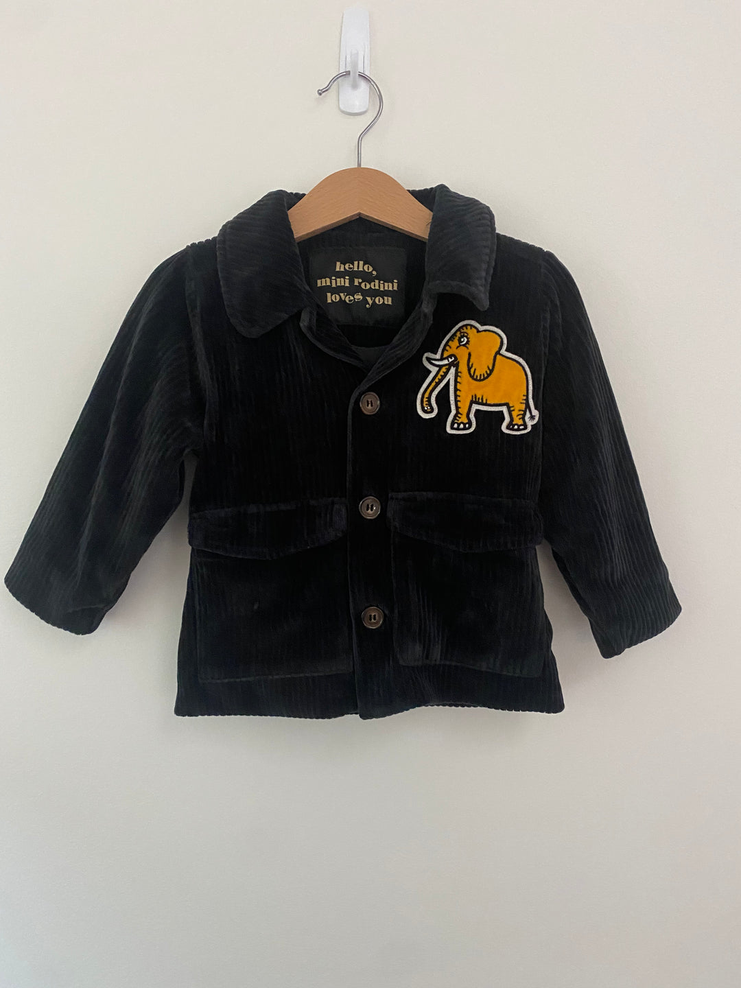Black corduroy jacket from Mini Rodini with Excellent Elephants patch. Size 2/3 but feels more like a 2 -- please check measurements (15" length, 12" pit-to-pit). Good used condition for light wash wear. Made in Portugal.