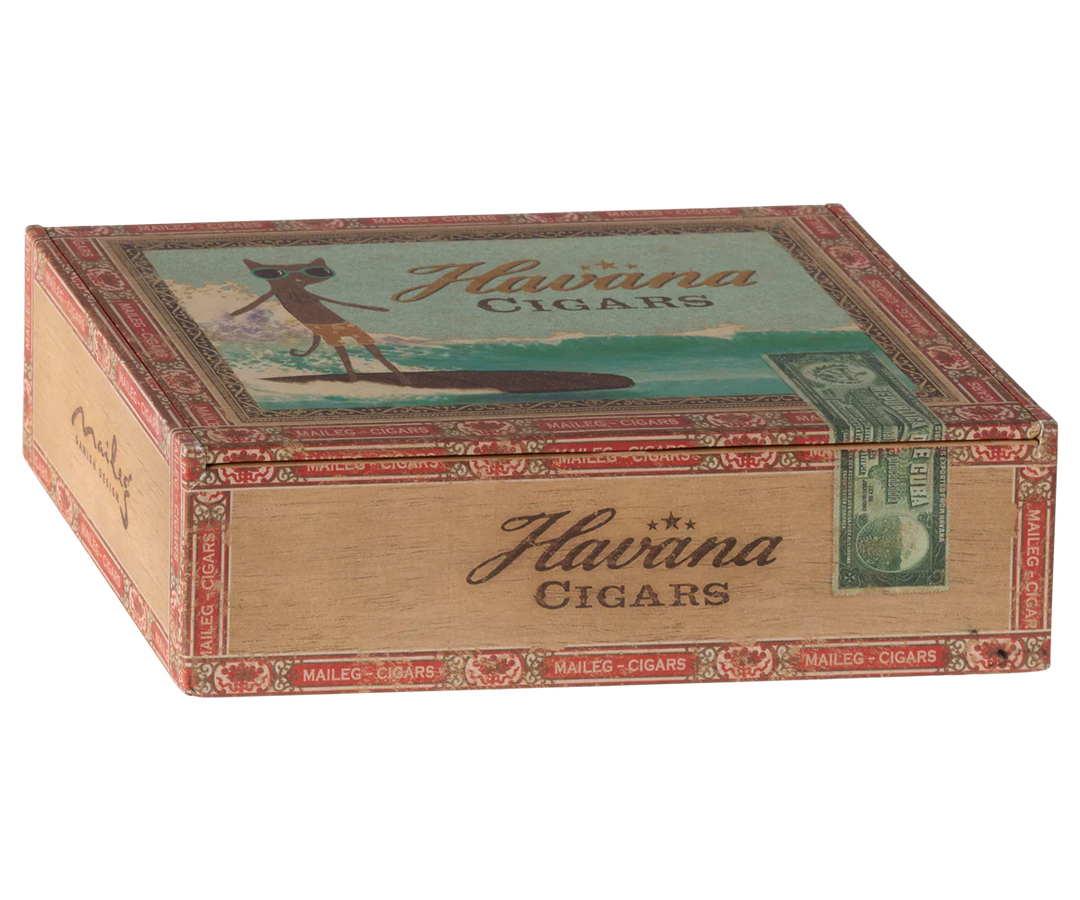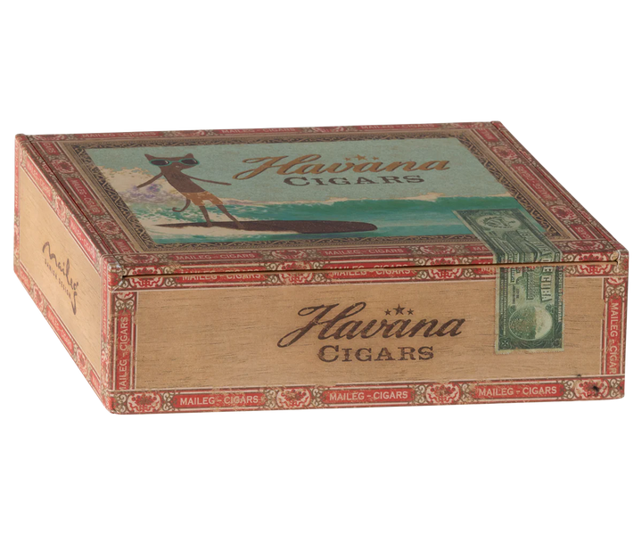 A classic Maileg item. Mum and Dad mice are wearing their beautiful nightwear and eye masks. The cigar box is a perfect bed for a good night’s sleep and sweet dreams. Bed linen may vary in color.